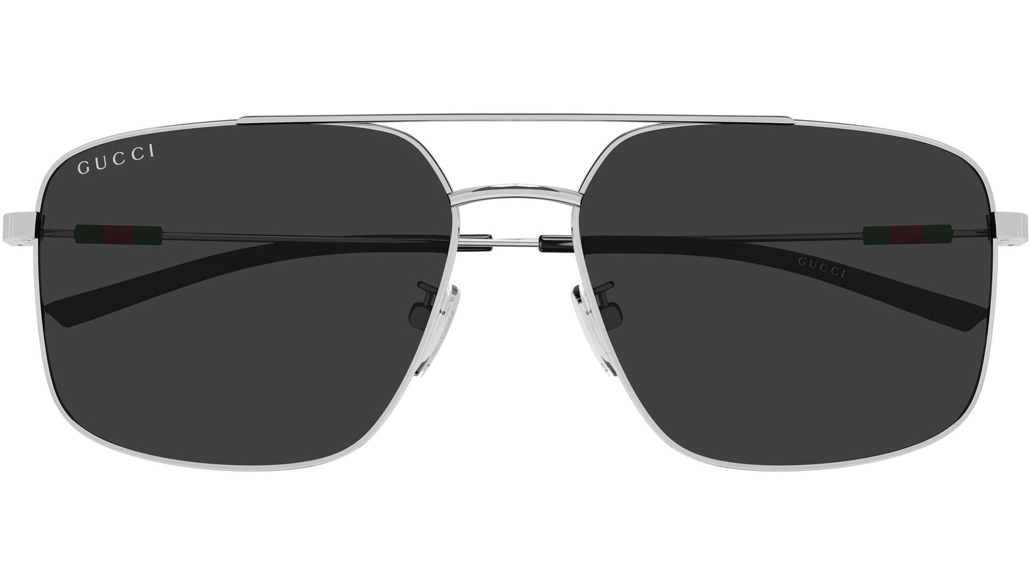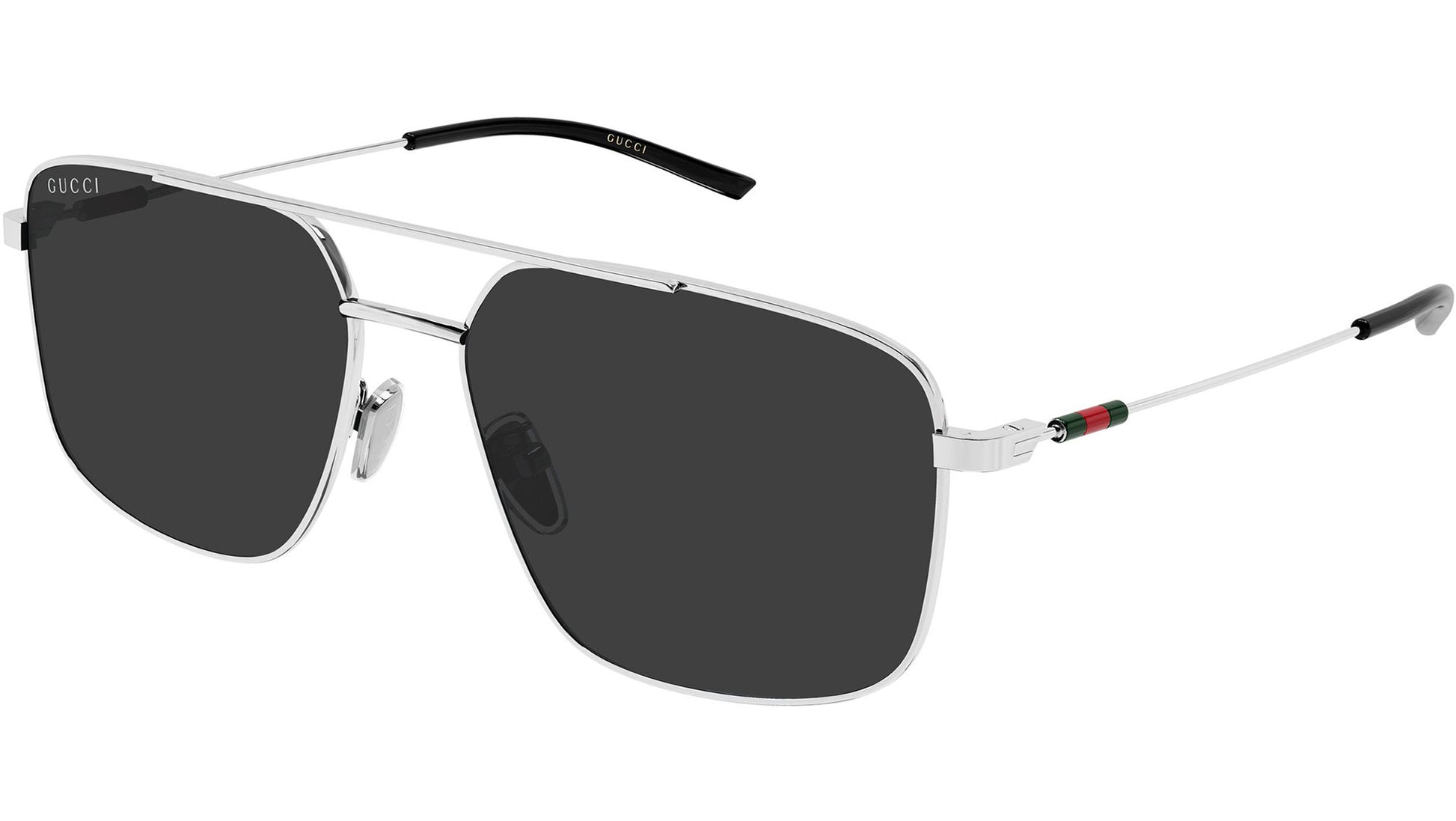 Gucci GG2096SA 001 sunglasses for men, featuring shiny silver rectangular metal frame and solid grey bio nylon lenses. Brand line: Sign. Style code: GG2096SA. Color code: 001. Made in Italy. Authorized Gucci online reseller. Your glasses will include the original case and accessories and are covered by a 12-month global warranty.