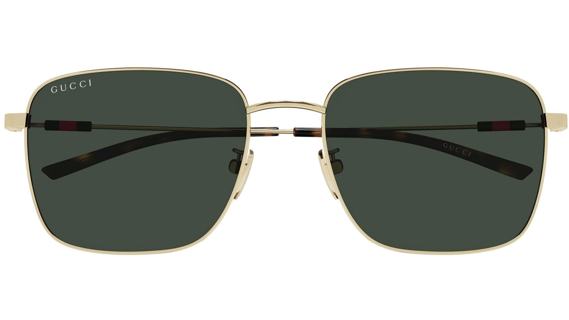 Gucci GG2097SK 002 sunglasses for men, featuring shiny endura gold rectangular metal frame and solid dark green bio nylon lenses. Brand line: Sign. Style code: GG2097SK. Color code: 002. Made in Italy. Authorized Gucci online reseller. Your glasses will include the original case and accessories and are covered by a 12-month global warranty.