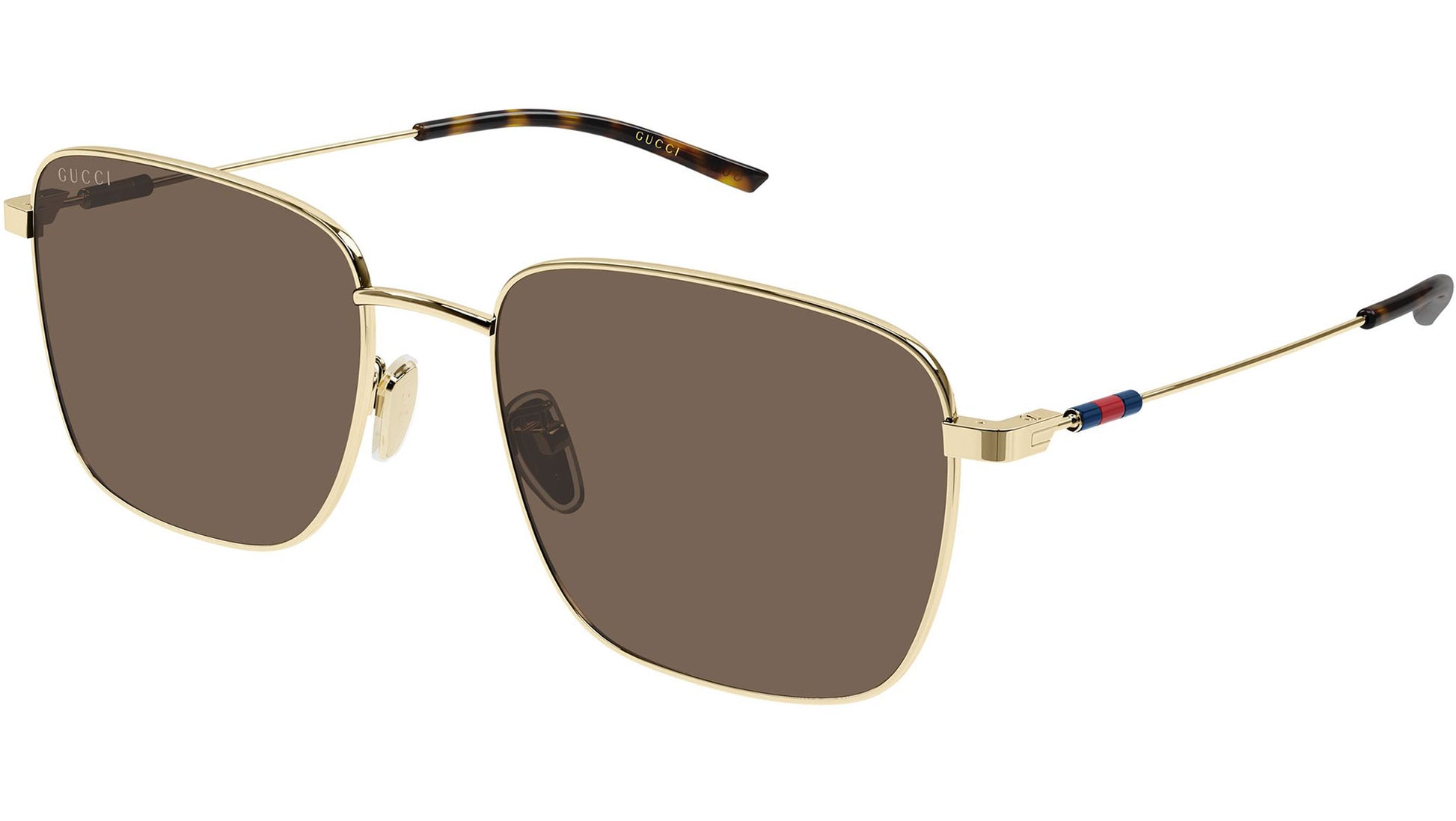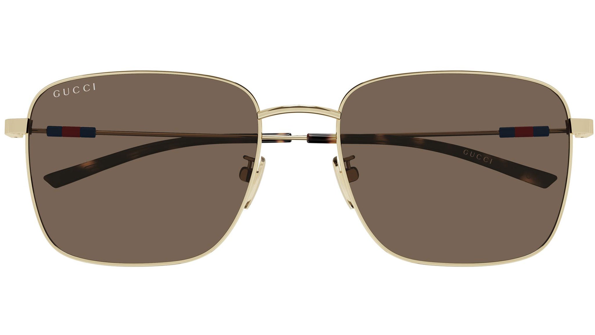 Gucci GG2097SK 004 sunglasses for men, featuring shiny endura gold rectangular metal frame and solid brown bio nylon lenses. Brand line: Sign. Style code: GG2097SK. Color code: 004. Made in Italy. Authorized Gucci online reseller. Your glasses will include the original case and accessories and are covered by a 12-month global warranty.