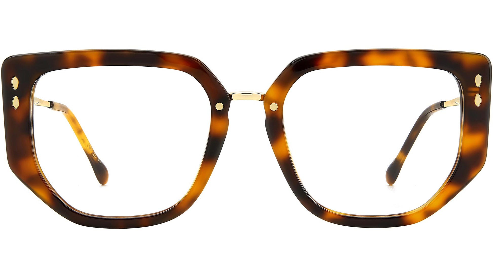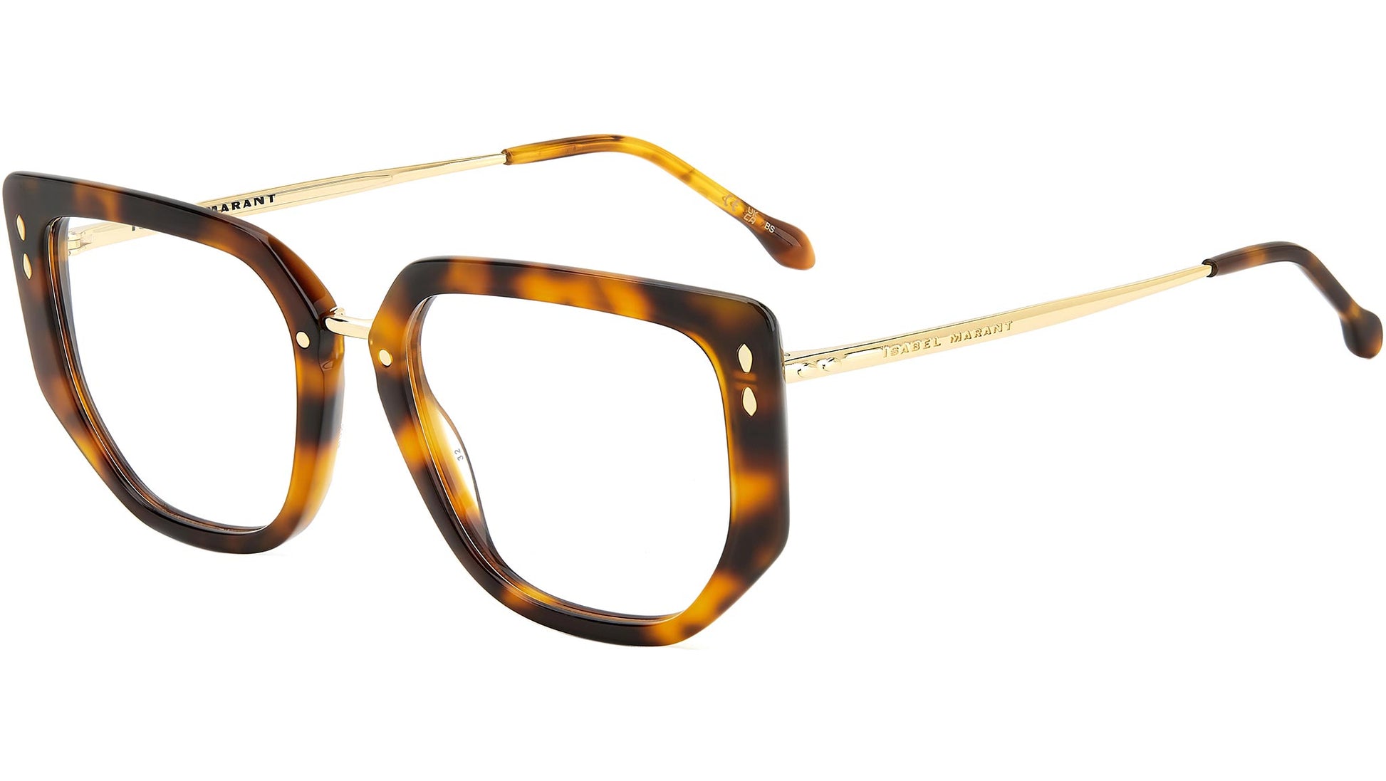Isabel Marant IM 0148 2IK havana gold acetate geometric Optical Frame. Riding the retro-chic wave, the Luck eyewear collection by Isabel Marant oozes '70s charm with statement lines and glamorous allure. These optical glasses flaunt an ultra-feminine geometric front, crafted from acetate in a selection of refined hues. Styled with a slim metal nose bridge and temples, they feature leaf-shaped trims and contoured tips in celebration of the brand’s signature motif. Lasered logo lettering on the left temple adds an exclusive touch.