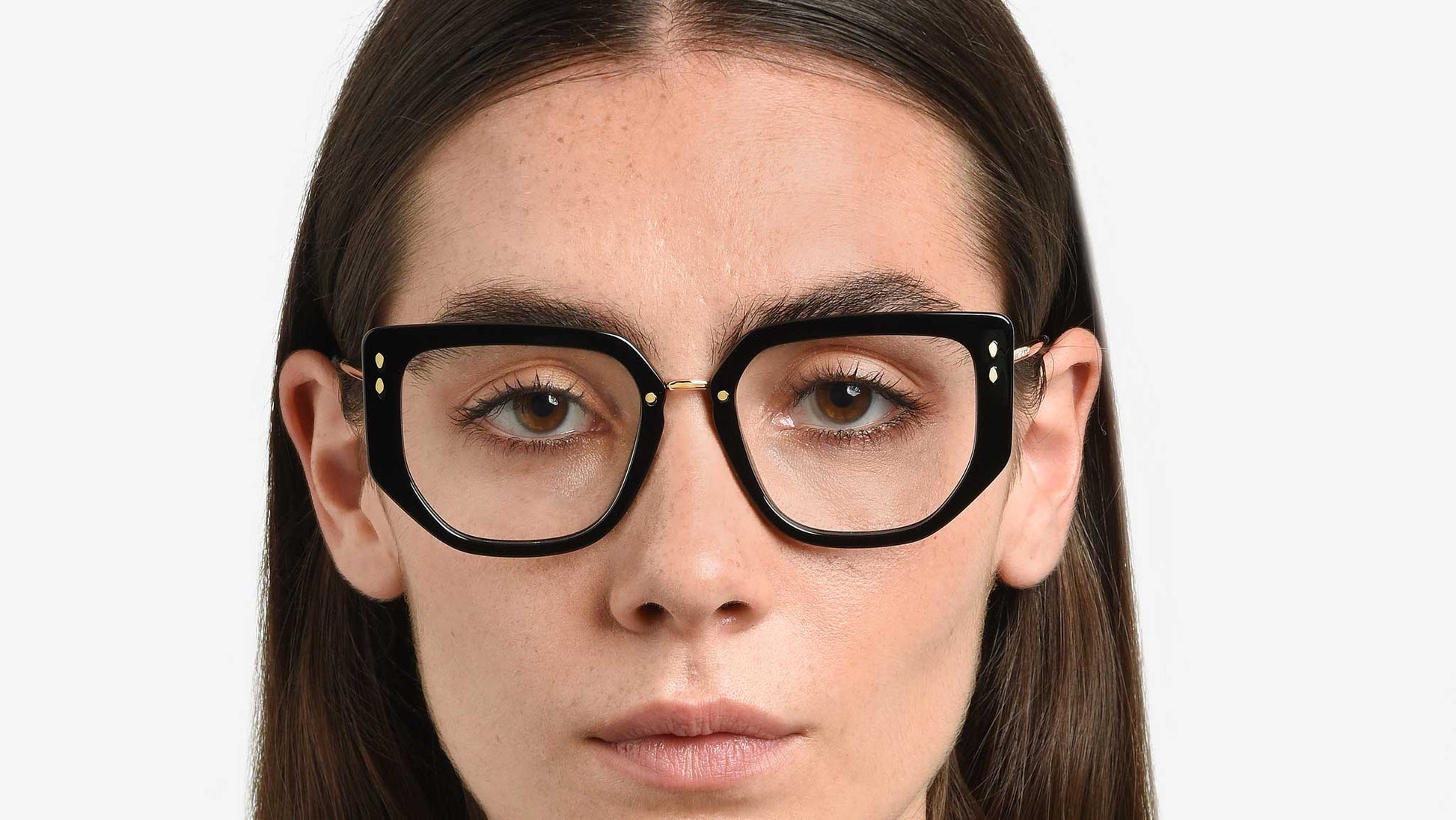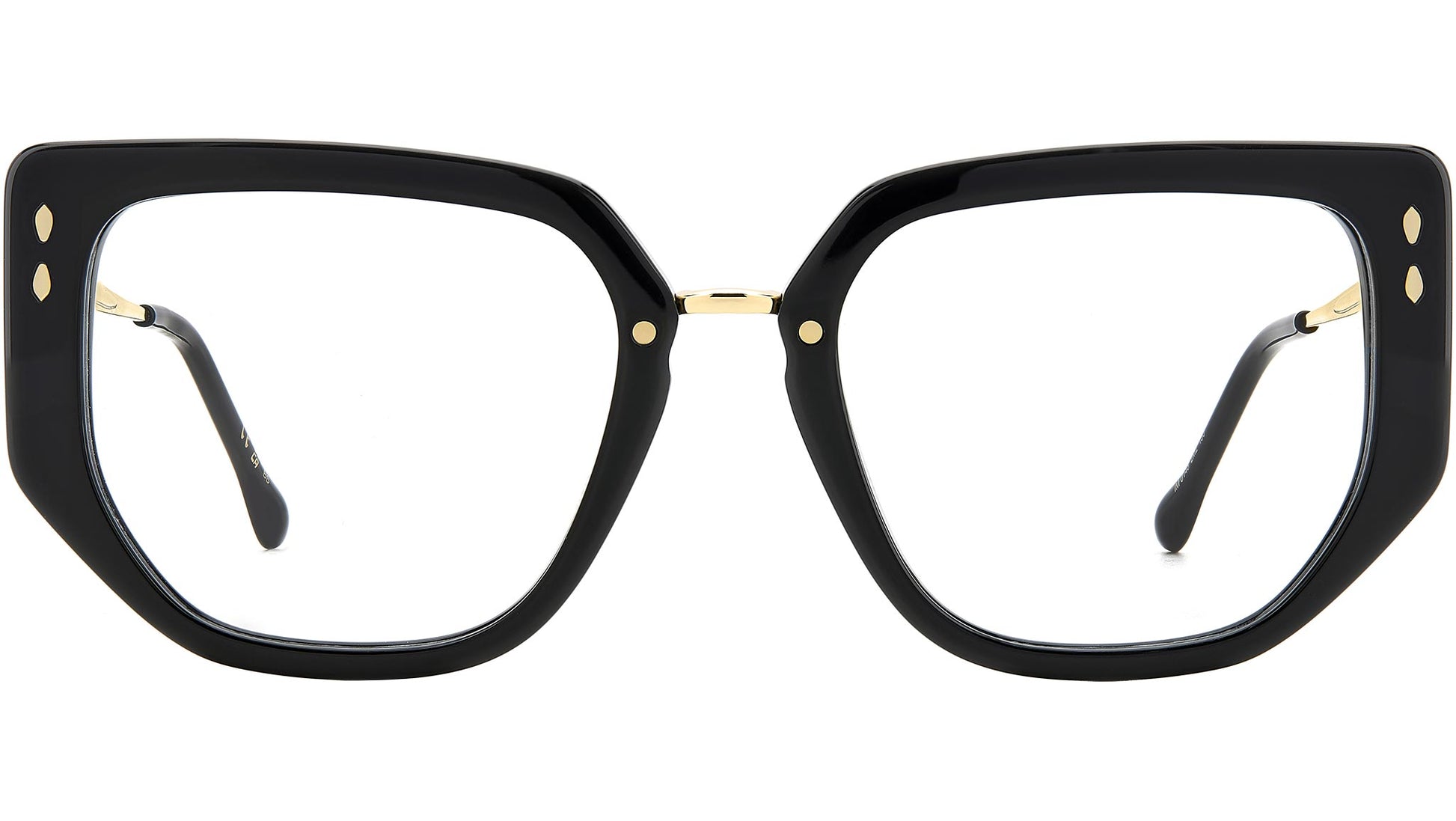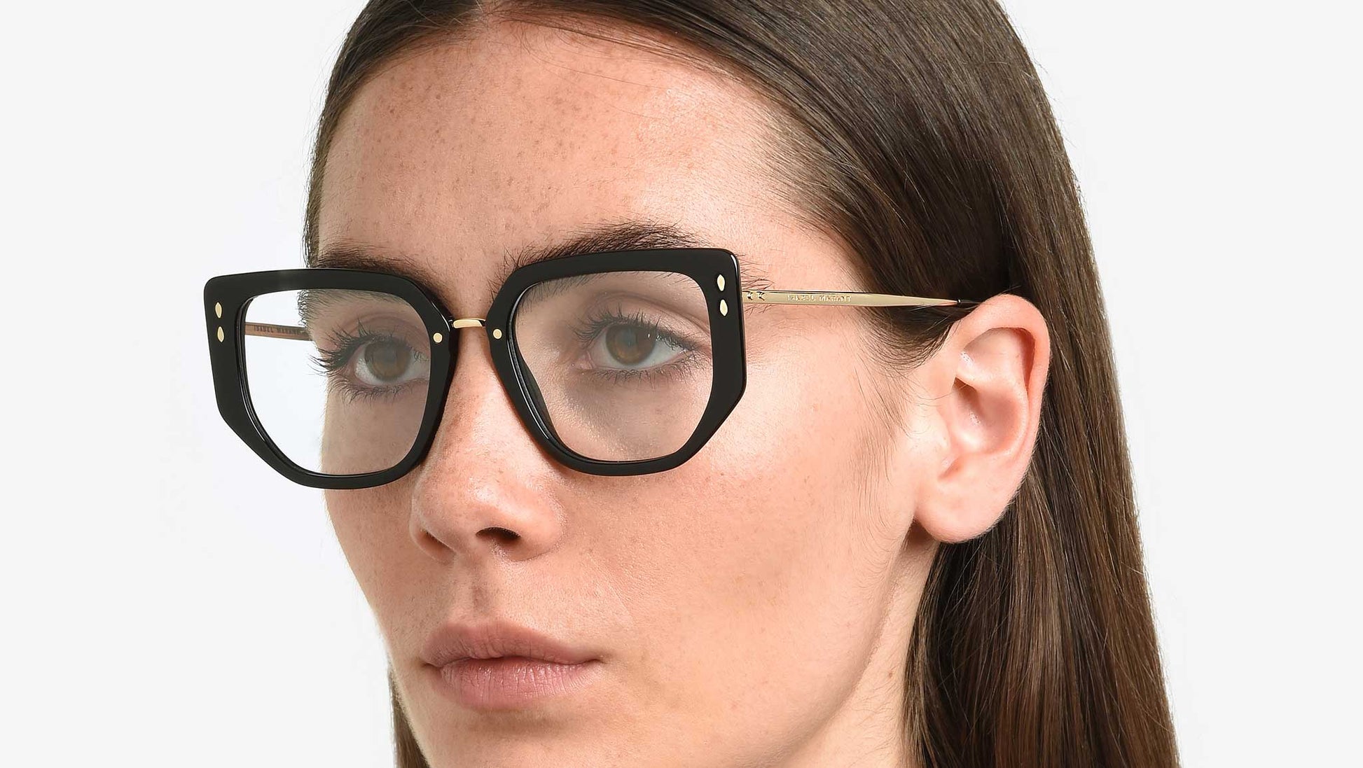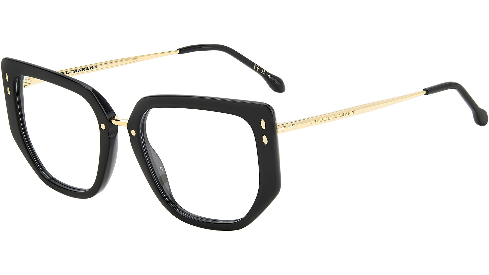 Isabel Marant IM 0148 2M2 black gold acetate geometric Optical Frame. Riding the retro-chic wave, the Luck eyewear collection by Isabel Marant oozes '70s charm with statement lines and glamorous allure. These optical glasses flaunt an ultra-feminine geometric front, crafted from acetate in a selection of refined hues. Styled with a slim metal nose bridge and temples, they feature leaf-shaped trims and contoured tips in celebration of the brand’s signature motif. Lasered logo lettering on the left temple adds an exclusive touch.