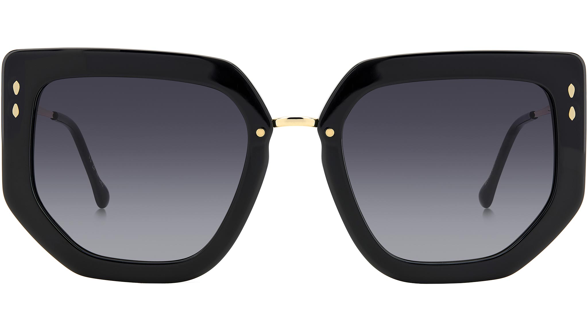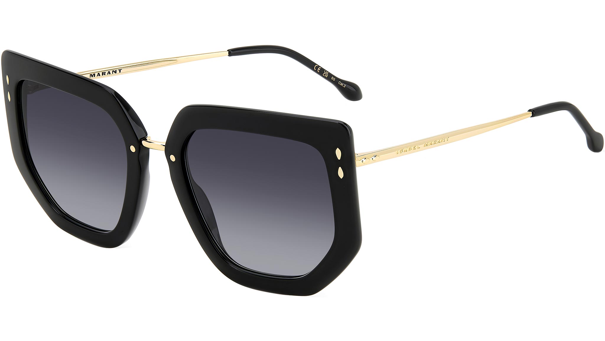 Isabel Marant IM 0149/S 2M2 9O black gold acetate butterfly Sunglasses. Riding the retro-chic wave, the Luck eyewear collection by Isabel Marant oozes '70s charm with statement lines and glamorous allure. These sunglasses flaunt an ultra-feminine geometric front, crafted from acetate in fashionable yet versatile colourways. Featuring a sleek metal nose bridge and temples, they're elevated with leaf-shaped trims and contoured tips in celebration of the brand’s signature motif. Finished with lasered logo lettering on the left temple for an exclusive touch.