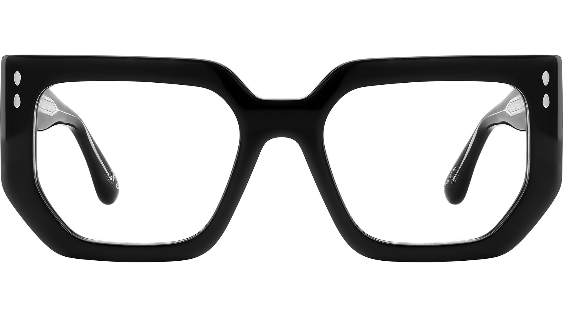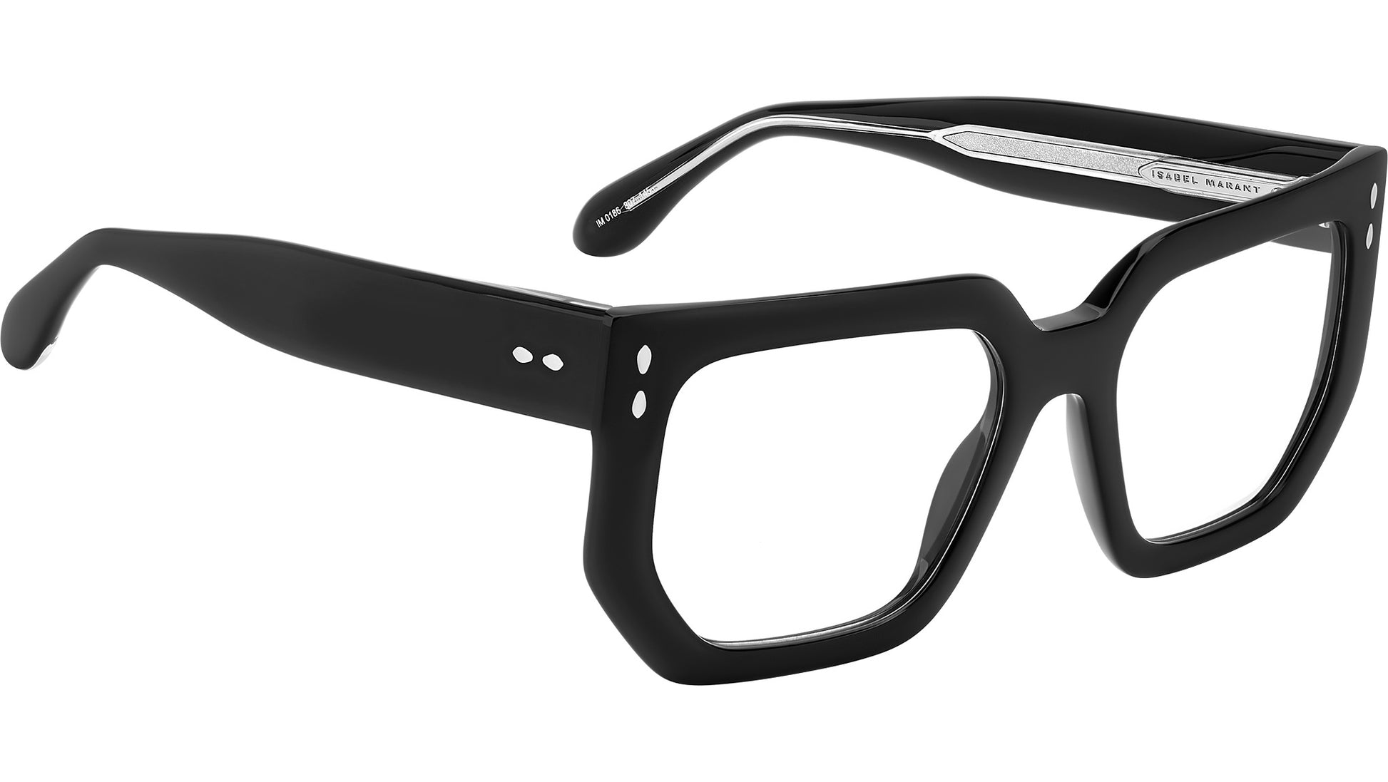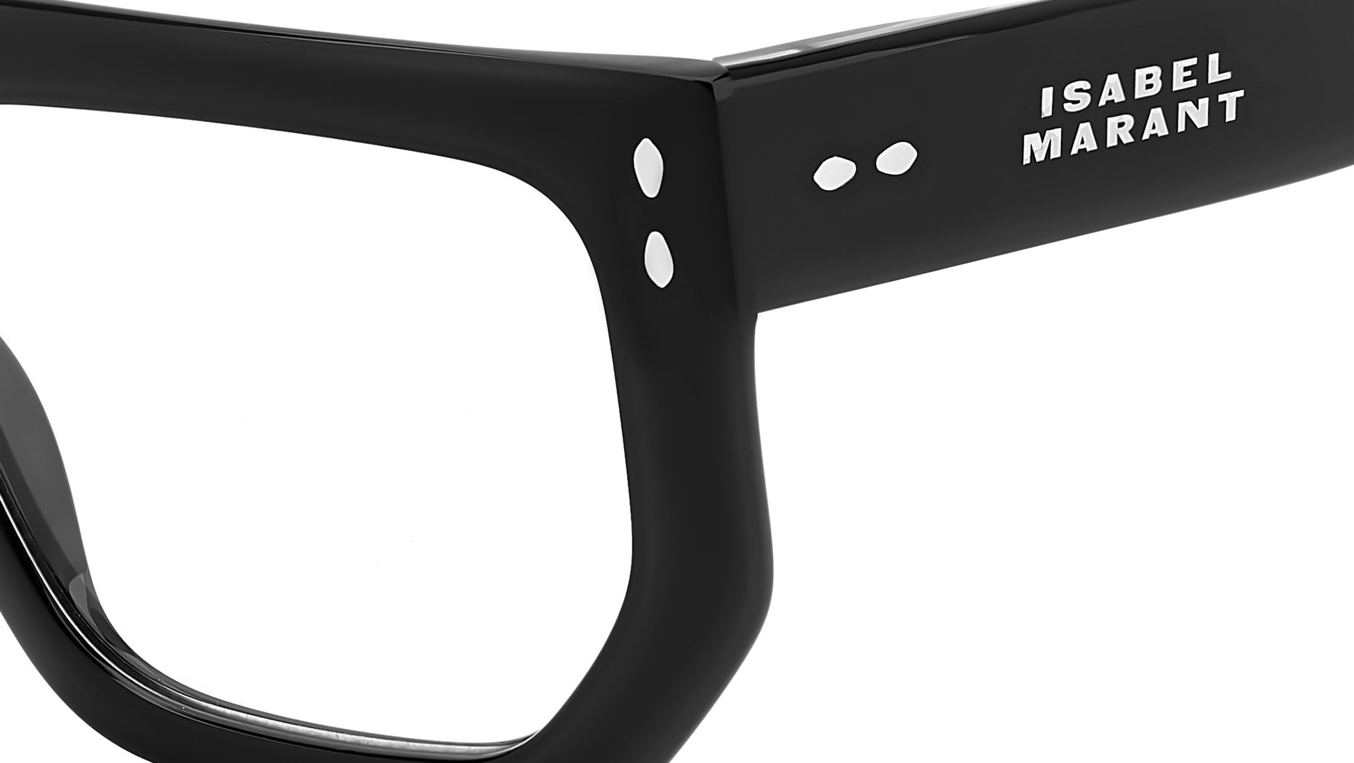 Isabel Marant IM 0186 807 glasses for women, featuring black rectangular acetate frame and demo lenses. Strike a pose: Isabel Marant’s "The New" eyewear line comprises a range of ultra-glamorous styles that speak the iconic brand's powerful yet easy-going stylistic language. Bold and lightweight in equal parts, these acetate optical glasses flaunt a statement geometric silhouette with logo details on the hinge and temple. Enriched with shaped tips and metal rivets that pay homage to Isabel Marant's signature leaf detail. Brand line: The New. Style code: 108955. Color code: 807. Authorized Isabel Marant online reseller. Your glasses will include the original case and accessories and are covered by a 12-month global warranty.
