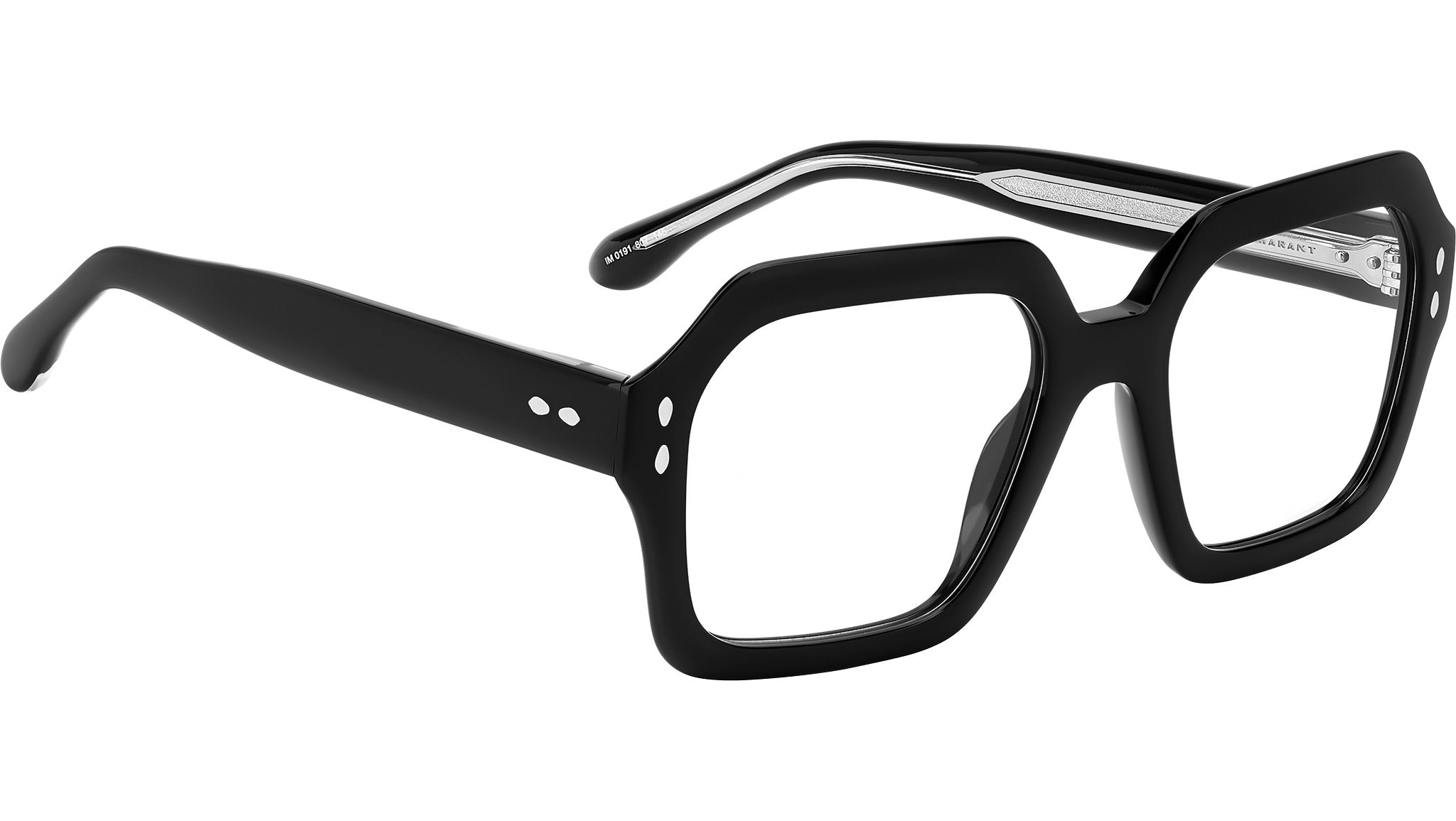 Isabel Marant IM 0191 807 glasses for women, featuring black rectangular acetate frame and demo lenses. A statement look with a lightweight feel: discover Isabel Marant's "The New" eyewear edit, presenting ultra-flat fronts with bevelled edges in empowering silhouettes, dedicated to the modern woman seeking effortless glamour. A geometric take on a rectangular shape, these acetate optical glasses span a selection of neutral yet ultra-refined colourways. Logo lettering adorns the outer temple and inner hinge, whilst leaf-shaped tips and rivets celebrate the brand's hallmark motif. Brand line: The New. Style code: 108911. Color code: 807. Authorized Isabel Marant online reseller. Your glasses will include the original case and accessories and are covered by a 12-month global warranty.