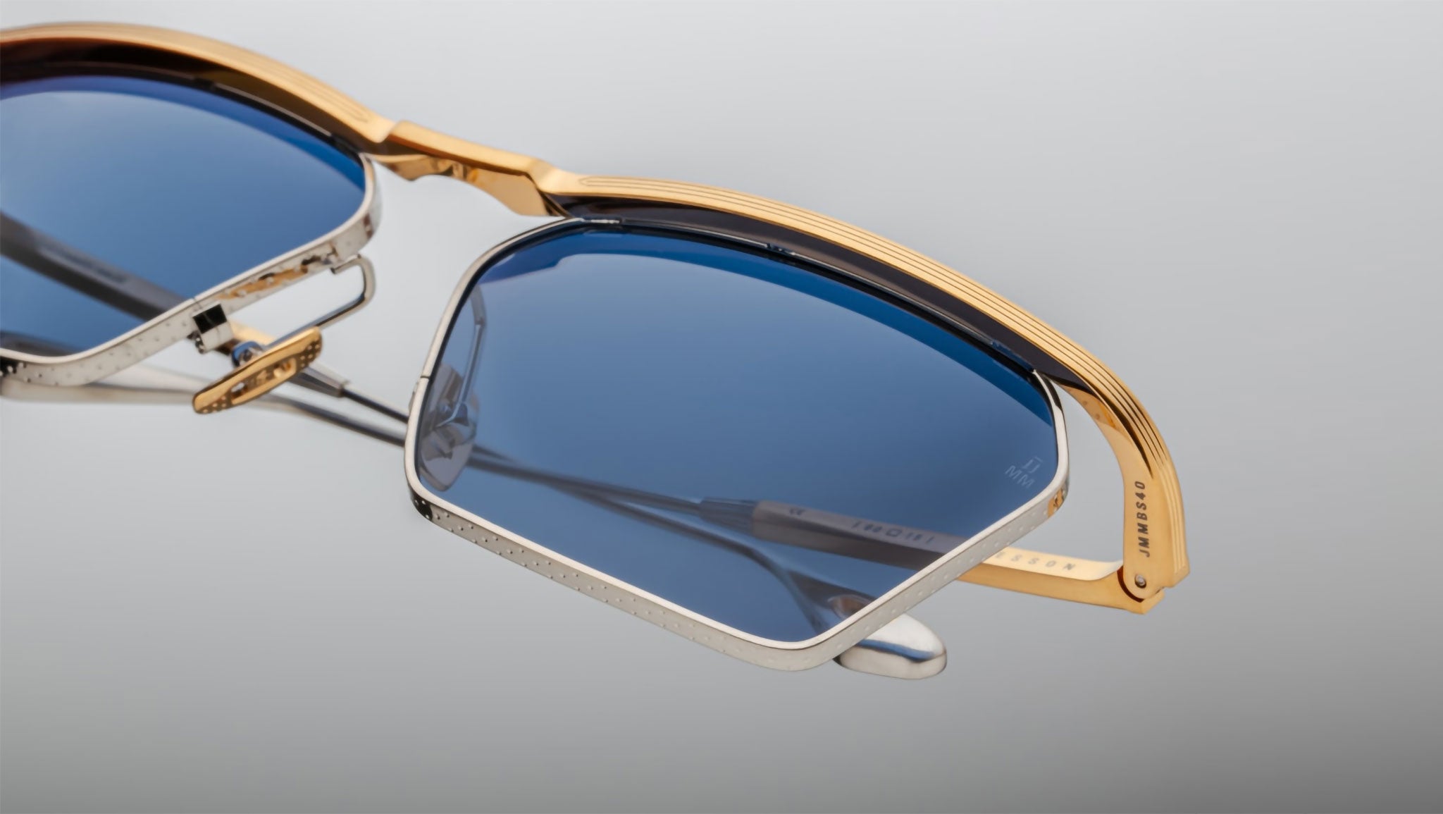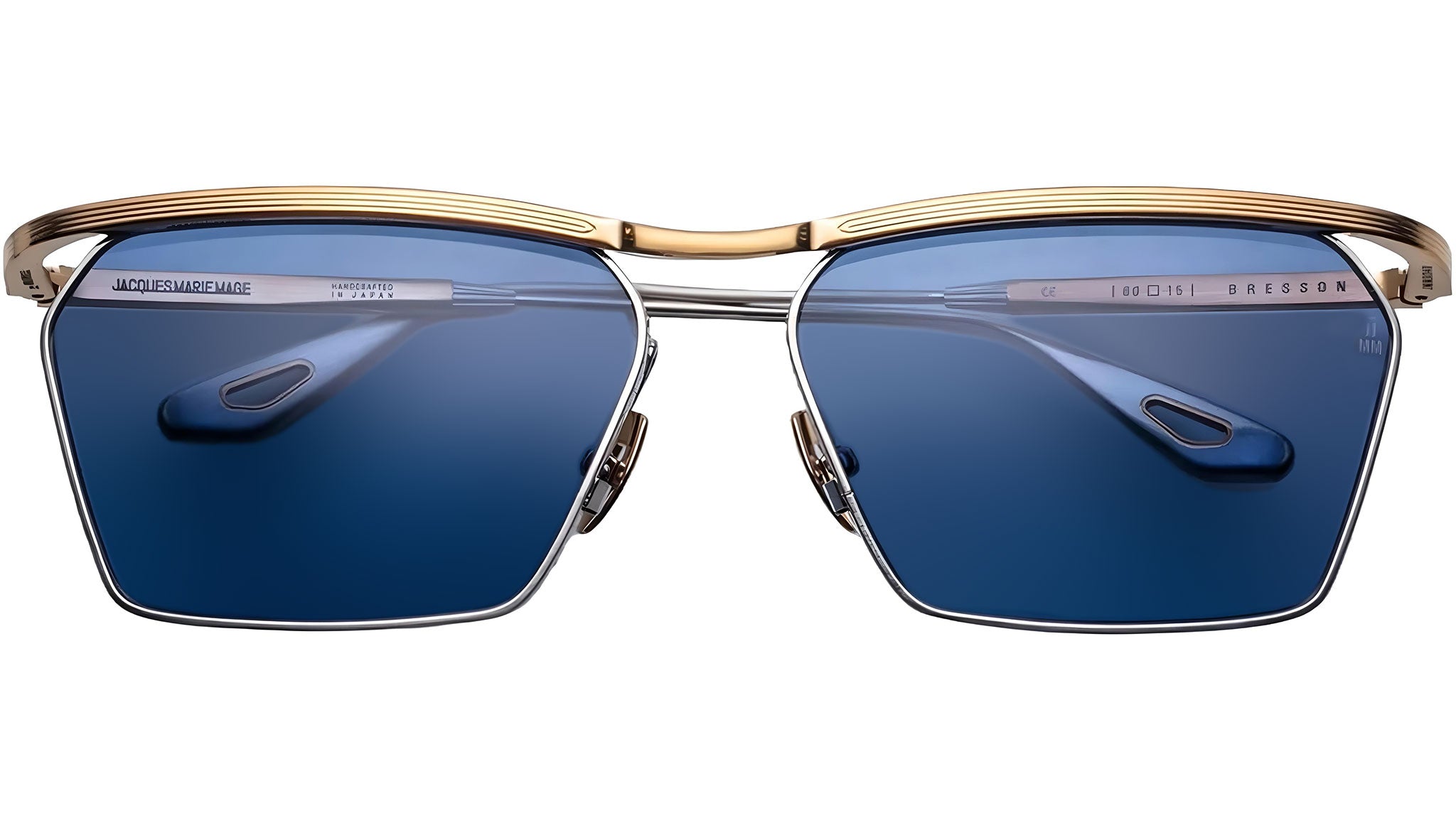Dark gold 100% beta titanium frame with silver accents and blue lenses. Features dark gold and silver titanium temples with eyelet wing tips, a dark gold tension-secured custom monoblock hinge, and custom nose pads with logo and hairline engraving. Sky CR-39 6 base lenses with backside anti-reflective treatment ensure clarity and comfort. Frame shape: medium. Provides 100% UV protection. Frame total width: mm.