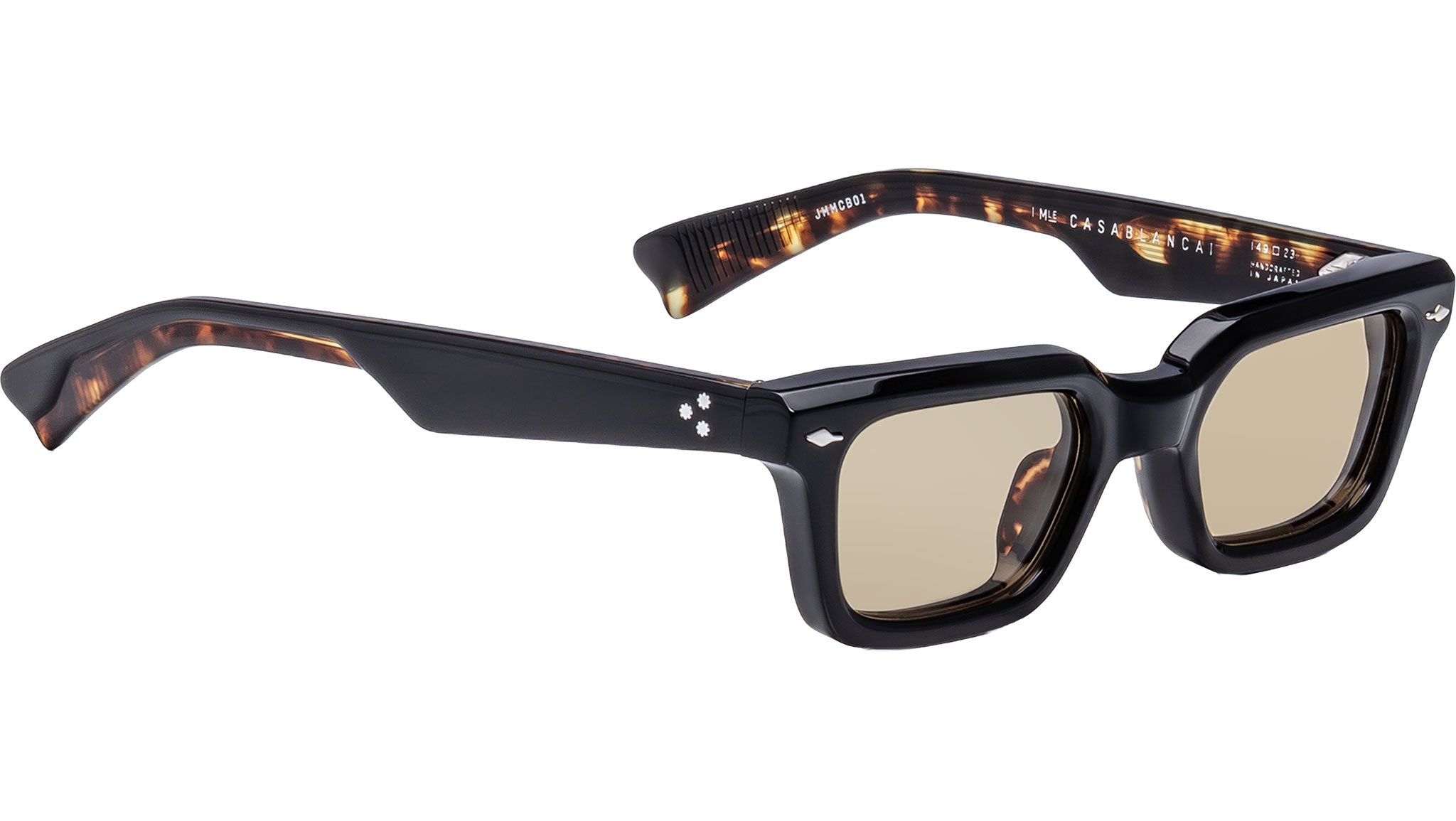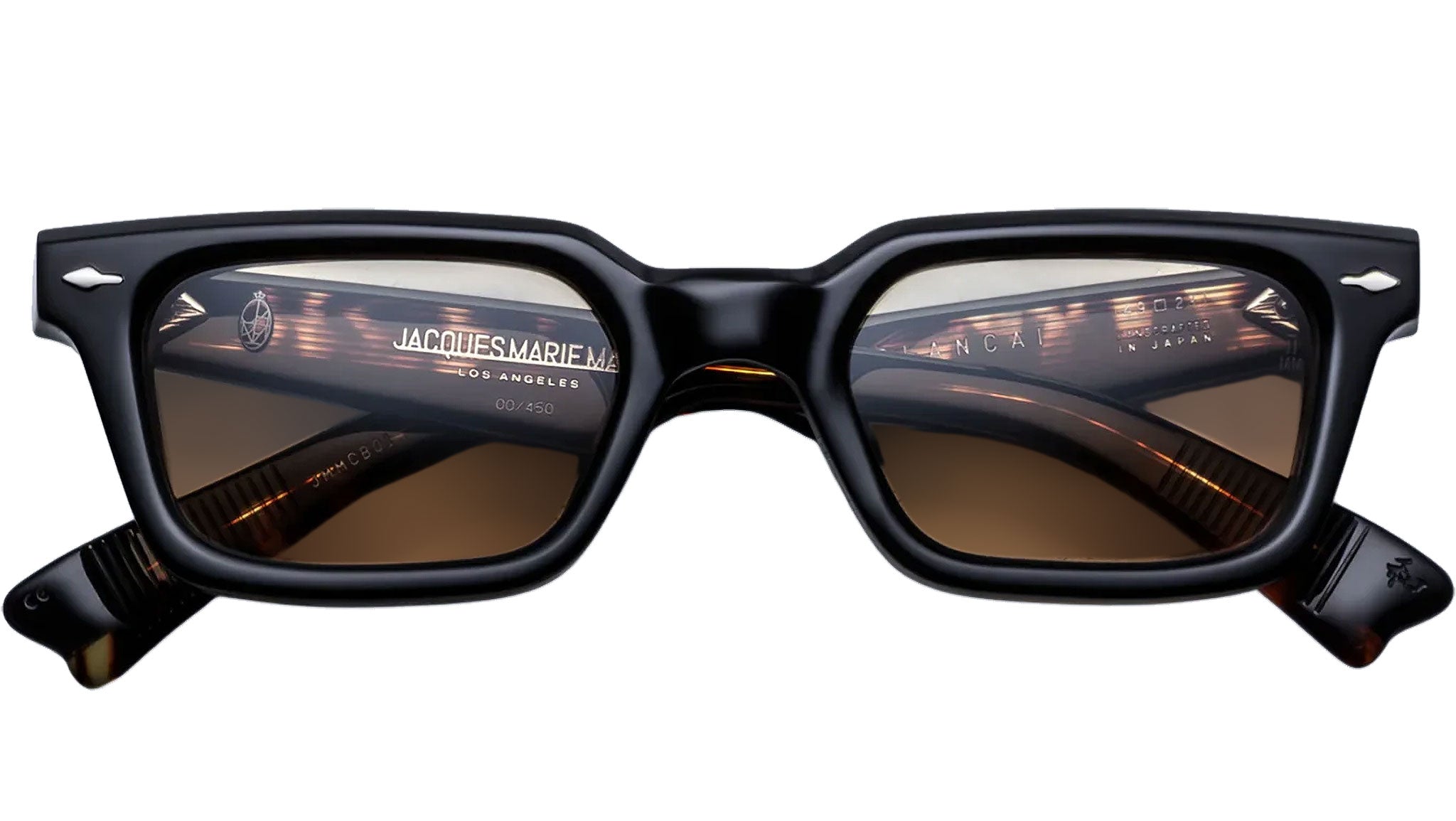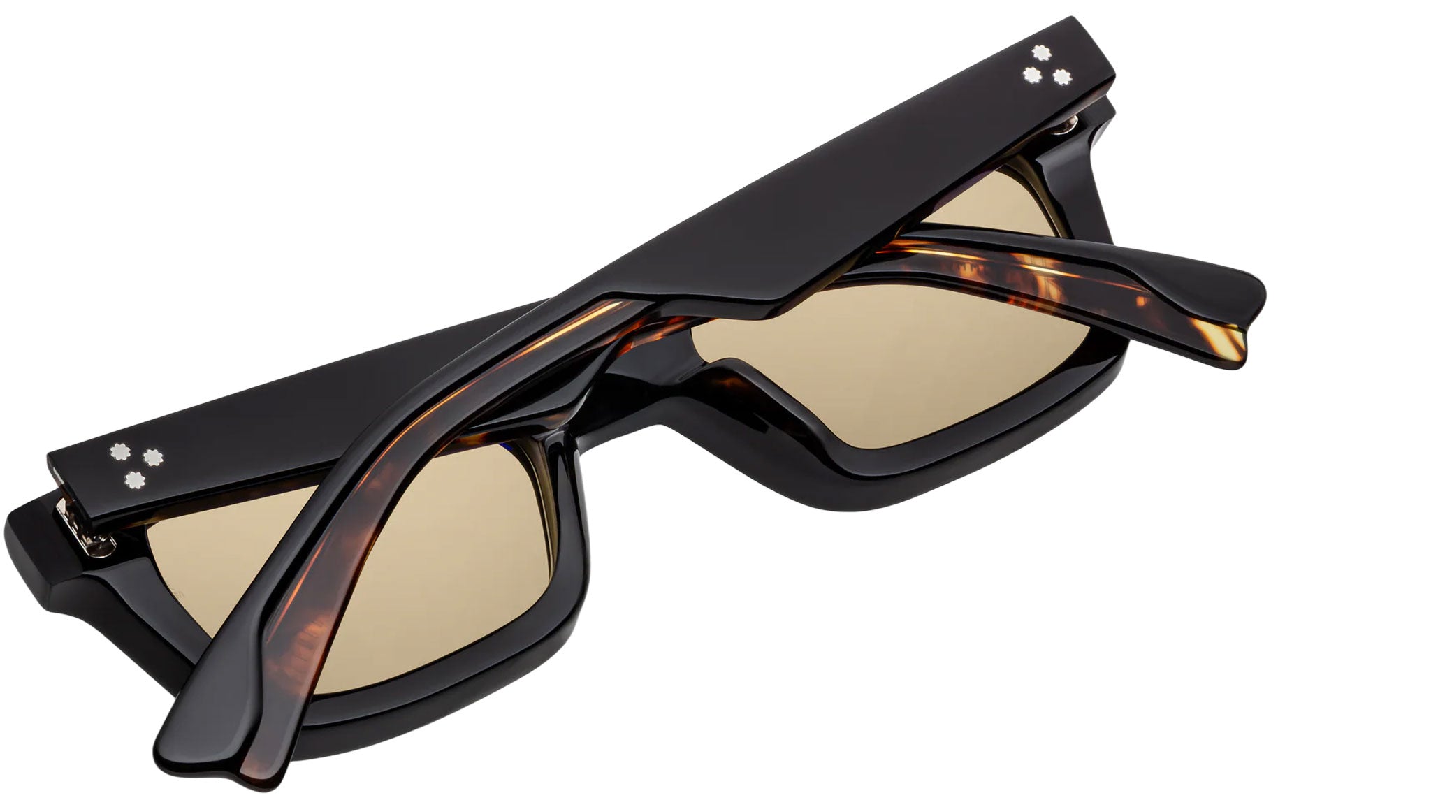 Crafted from black 10mm cured cellulose acetate, paired with custom double-laminated acetate temples featuring precious metal hardware and brown Sepia Armorlite lenses. Sterling silver signature arrowhead front pins add a distinctive touch, while hidden silver-finished 'Classic' wirecores and custom stainless steel 7-barrel hinges with Art Deco hairline detailing showcase refined construction. The 4-base lenses include a backside anti-reflective treatment, offering both style and superior optical performance.