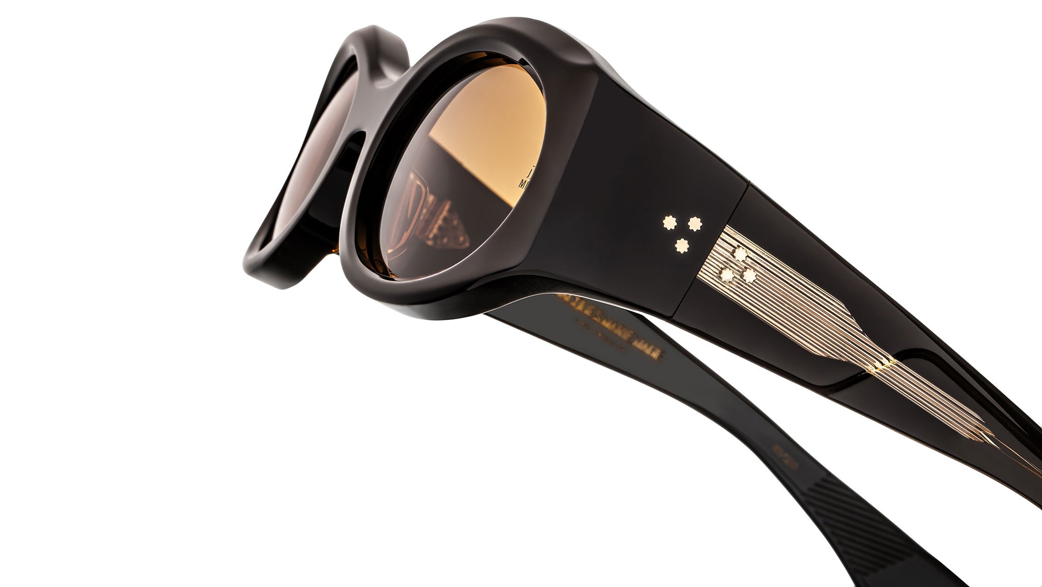 10mm cured cellulose acetate frame in brown with custom double-laminated temples composed of brown exteriors and interiors, complemented by Armorlite 6-base lenses in orange with backside anti-reflective treatment, exposed Ottertail wirecores plated in dark gold, custom 7-barrel hinges with refined hairline details plated in dark gold, spur-shaped rivets plated in dark gold, inner-temple hallmarks foil-stamped in gold.