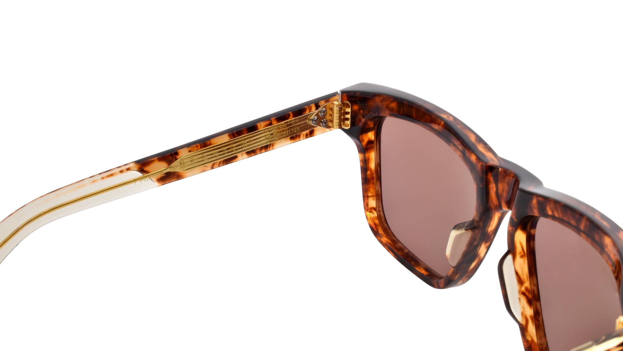 A unisex, well balance, Saratoga-esque expression of classic '60s style. Tortoise 10 mm cellulose acetate frame custom acetate temples featuring precious metal hardware and brown polarized lenses. Dark gold signature arrowhead front pin. Hidden wire core. Dark gold tension-secured custom 7-barrel hinge. Dark gold domed 3D metal logo. Bronze 6 base CR-39 lens with backside anti-reflective treatment. Frame shape: rectangular. 100% UV protection.