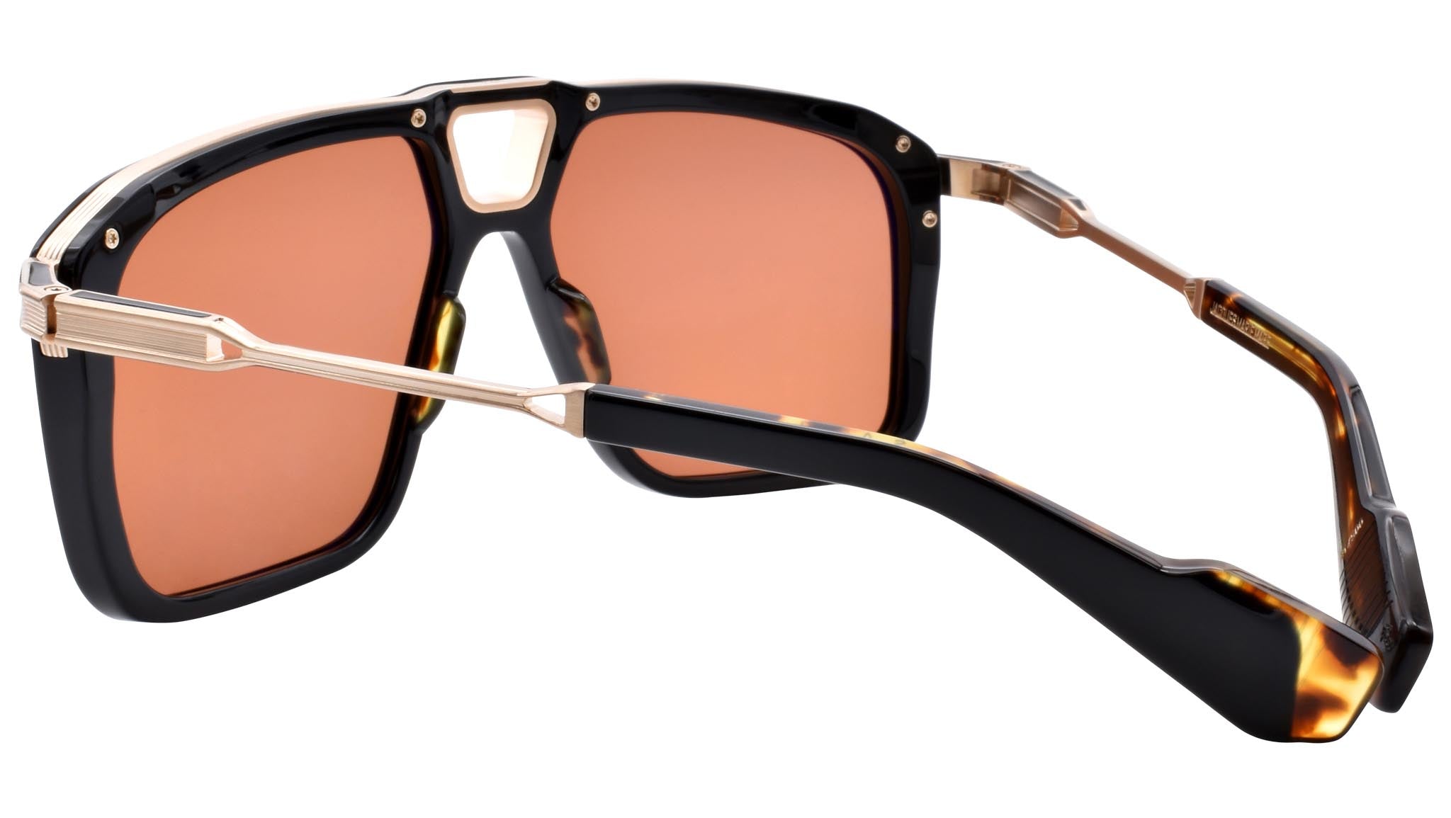 Black acetate and titanium frame with custom temple tips and orange lenses. Gold hardware. Dark tuscan CR-39 lens, 6 base with backside anti-reflective treatment. 100% UV protection.