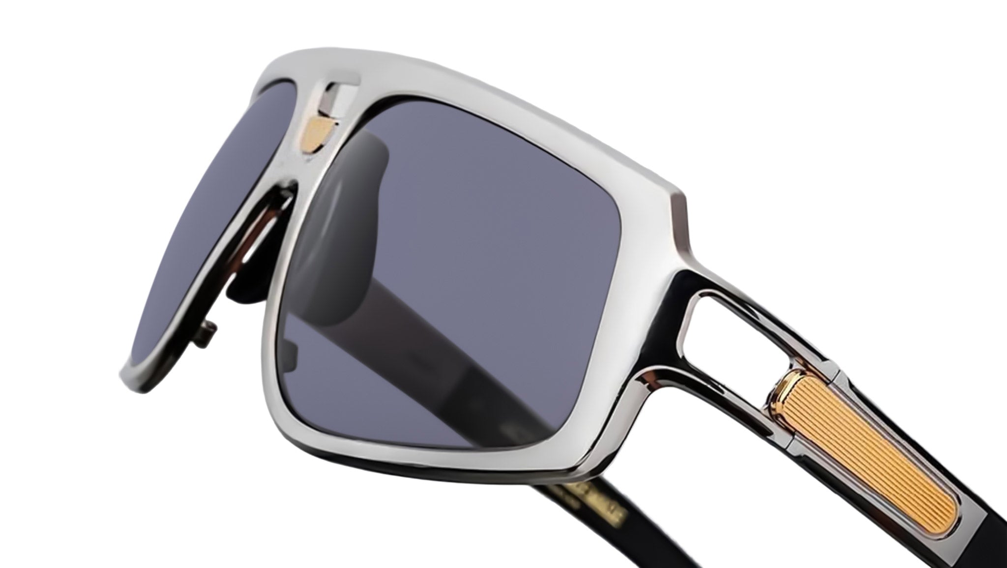 Featuring a 100% beta titanium frame in silver with contrasting dark gold details, paired with black acetate accents and gray acetate temple tips for a refined finish. The silver titanium front and temples are enhanced by a tension-secured custom monoblock hinge, engineered for durability and smooth movement. Equipped with Jet CR-39 6-base lenses, these sunglasses include backside anti-reflective treatment and provide 100% UV protection