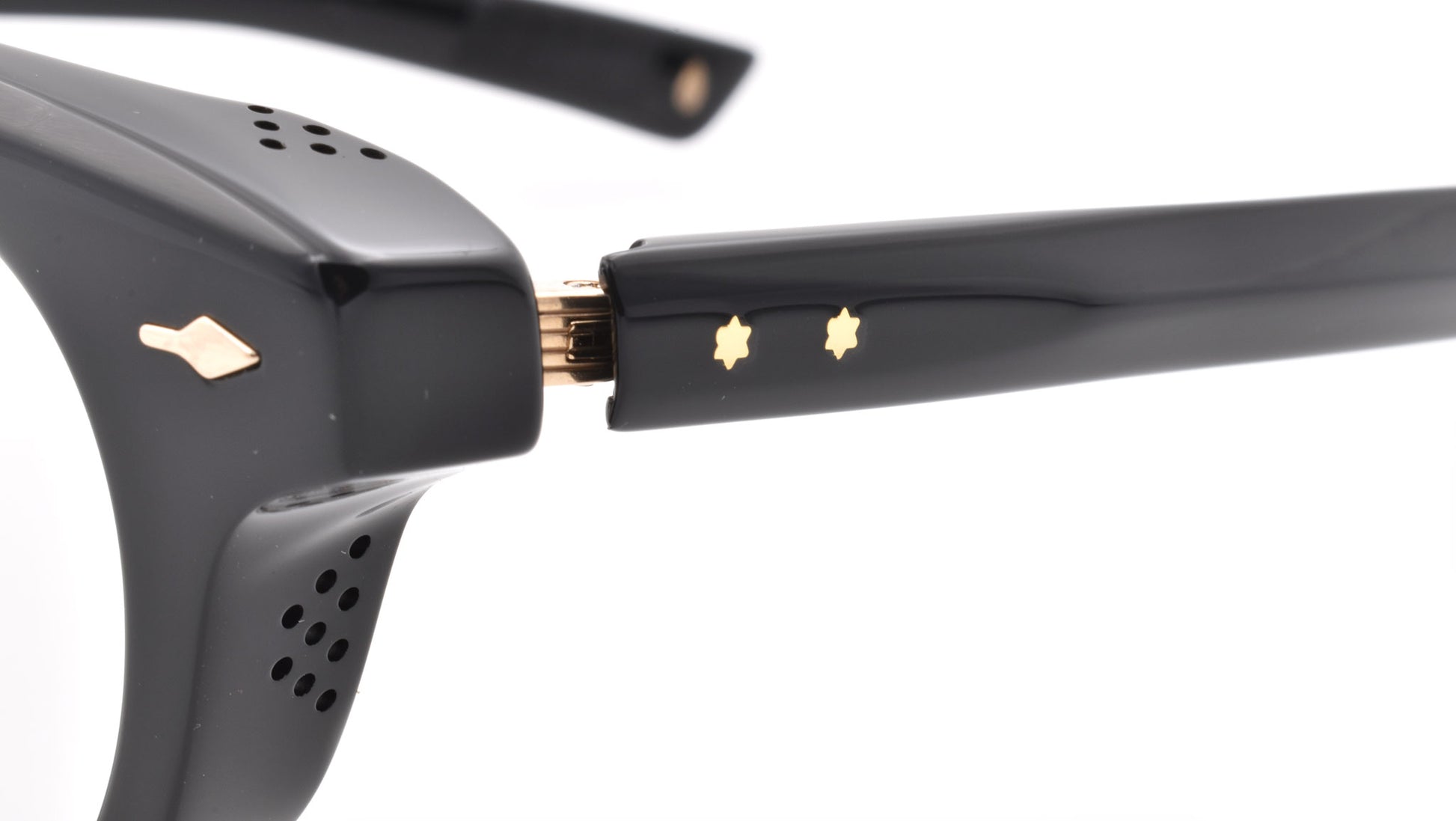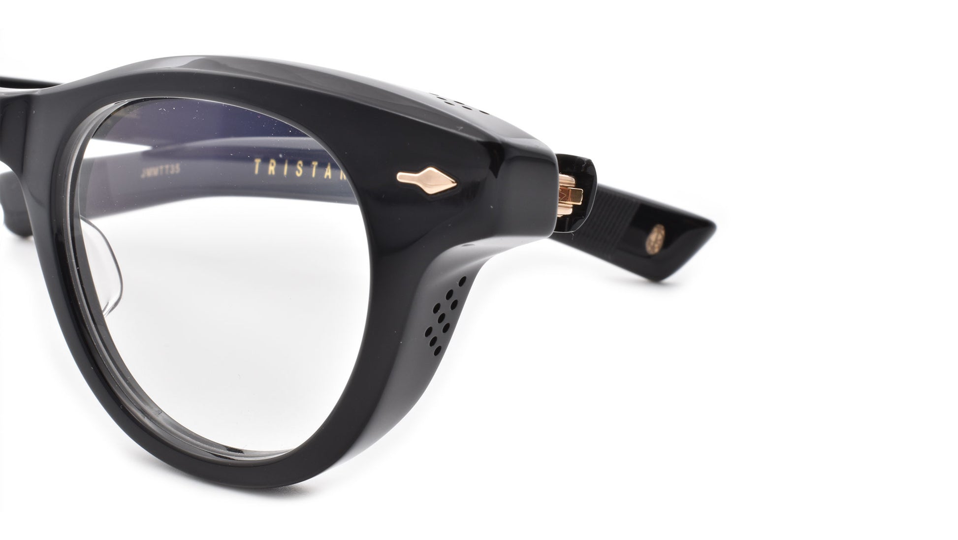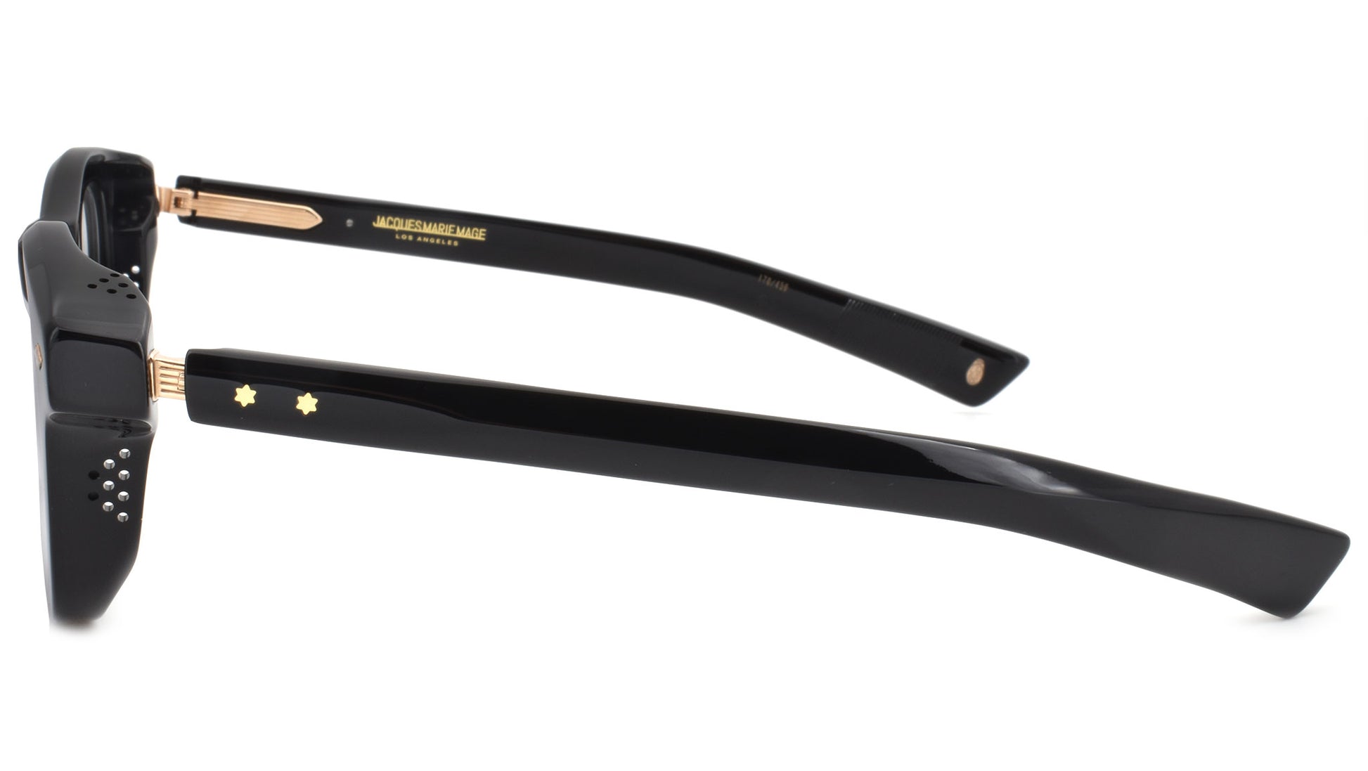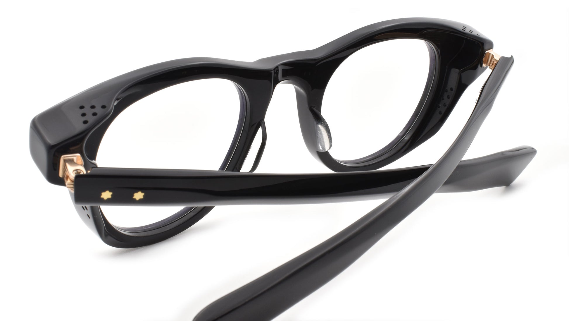 12mm block, black polished acetate frame, custom floating hinge system. Hardware: light gold. Pantoscopic shape with intensive volume cut out. Light gold signature arrowhead front pin. Light gold custom hairline engraved wire core design. Light gold custom floating hinge with spur-shaped rivets. Light gold domed 3d metal cameo logo. 6 base CR-39 demo lens with backside anti-reflective treatment. Handcrafted in Japan.
