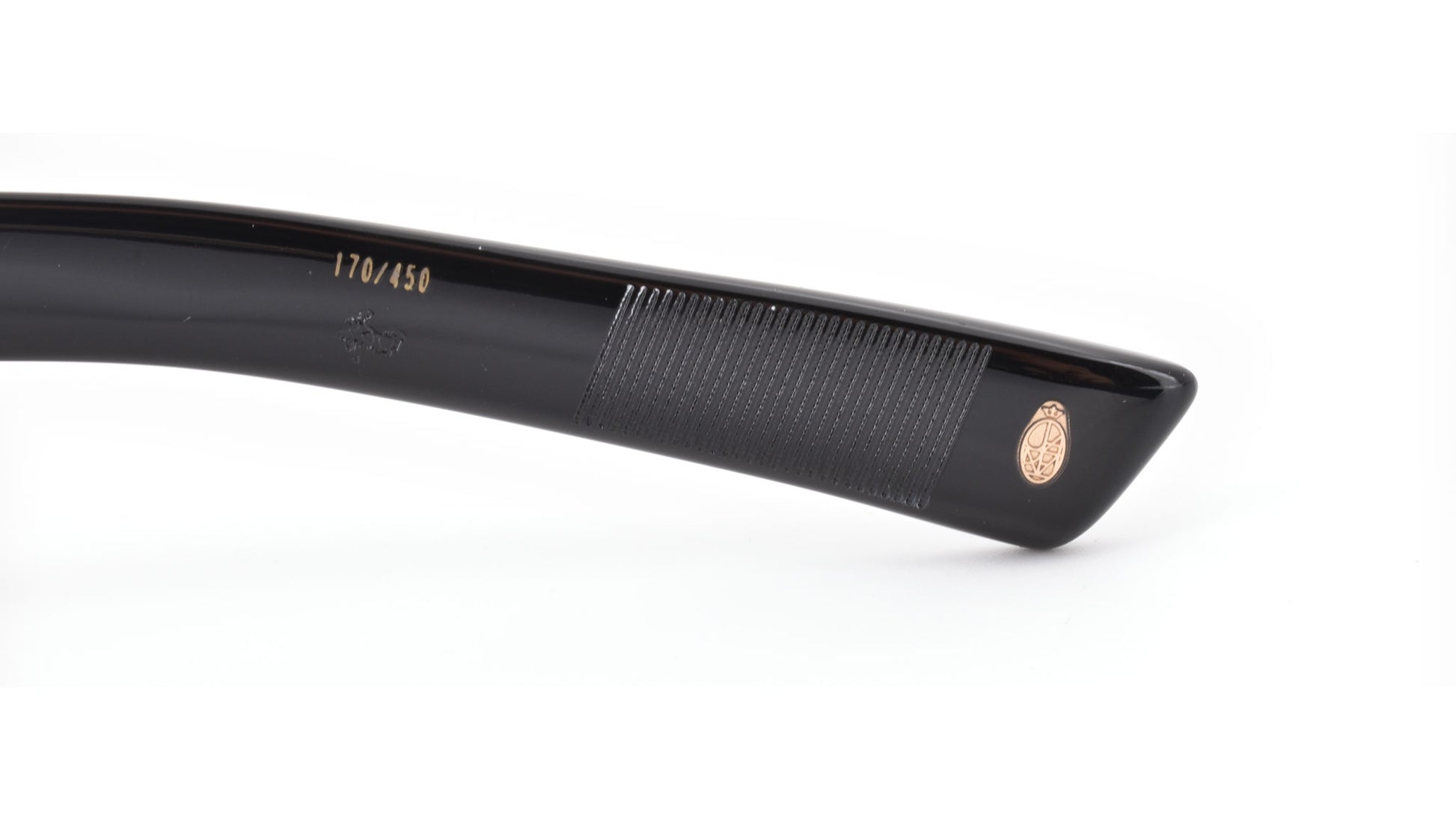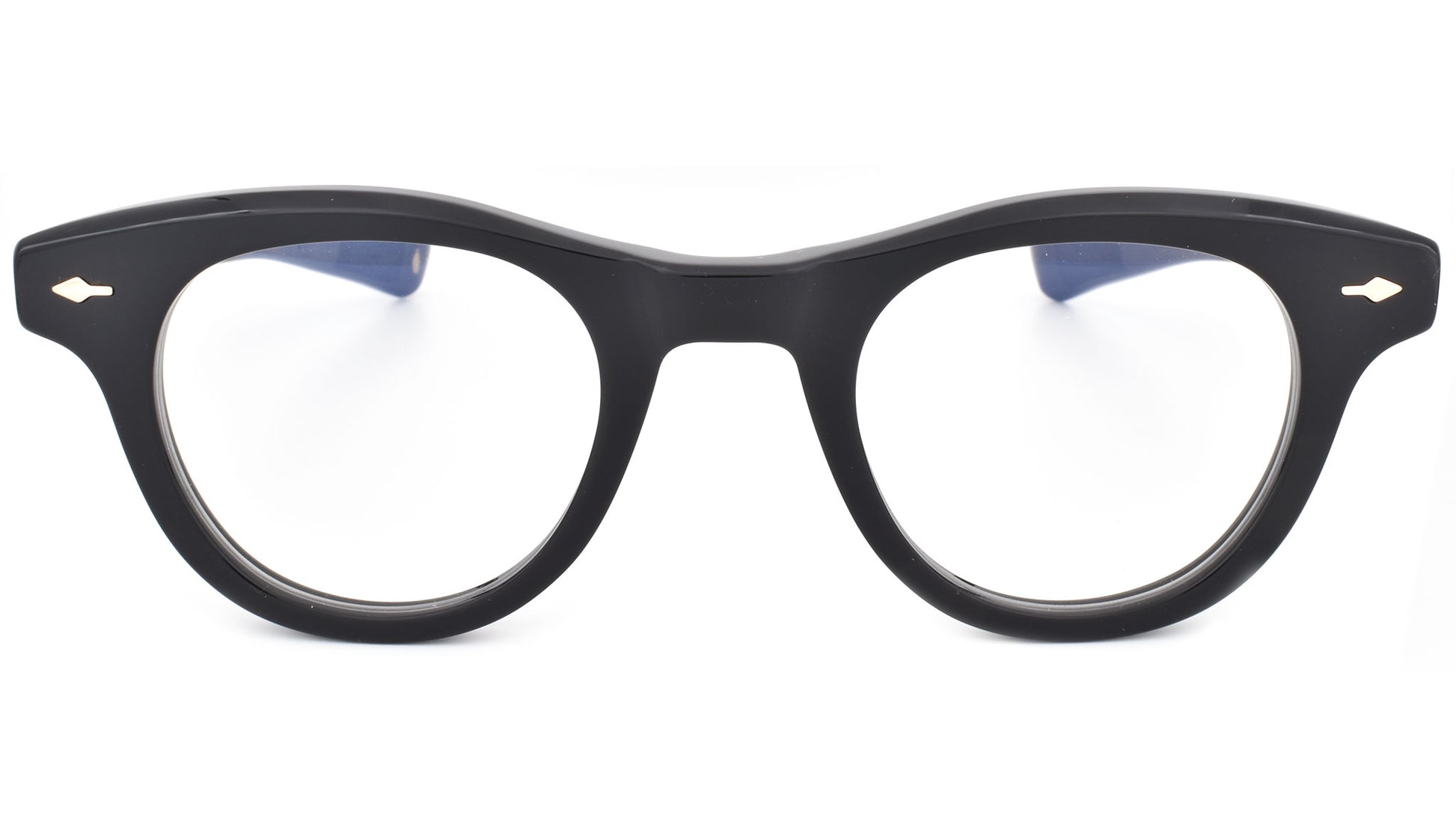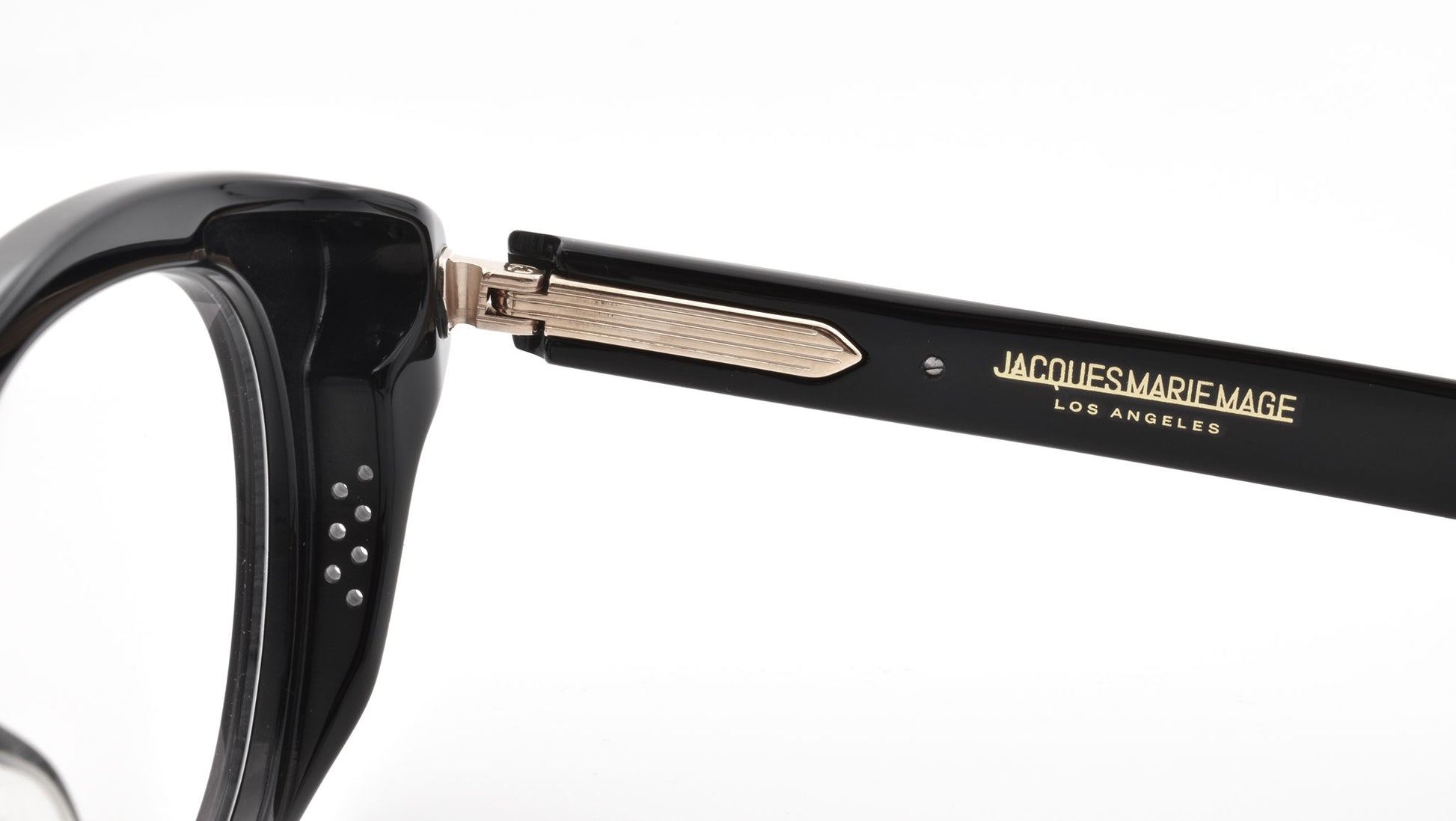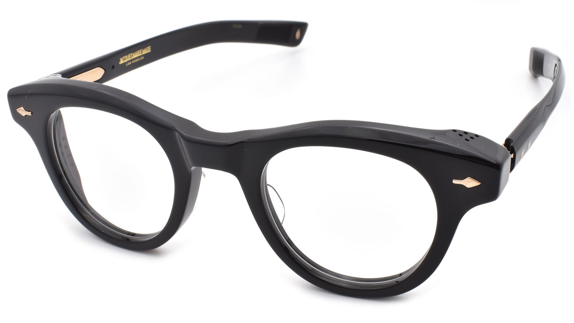 12mm block, black polished acetate frame, custom floating hinge system. Hardware: light gold. Pantoscopic shape with intensive volume cut out. Light gold signature arrowhead front pin. Light gold custom hairline engraved wire core design. Light gold custom floating hinge with spur-shaped rivets. Light gold domed 3d metal cameo logo. 6 base CR-39 demo lens with backside anti-reflective treatment. Handcrafted in Japan.