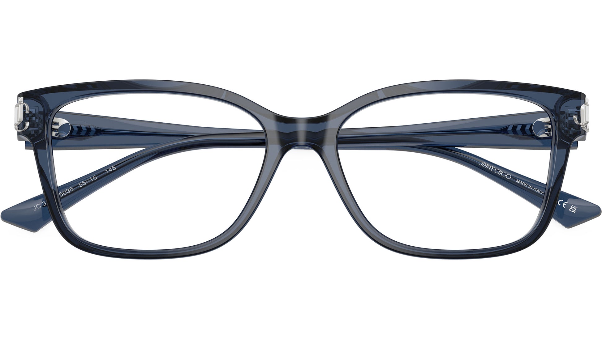 Jimmy Choo JC3012 5035 glasses for women, featuring transparent navy d-frame acetate frame and demo lenses. High bridge fit. Brand line: JC Monogram. Style code: 0JC3012. Color code: 5035. Authorized Jimmy Choo online reseller. Your glasses will include the original case and accessories and are covered by a 12-month global warranty.