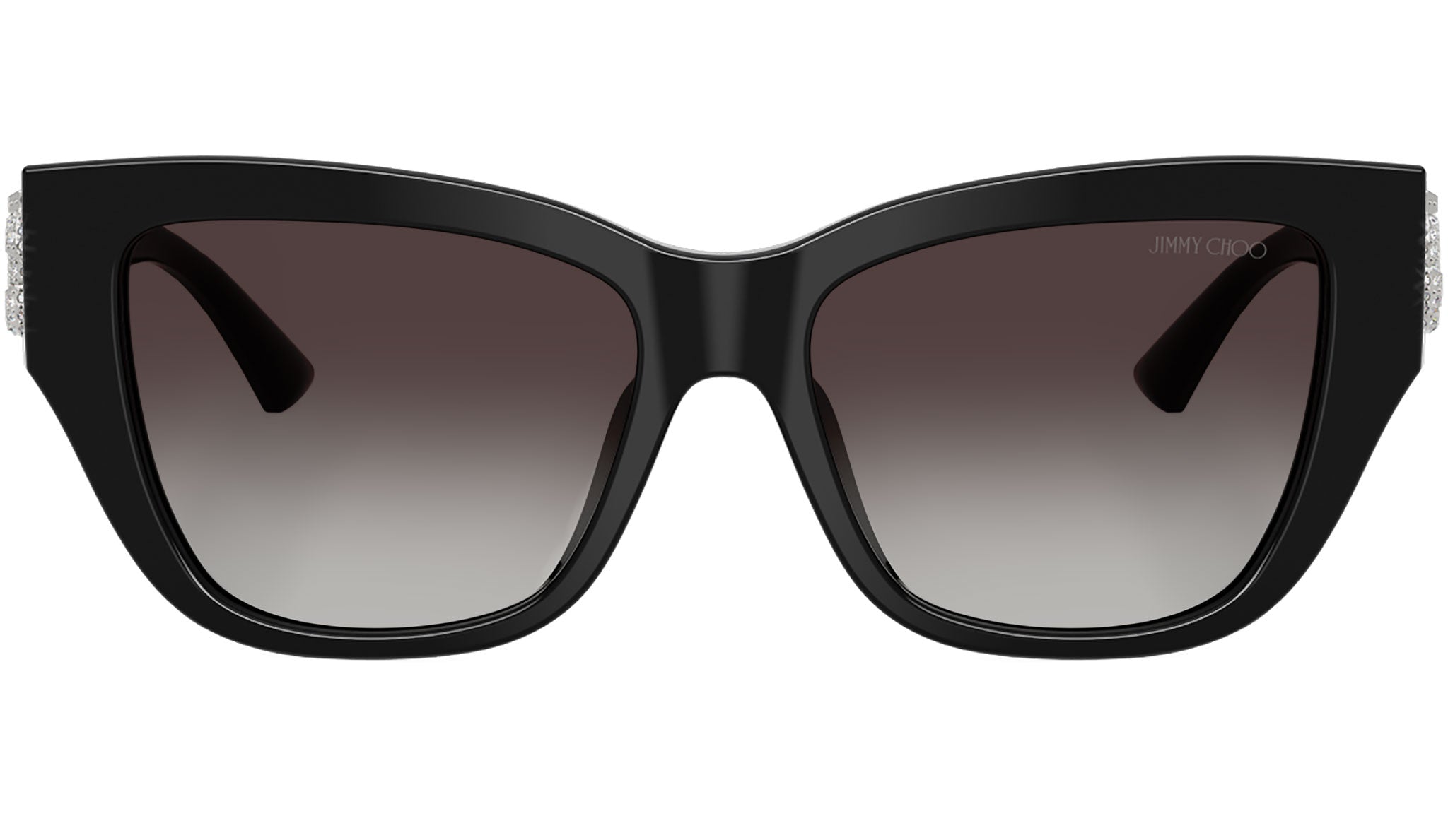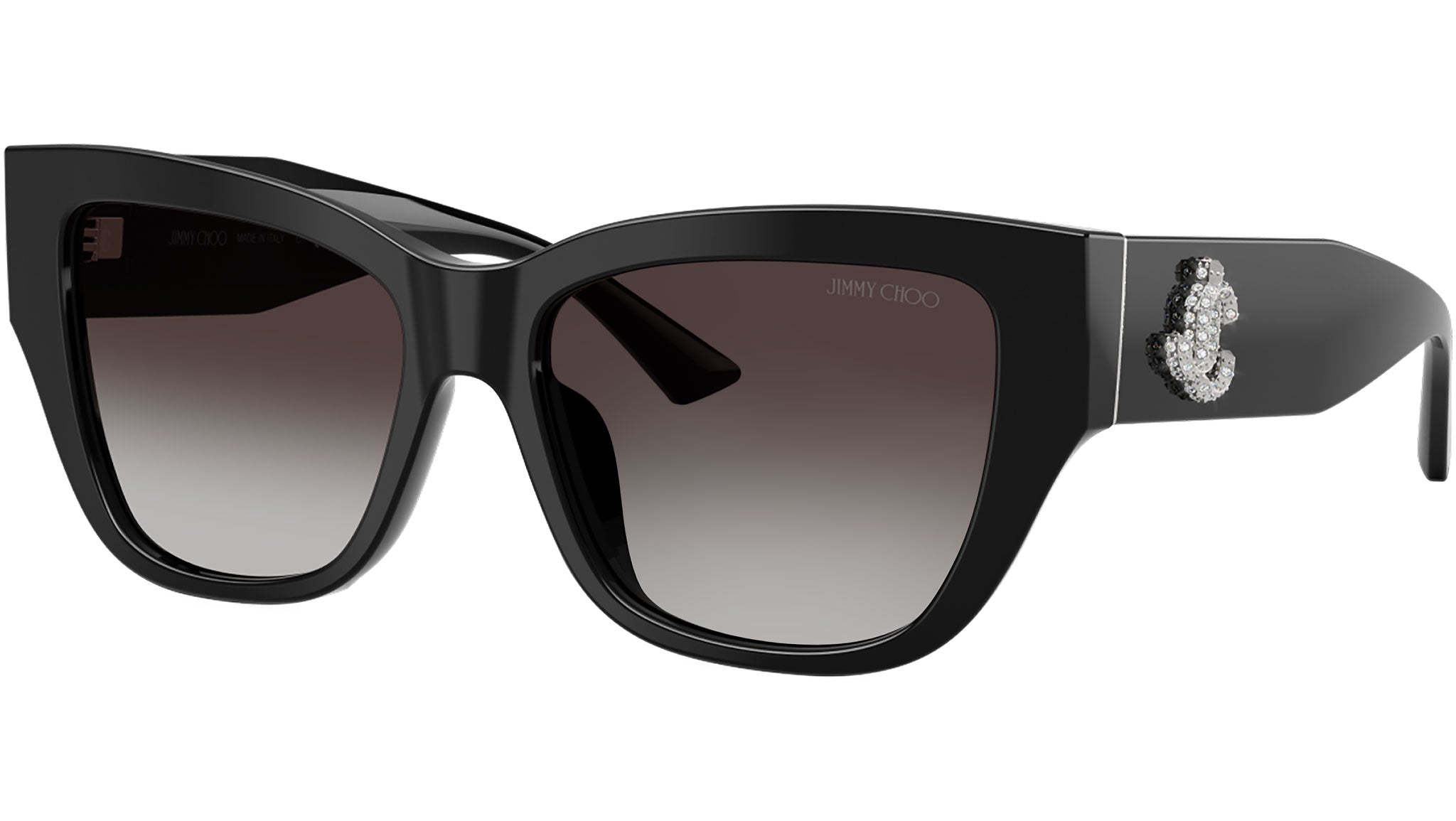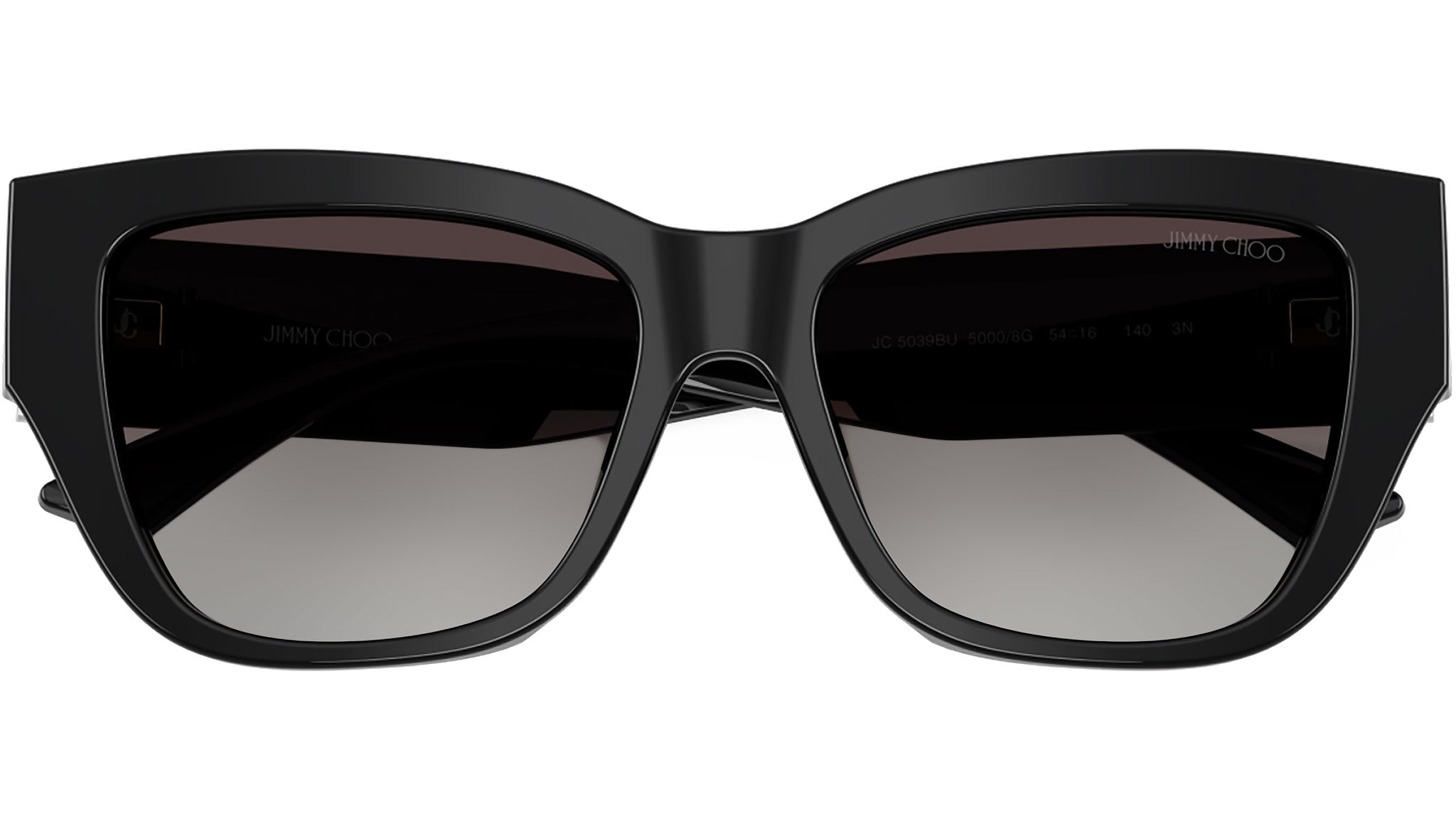 Jimmy Choo JC5039BU 50008G sunglasses for women, featuring black d-frame acetate frame and gradient gray bio polyamide lenses. Universal fit. Brand line: JC Monogram. Style code: JC5039BU. Color code: 50008G. Authorized Swarovski online reseller. Your glasses will include the original case and accessories and are covered by a 12-month global warranty.