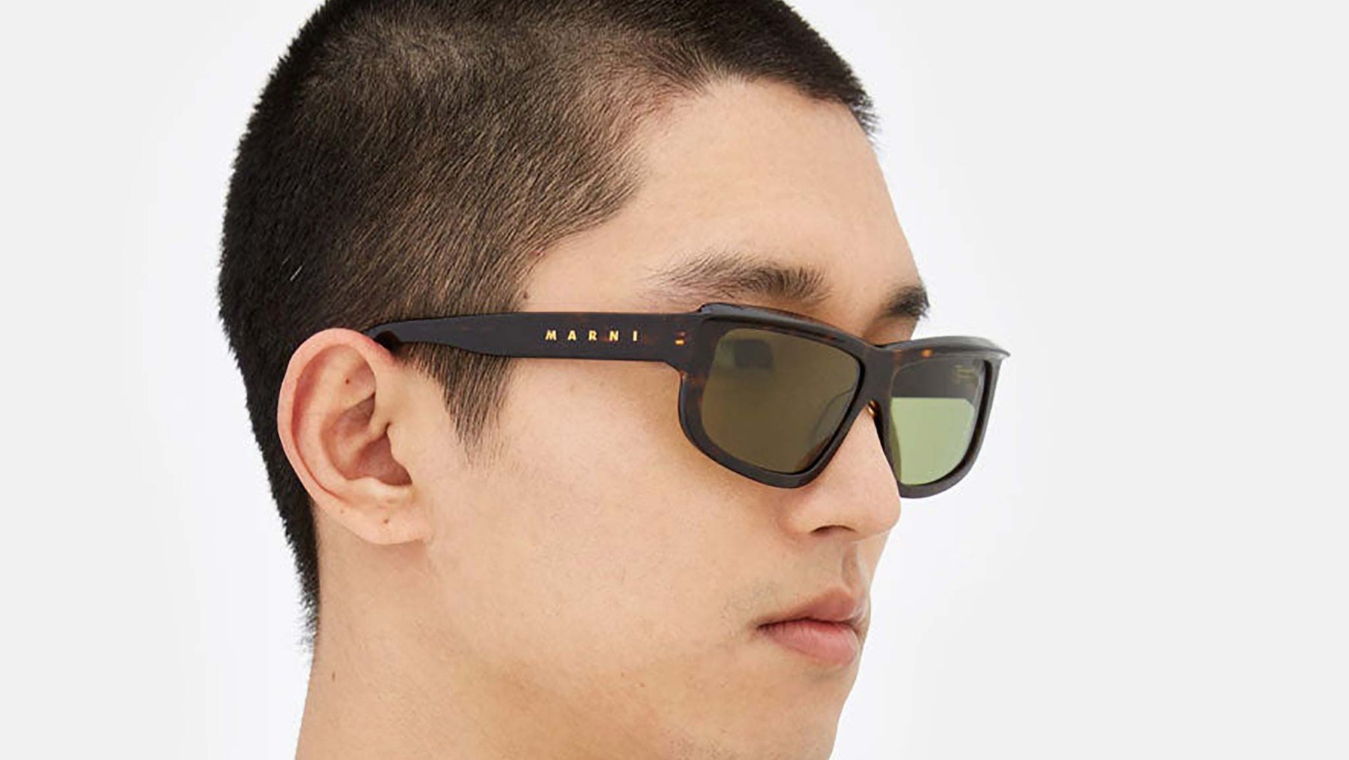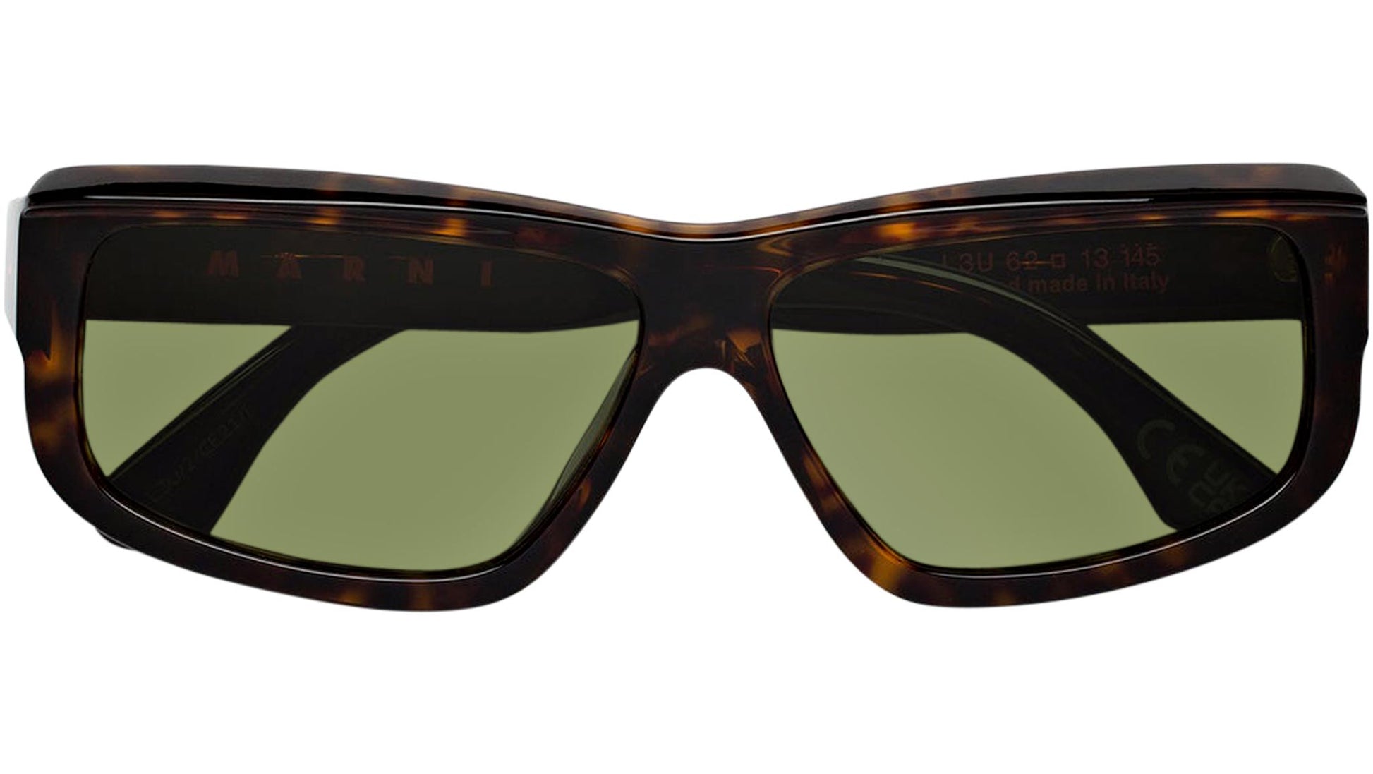 Low bridge fit. Designed exclusively for Marni, Annapuma Circuit is a silhouette that embraces a fast-paced sportswear heritage, reinterpreting it with a high-end approach to design. The model features a slight wrap-around structure, with a distinctive stretched brow-piece, a nod towards daring sporting features. The squared profile with slanted rims on the bottom, gives this shape its daredevil character. This model is available in a dark Havana acetate with bottle green lenses. Sizes: R / R Lens Width: 62 mm. Frame Front: Frame Side: 145 mm. Product Code Size R: L3U Product Code Size R: LP0