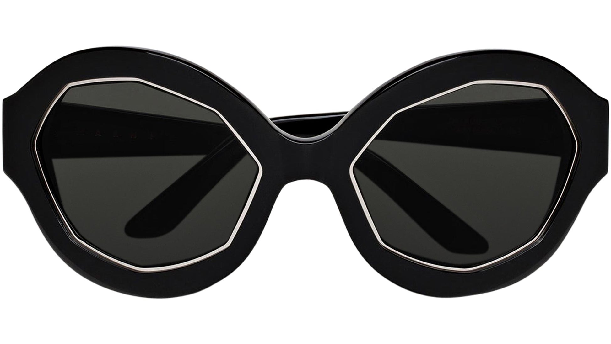 An exclusive silhouette designed for Marni, Cumulus Cloud captures the quirky essence of the cult Italian brand. Inspired by pop culture, with its bold colors, streamlined shapes and shiny plastic materials, Cumulus Cloud is the ultimate oversized silhouette. It features a rounded design with broad lenses encased within octagonal rings and set within a wrap-around acetate structure. This version comes in a shiny black acetate with matching lenses. Sizes: R Lens Width: 63 mm. Frame Front: Frame Side: 125 mm. Product Code Size R: P9U