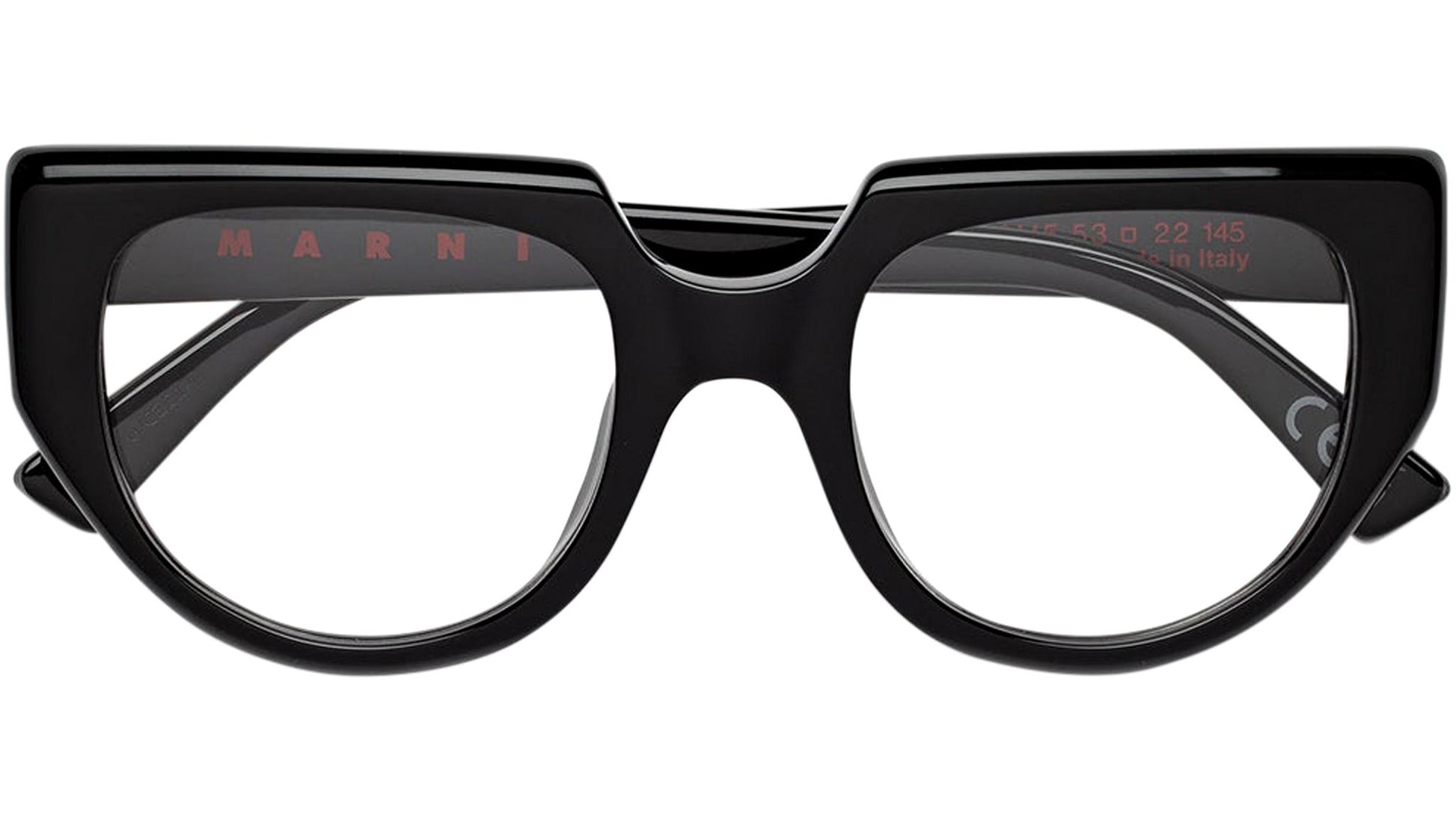 Designed exclusively for Marni, Uluru is a sturdy Optical silhouette characterised by unique geometries and asymmetrical design features. The model blends squared detailing with carefully rounded curves for an innovative aesthetics. Different thicknesses are placed in strategic areas for extra strength, a strong brow-piece is matched by slender rims on the lower part of the frame. This is a sophisticated model that captures Marni’s quirky approach to style. This version is available in shiny black acetate. Sizes: R / R Lens Width: 53 mm. Frame Front: Frame Side: 145 mm. Product Code Size R: 0M5 Product Code Size R: 2XX