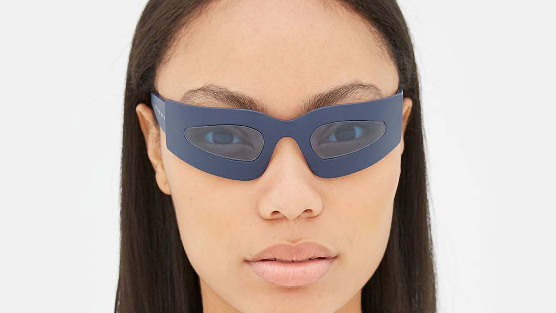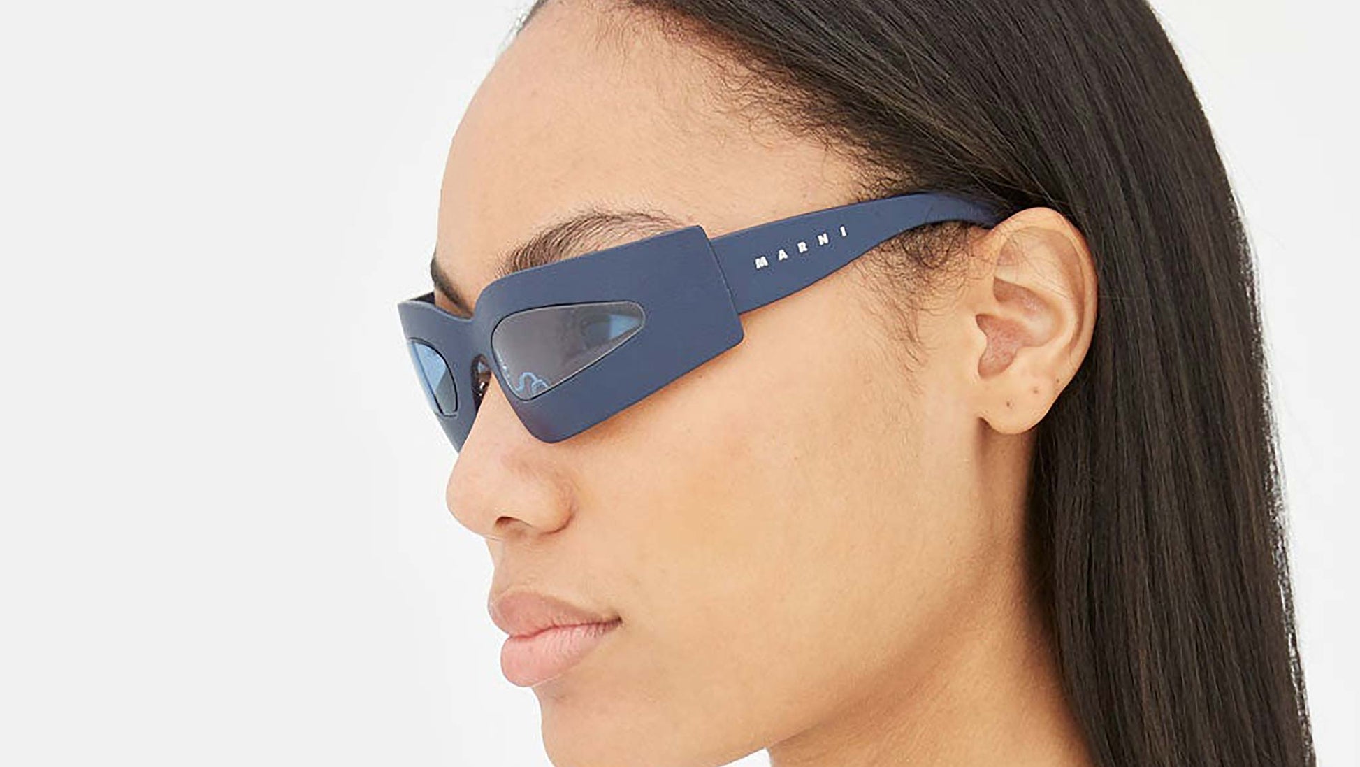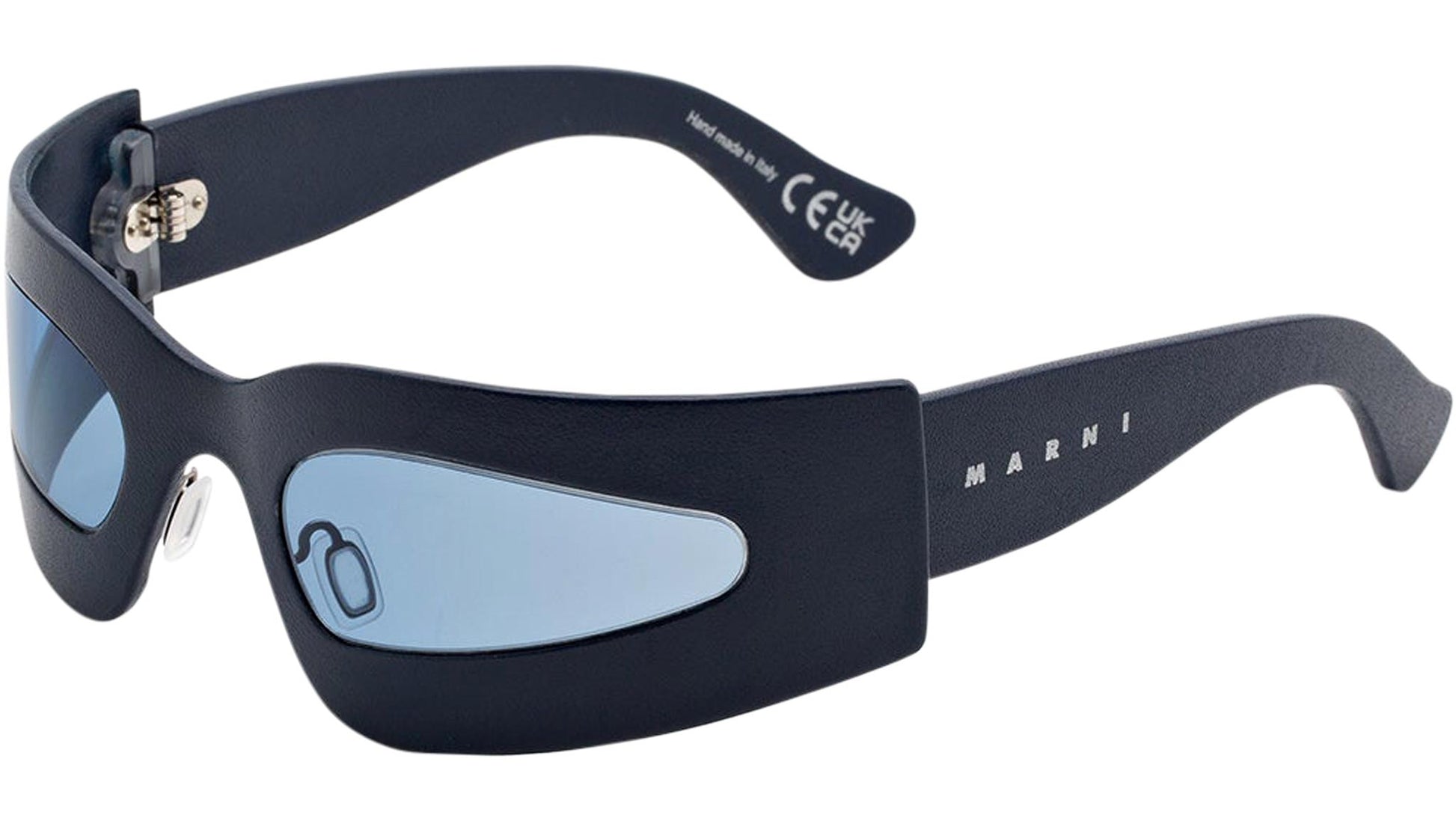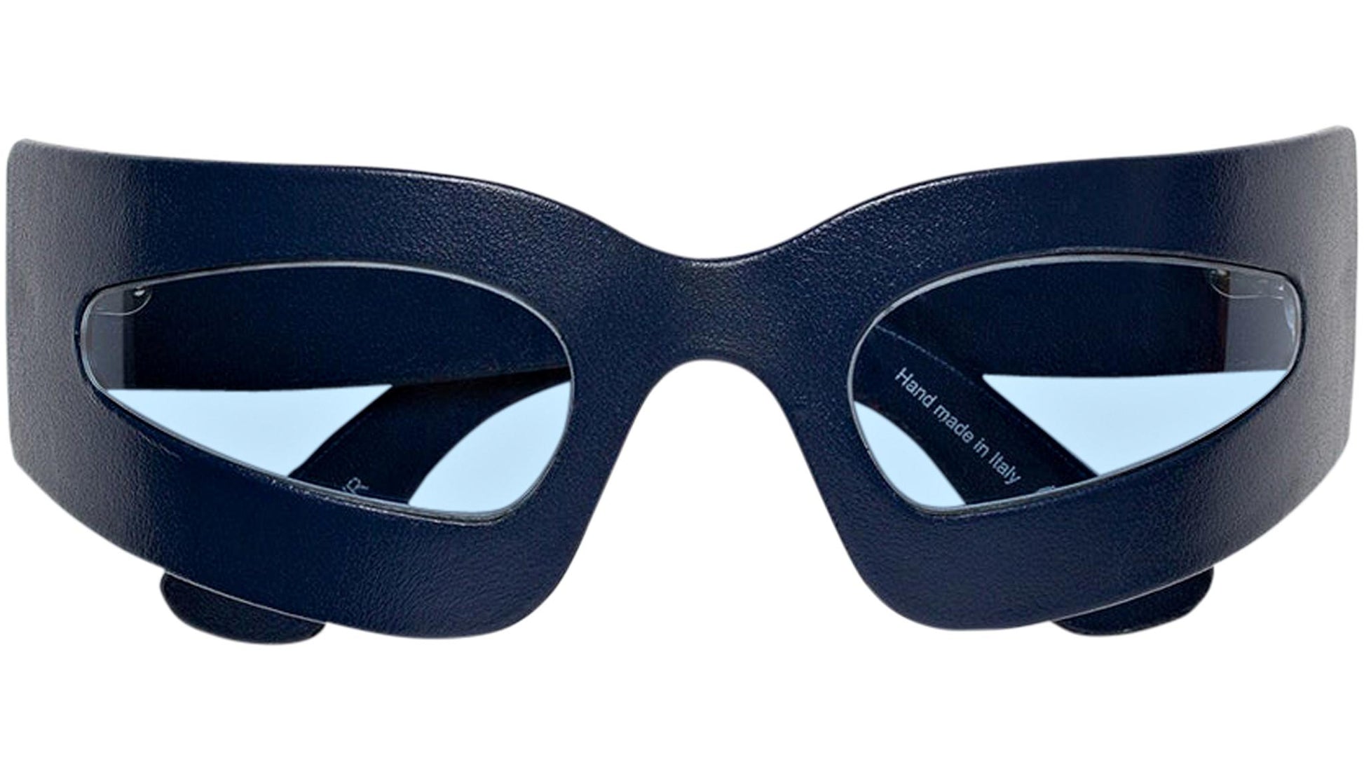 Designed exclusively for Marni, this genderless design underlines RSF’s ultra lightweight and flexible Tuttolente technology. Working with unique wrap-around shields which delicately embrace your face, the low riding silhouette reveals only the essential and functional structure for a one of a kind design. The frontal frame as well as temples are entirely made from the highest quality of nylon by Carl Zeiss, which have been meticulously hand-covered by artisans with real leather. Leaving only the oval lens shapes clear for an optimal vision. This version of the Yuma Gardens is available in a soft navy blue leather and playful blue lenses. Sizes: R Lens Width: 51 mm. Frame Front: Frame Side: 115 mm. Product Code Size R: 5VY