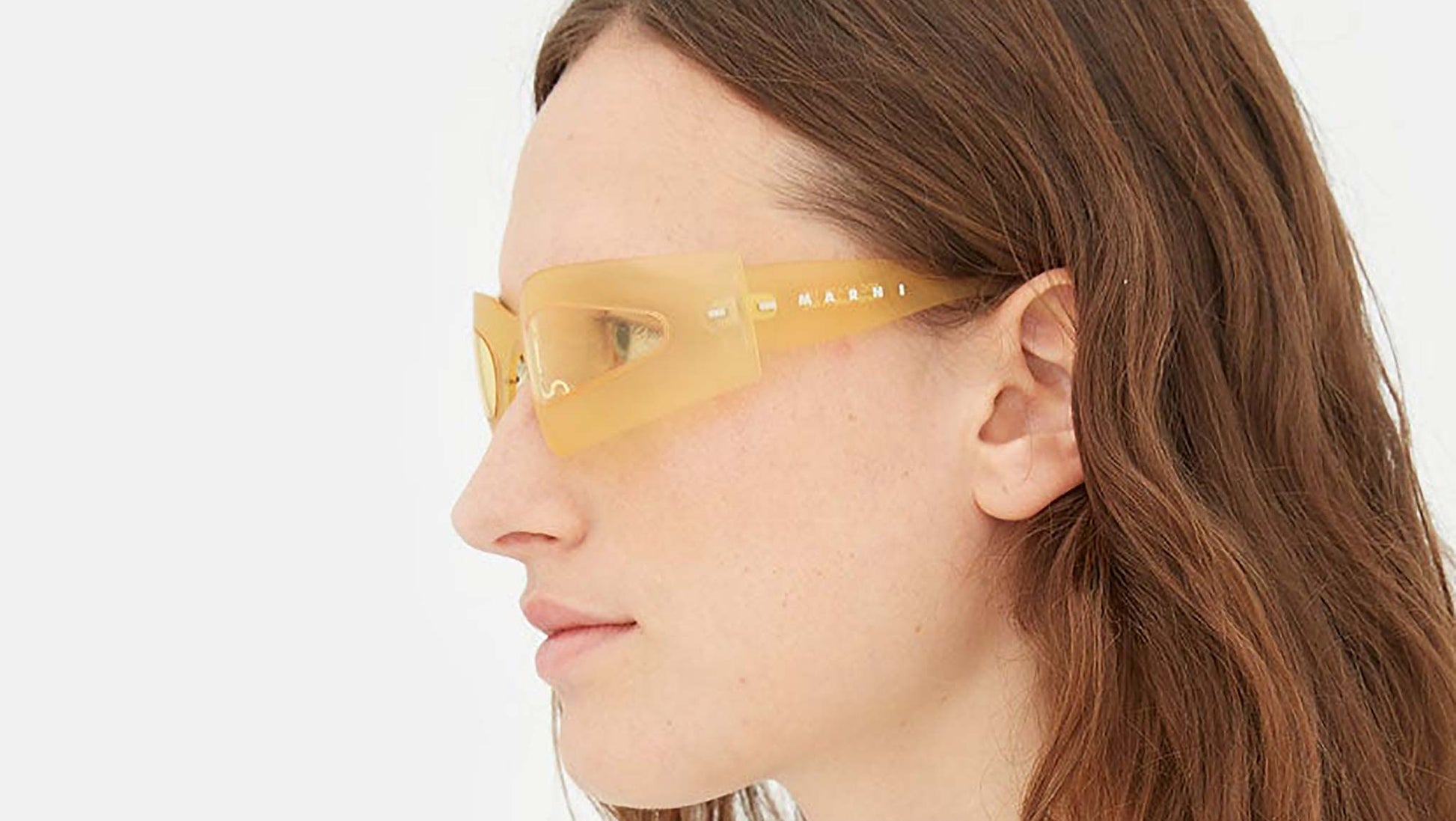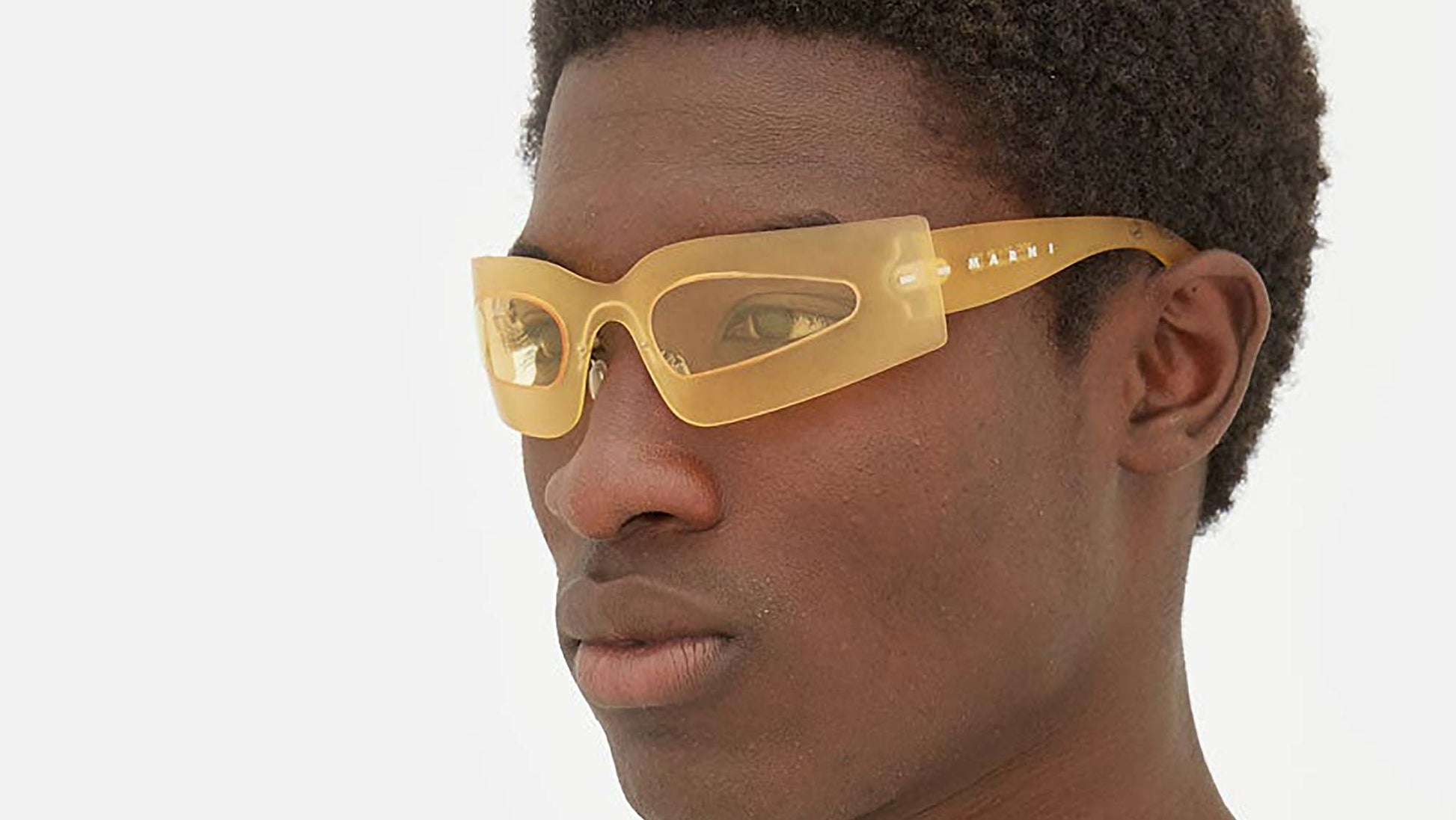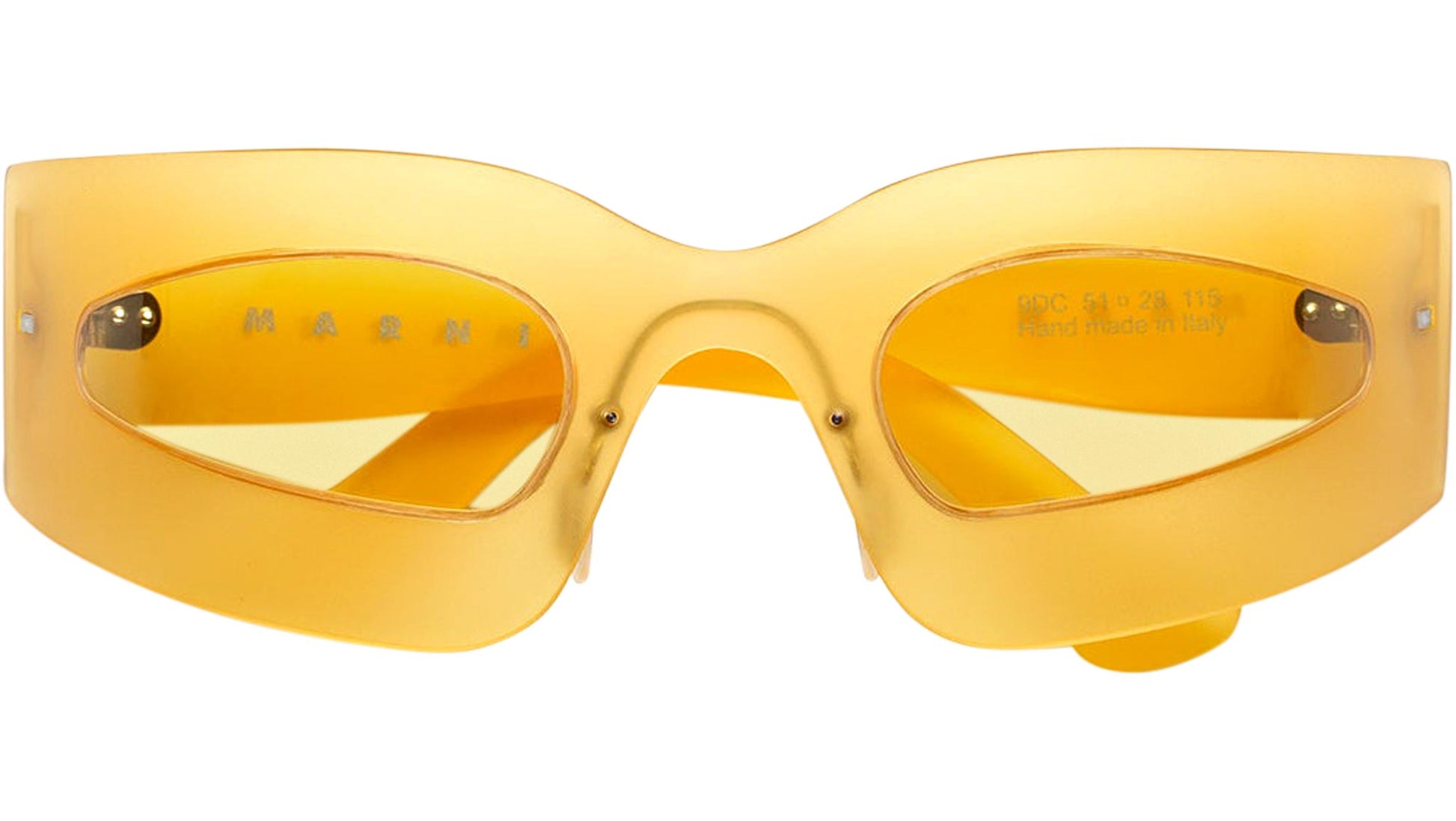 Designed exclusively for Marni, this genderless design underlines RSF’s ultra lightweight and flexible Tuttolente technology. Working with unique wrap-around shields which delicately embrace your face, the low riding silhouette reveals only the essential and functional structure for a one of a kind design. The frontal frame as well as temples are entirely made from the highest quality of nylon by Carl Zeiss, which have been given a sleek matte finish, while the two oval lens shapes remain clear for an optimal vision. This version of the Yuma Gardens is available in a soft eggnog yellow. Sizes: R Lens Width: 51 mm. Frame Front: Frame Side: 115 mm. Product Code Size R: 9DC