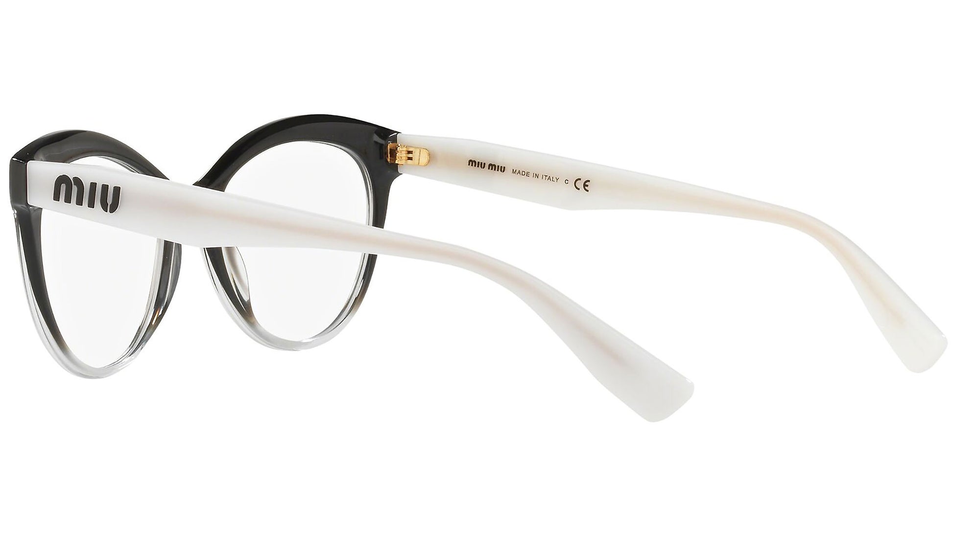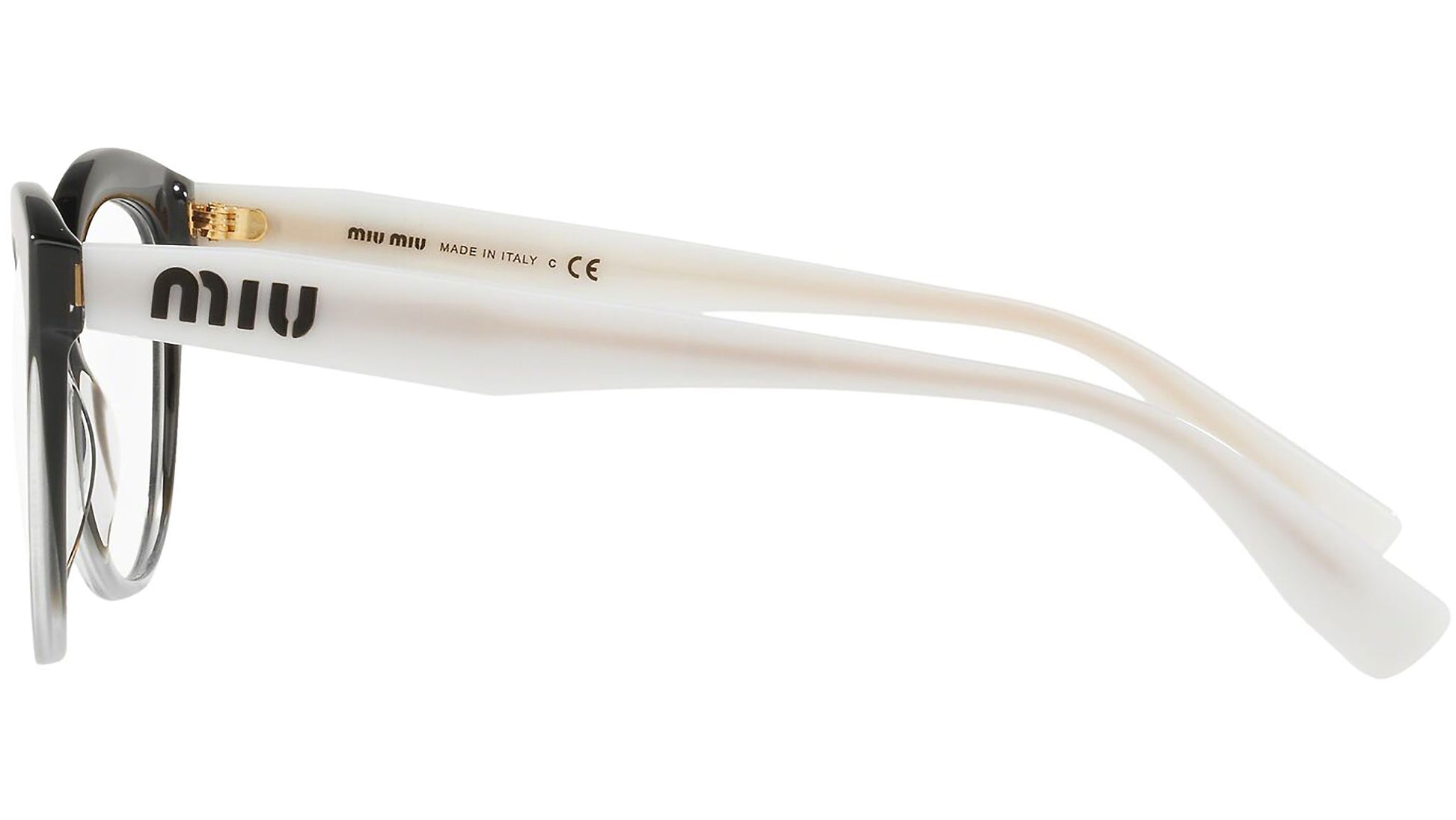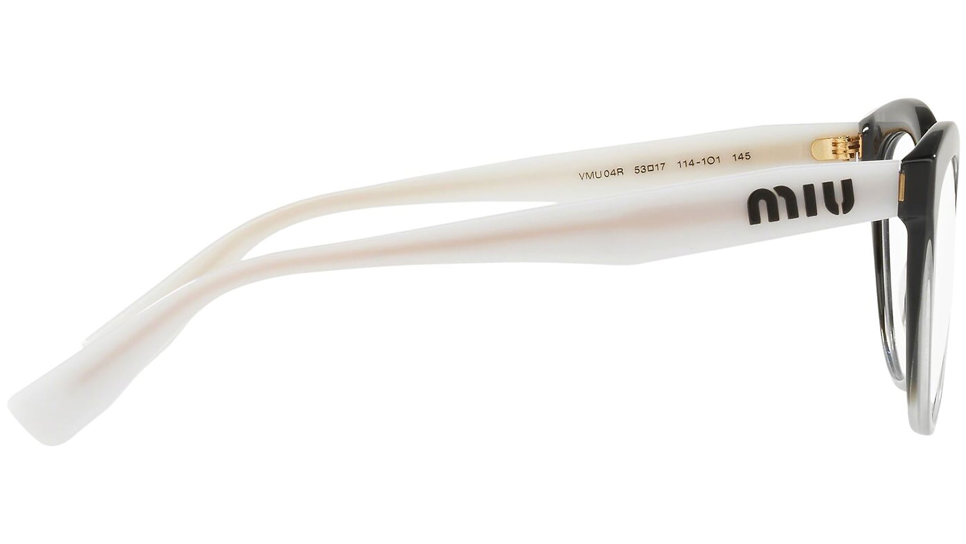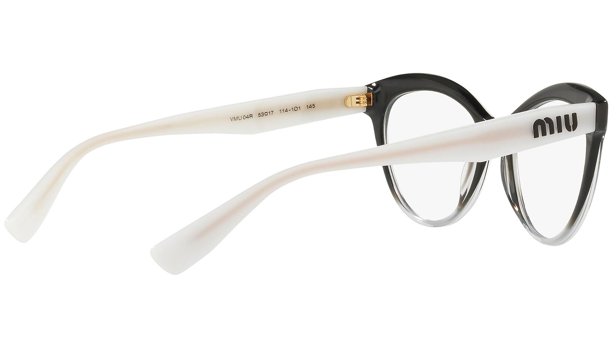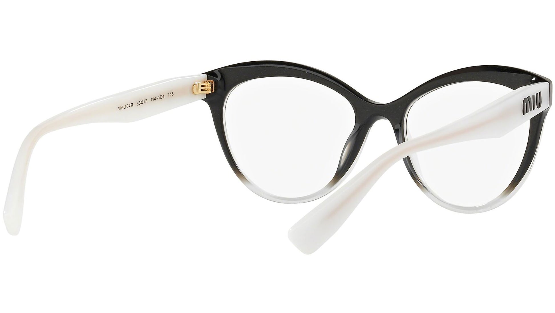 Miu Miu Eyewear Collection model MU 04RV black glitter gradient frame variant, color code 1141O1. The glasses from Miu Miu eyewear collection are unique creations, the result of the constant stylistic research and skillful craftsmanship of the brand. A unique blend of playful experimentation and rich detailing that perfectly embodies the stylistic codes that have always characterized the House, confirming once again Miu Miu’s undisputed talent in combining unconventional designs with retro-inspired romanticism.
