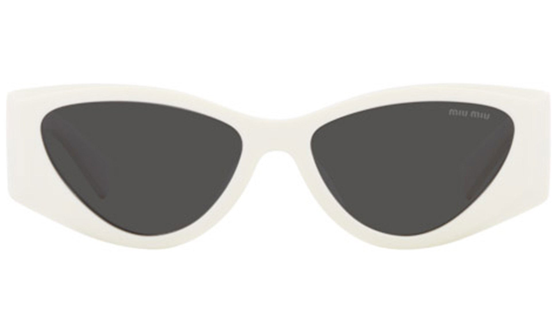 Miu Miu sunglasses model MU 06YS color code 1425S0 featuring white full rim acetate frame and CR-39 dark grey lenses. The sunglasses within the Miu Miu eyewear collection stand as distinctive masterpieces, products of the brand's relentless stylistic exploration and adept artistry. A harmonious fusion of joyful experimentation and intricate detailing, these sunglasses epitomize the stylistic ethos that has perennially defined the House. This reinforces Miu Miu's undeniable knack for integrating offbeat designs with a touch of retro-tinged romanticism.