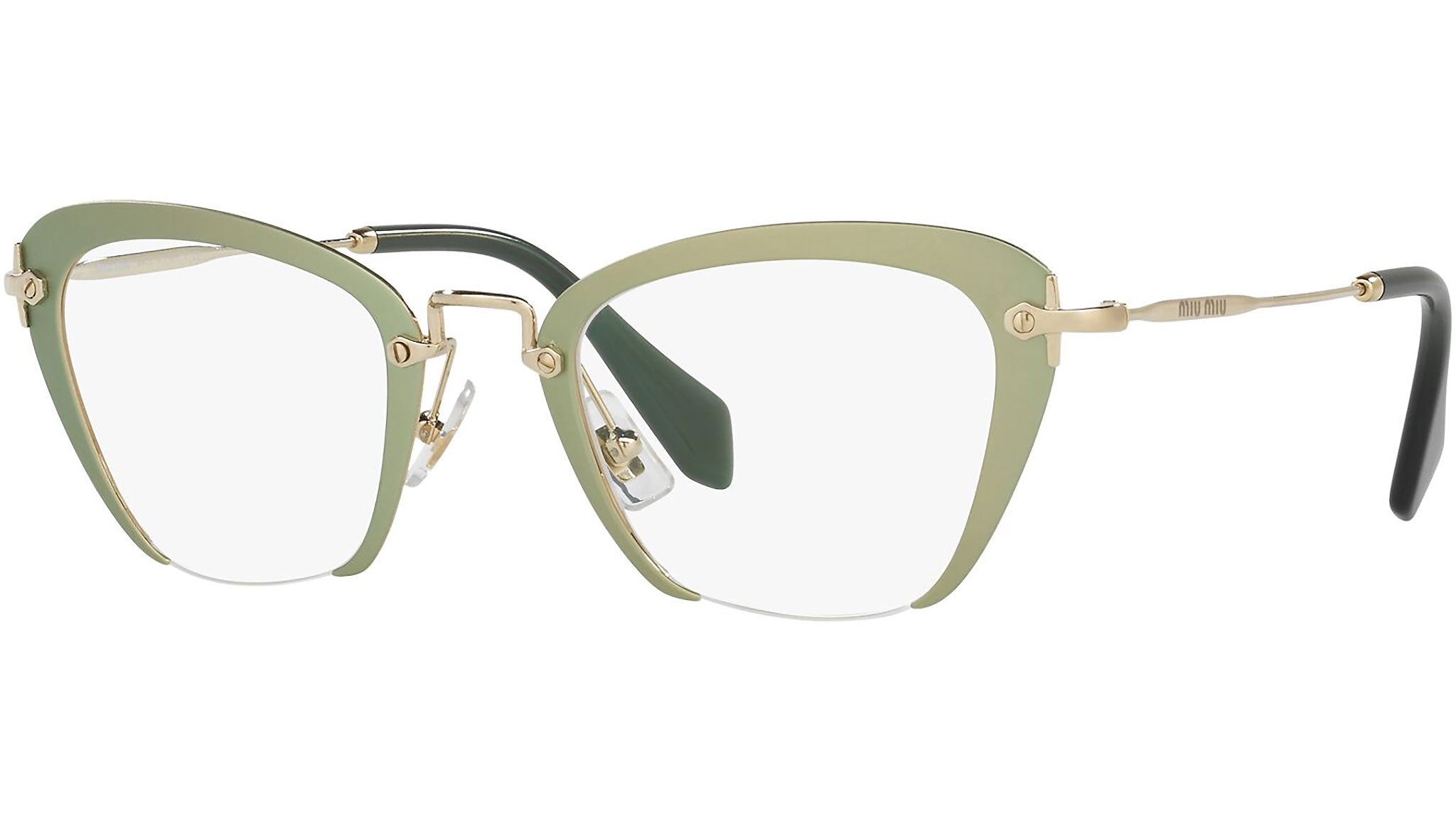 Miu Miu Eyewear Collection model MU 54OV color code UF21O1 featuring metallized opal green semi rim acetate-metal frame and demo lens. The glasses from Miu Miu eyewear collection are unique creations, the result of the constant stylistic research and skillful craftsmanship of the brand. A unique blend of playful experimentation and rich detailing that perfectly embodies the stylistic codes that have always characterized the House, confirming once again Miu Miu’s undisputed talent in combining unconventional designs with retro-inspired romanticism.