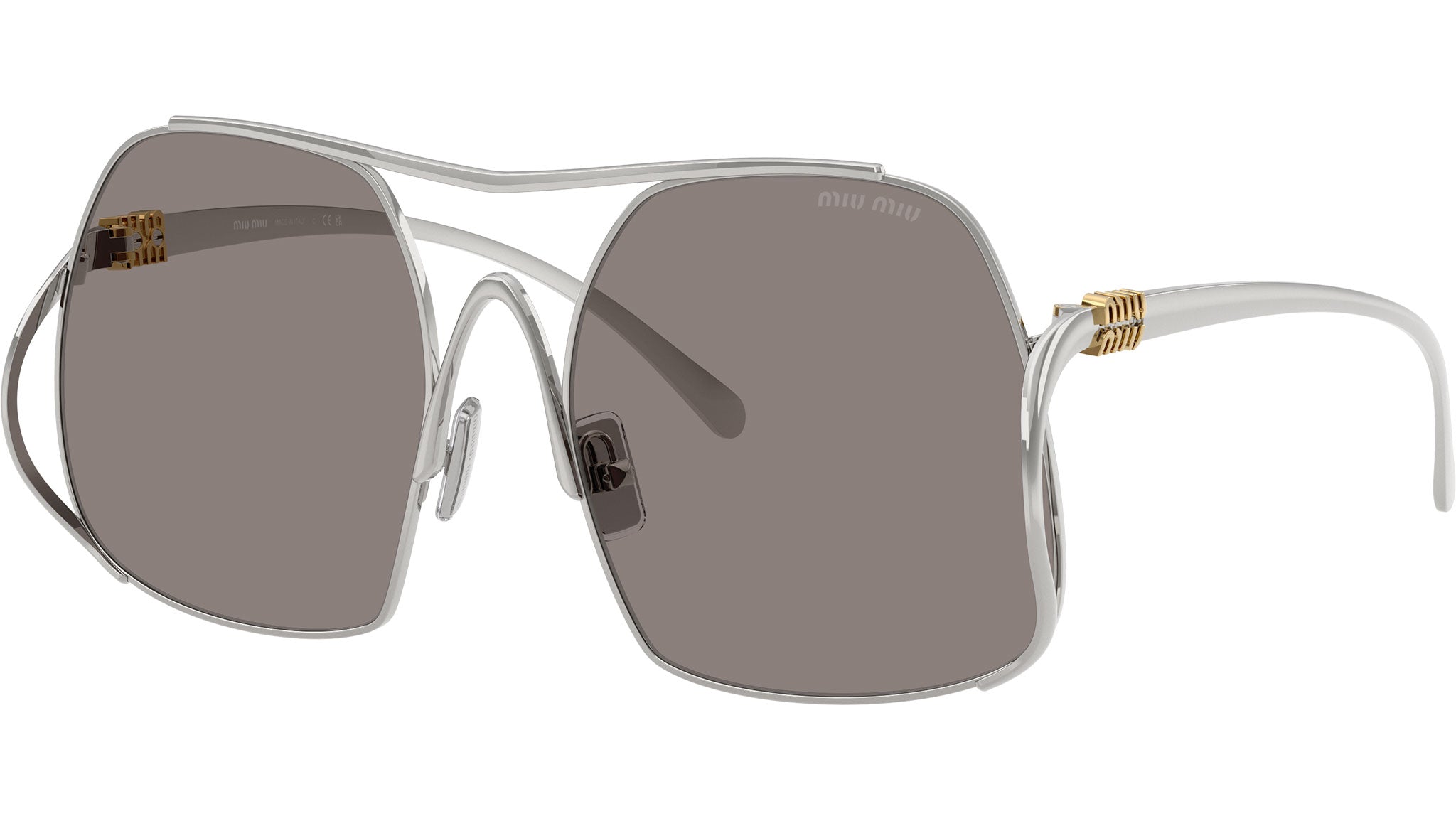 Miu Miu MU A55S 1BC80Q sunglasses for women, featuring silver squared stainless steel frame and dark grey bio polyamide lenses. Adjustable nosepads. Brand line: Fashion Show. Style code: 0MU A55S. Color code: 1BC80Q. Made in Italy. Authorized Miu Miu online reseller. Your glasses will include the original case and accessories and are covered by a 12-month global warranty.