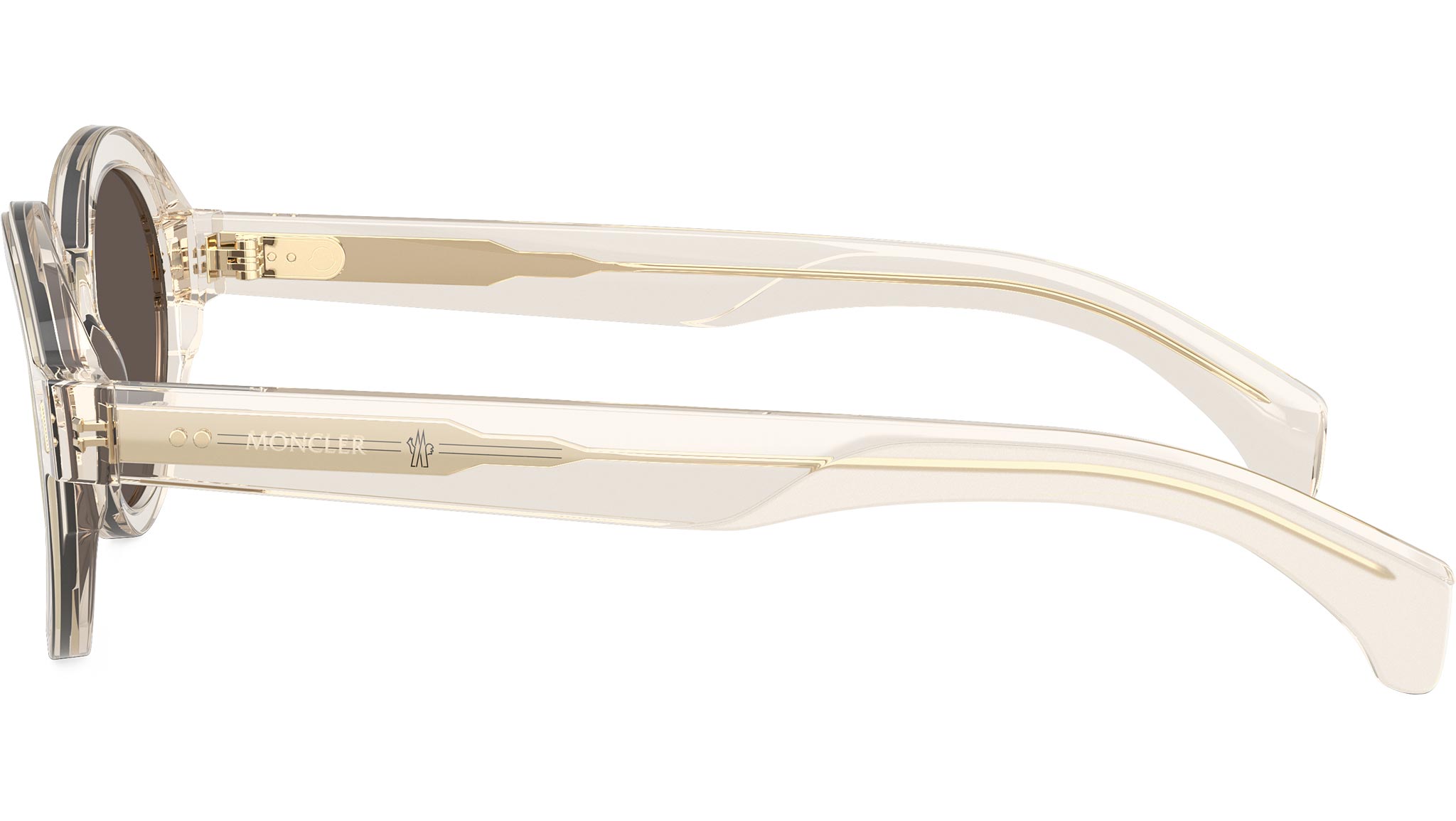 Moncler ME6003 30035A sunglasses for men and woman, featuring transparent butter round acetate frame and light brown mirror gold bio polyamide lenses. High bridge fit. Brand line: Classic. Style code: 0ME6003. Color code: 30035A. Made in Italy. Authorized Moncler online reseller. Your glasses will include the original case and accessories and are covered by a 12-month global warranty.