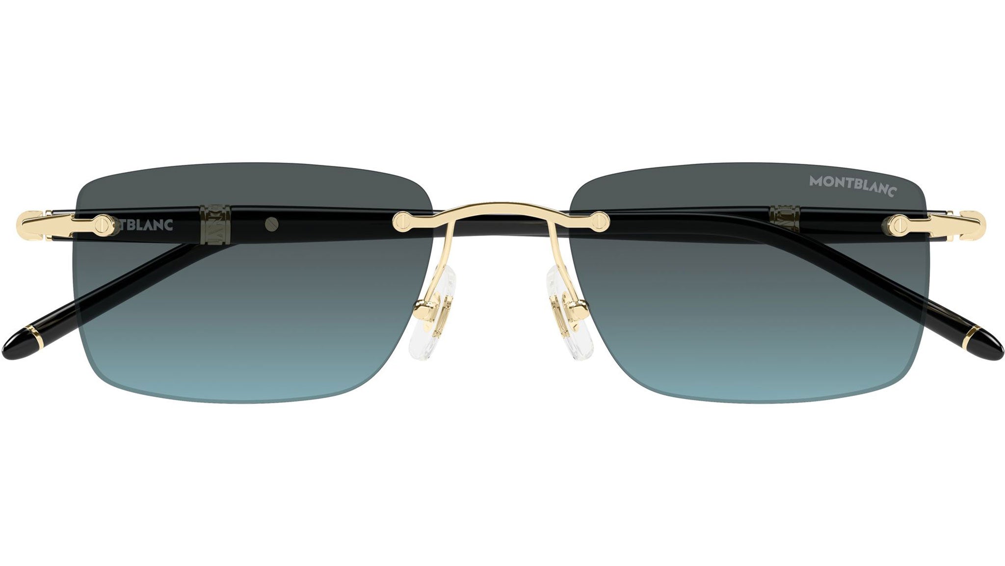 Montblanc MB0344S 010 sunglasses for men, featuring shiny light gold rectangular metal frame and double gradient grey / light blue bio nylon lenses. Brand line: Meisterstück. Style code: MB0344S. Color code: 010. Made in Japan. Authorized Montblanc online reseller. Your glasses will include the original case and accessories and are covered by a 12-month global warranty.