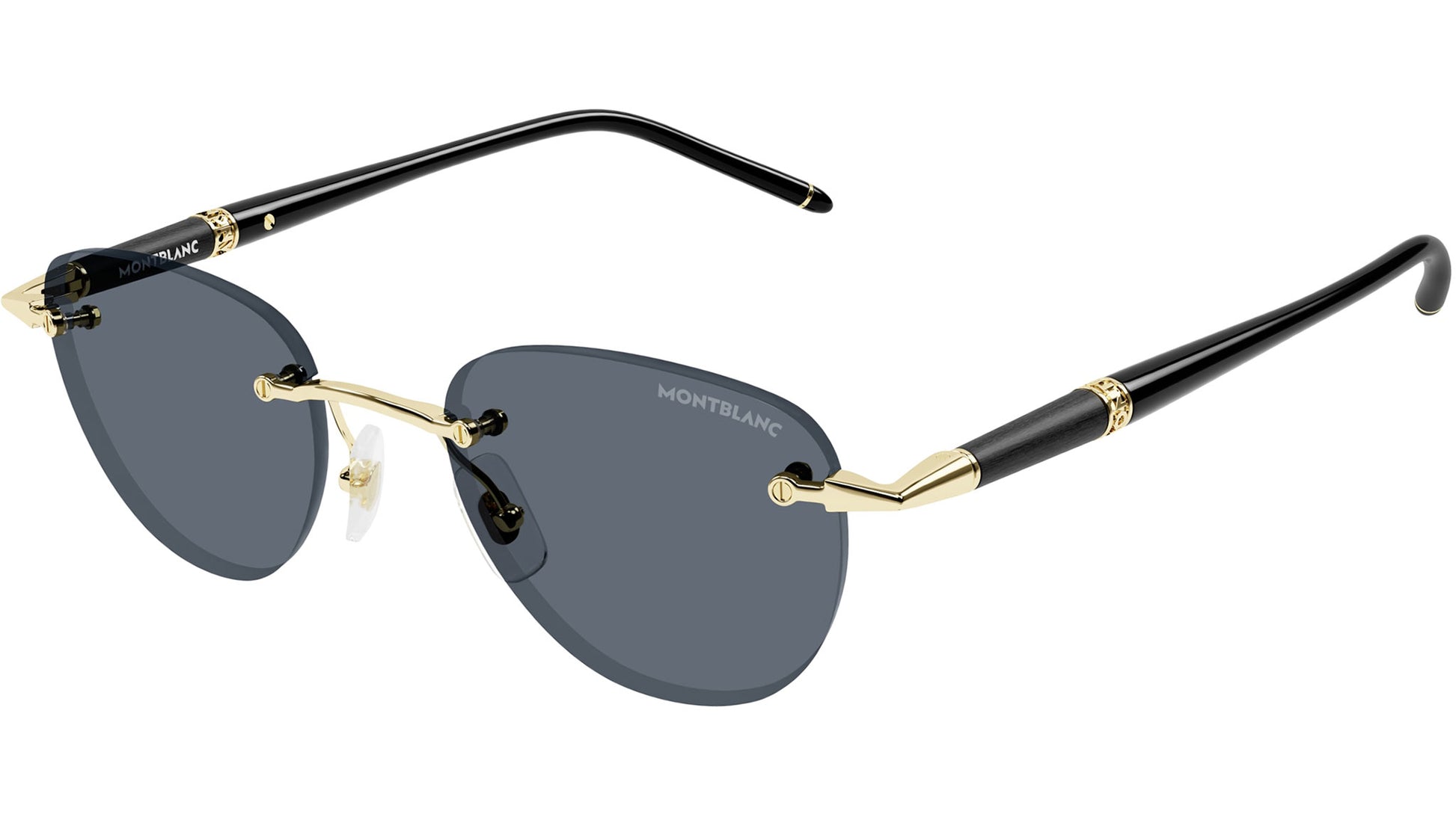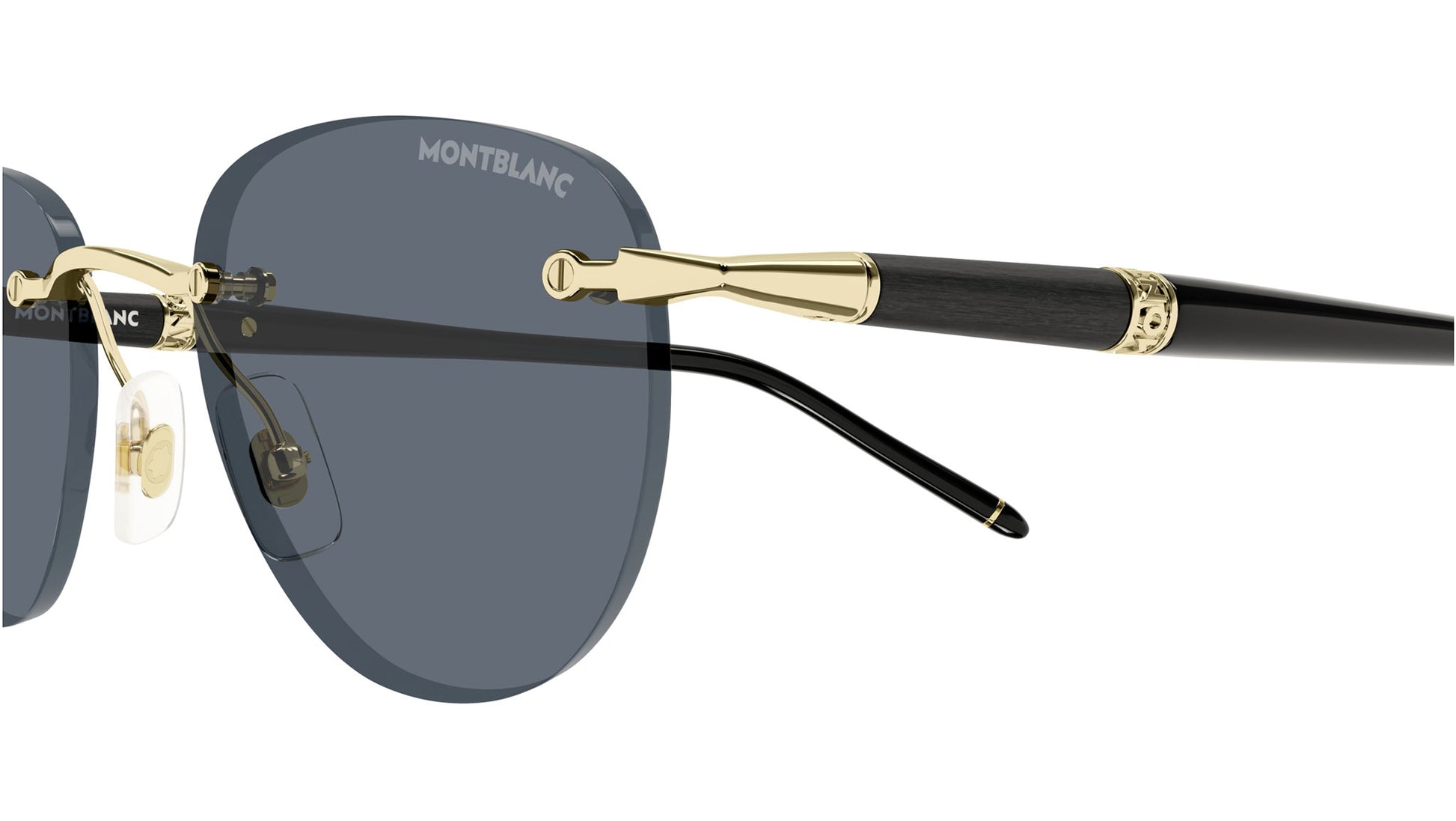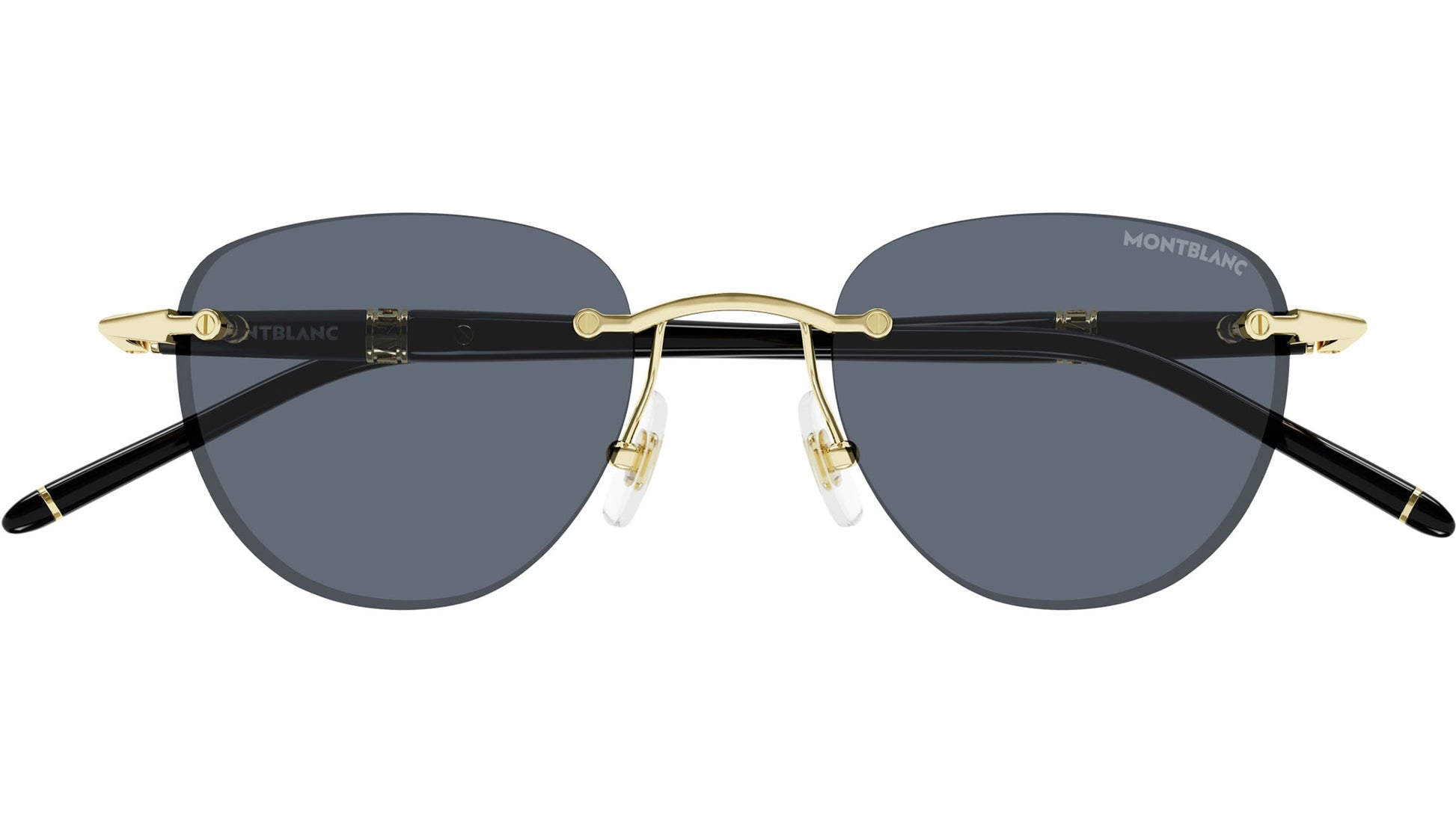 Montblanc MB0412S 001 sunglasses for men, featuring shiny light gold panthos metal frame and solid grey bio nylon lenses. Brand line: Meisterstück. Style code: MB0412S. Color code: 001. Made in Japan. Authorized Montblanc online reseller. Your glasses will include the original case and accessories and are covered by a 12-month global warranty.