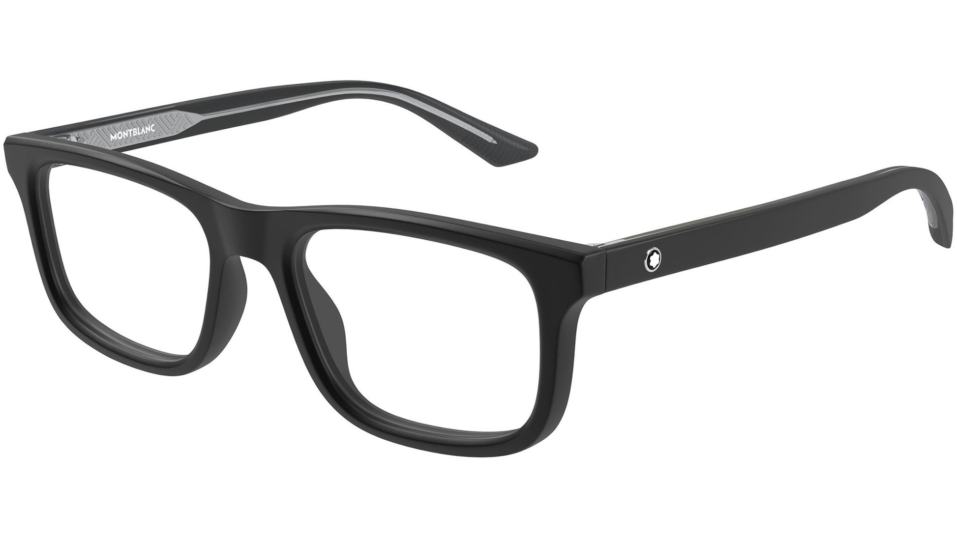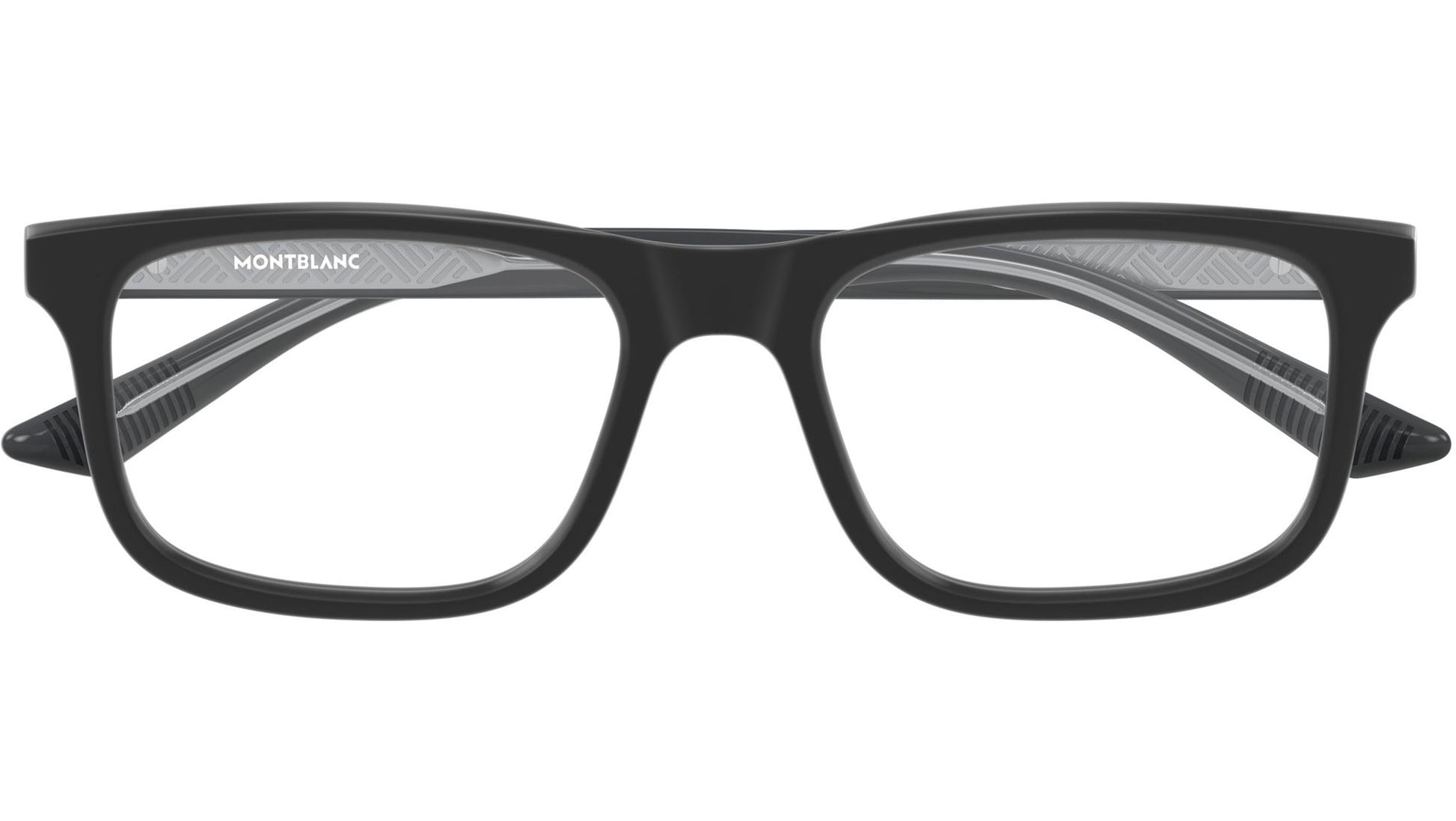 Montblanc MB0457O glasses for men, featuring semi-matte black rectangular recycled acetate frame and demo lenses. Brand line: Snowcap. Style code: MB0457O. Color code: size 57: 007. Size 54: 001. Made in Italy. Authorized Montblanc online reseller. Your glasses will include the original case and accessories and are covered by a 12-month global warranty.
