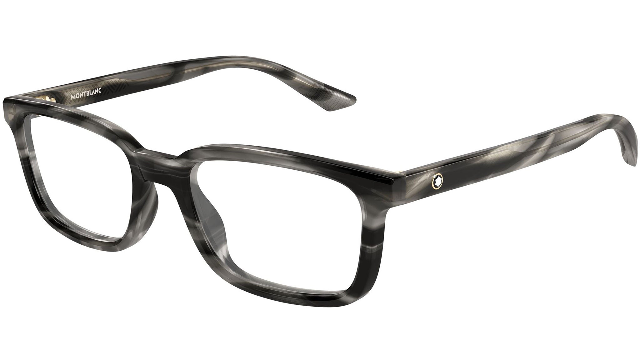 Montblanc MB0458OL glasses for men, featuring shiny grey striated havana rectangular recycled acetate frame and demo lenses. Brand line: Snowcap. Style code: MB0458OL. Color code: size 58: 009. Size 55: 005. Made in Italy. Authorized Montblanc online reseller. Your glasses will include the original case and accessories and are covered by a 12-month global warranty.