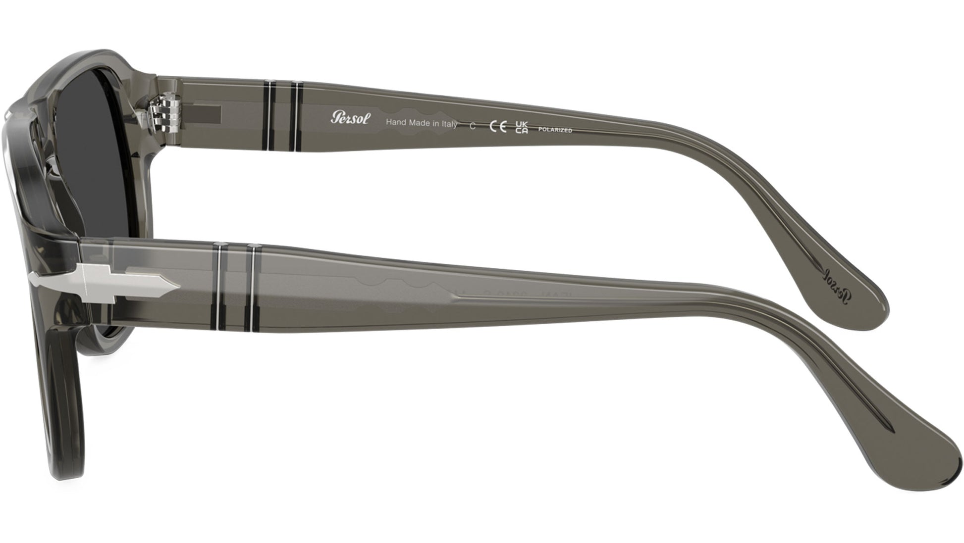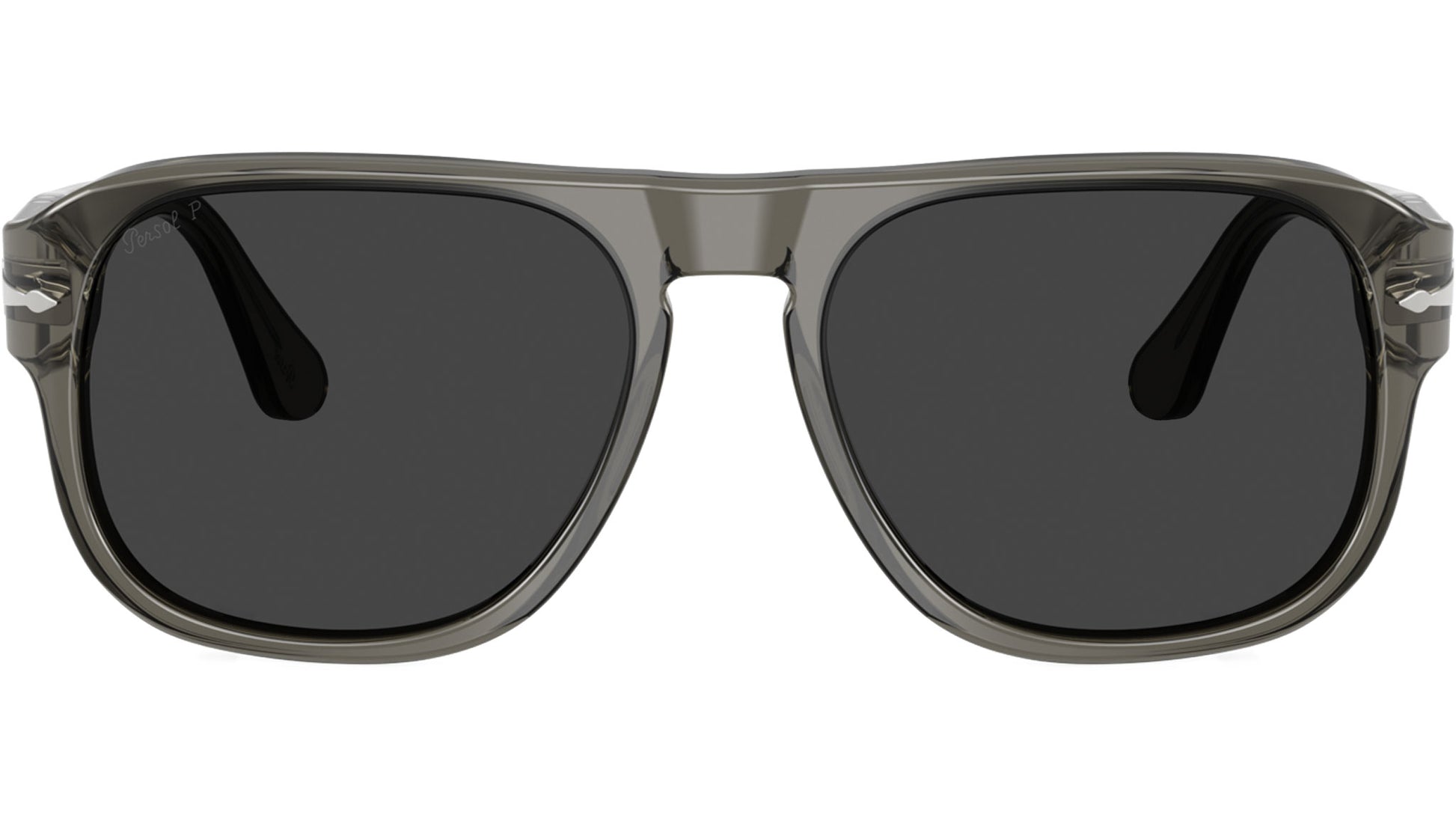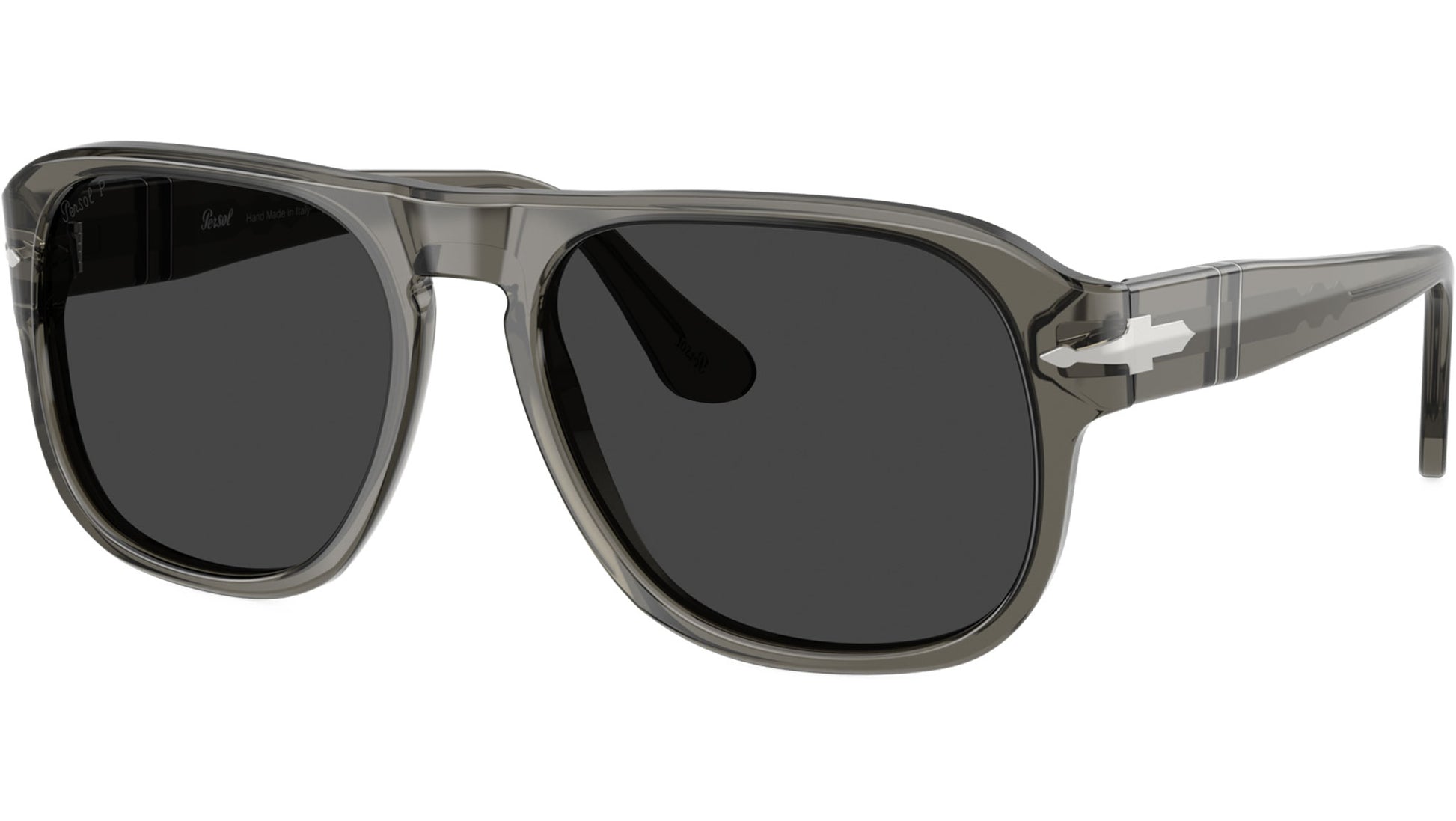 Persol unisex sunglasses model PO3310S featuring smoke full rim acetate frame and base 6 polar black lenses. High bridge fit. Frame line: Icona Officina. Brand code: 0PO3310S. Color code: 110348. Authorised Persol Eyewear Online Reseller. Your glasses will come including the original case and accessories and will be covered by 12 month global warranty.