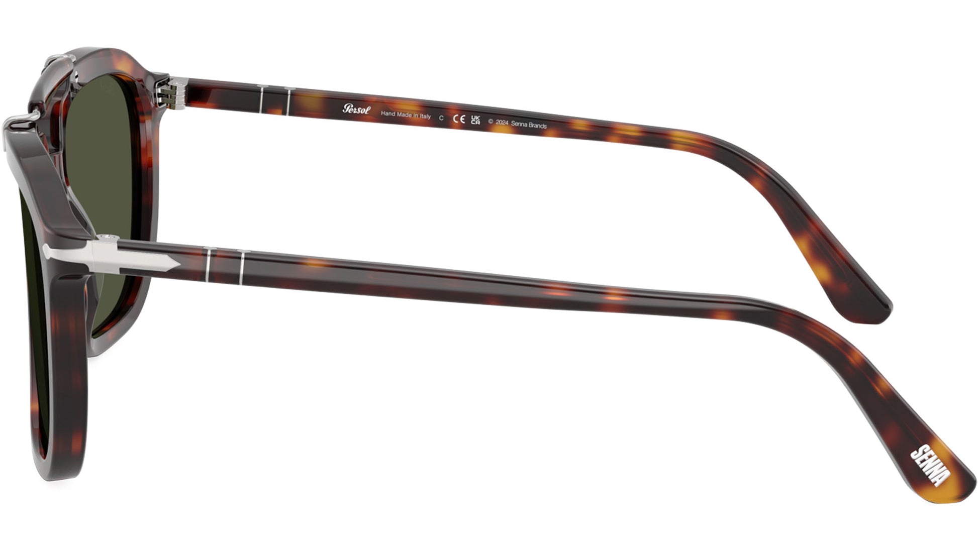 The Persol Senna Series collection celebrates Ayrton Senna's legacy with a modern reinterpretation of his iconic style. Inspired by an archive model he wore and created in collaboration with Netflix for the new series dedicated to the Formula 1 champion, these sunglasses combine elegance, charisma, and timeless design. The teardrop silhouette, offered in a rich palette of colours, pays tribute to the golden age of racing, while authentic details like the sweat bar and custom temple tips featuring the Persol and Senna Series logos evoke the bold spirit of the legend. Each model comes with an exclusive case that reflects the elegance of racing cars and the unmistakable style of the champion. Persol unisex sunglasses model PO 0203S featuring havana full rim acetate frame and base 6 green lenses. High bridge fit. Frame line: Sartoria. Brand code: 0PO0203S. Color code: 24/31. Authorised Persol Eyewear Online Reseller. Your glasses will come including the original case and accessories and will be covered by 12 month global warranty.