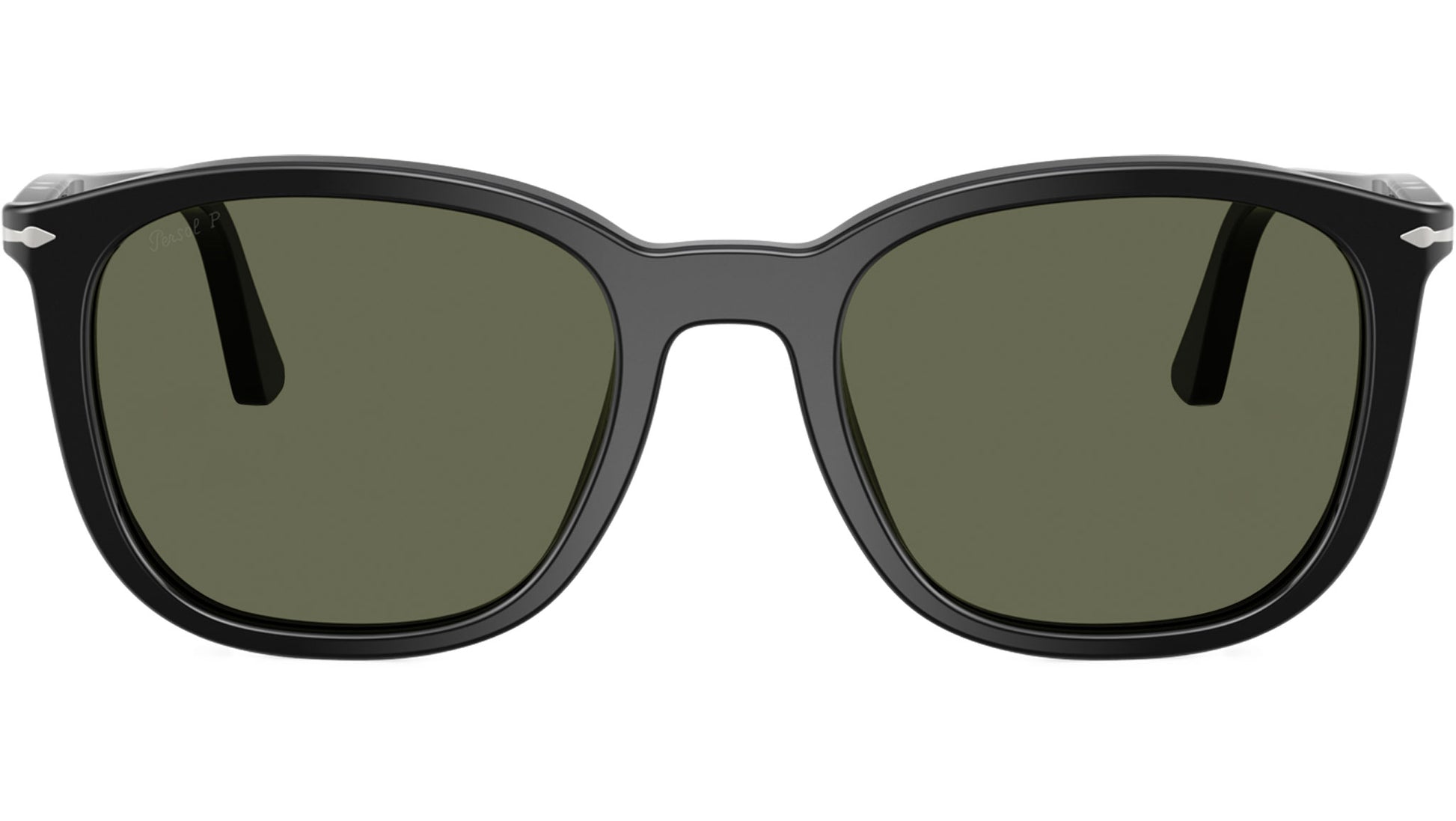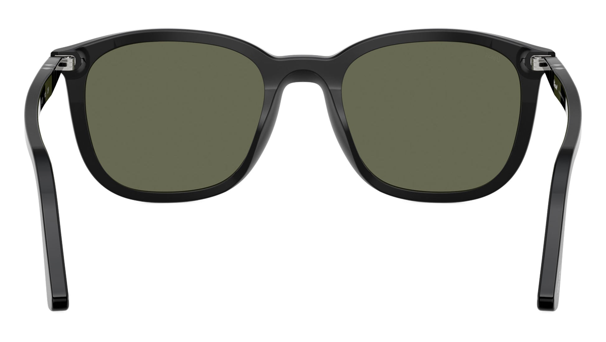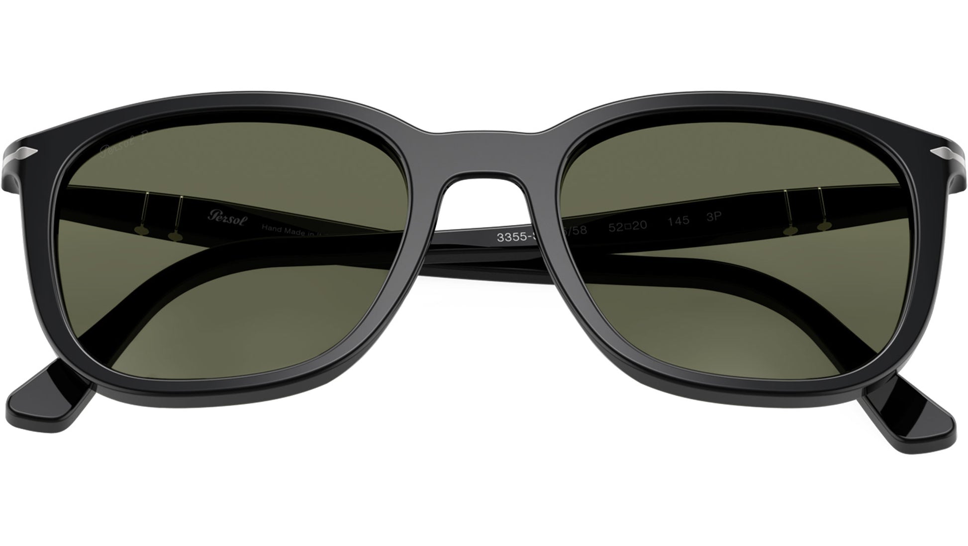 Persol unisex sunglasses model PO3355S featuring black full rim acetate frame and base 4.25 polar green lenses. High bridge fit. Frame line: Galleria. Brand code: 0PO3355S. Color code: 95/58. Authorised Persol Eyewear Online Reseller. Your glasses will come including the original case and accessories and will be covered by 12 month global warranty.
