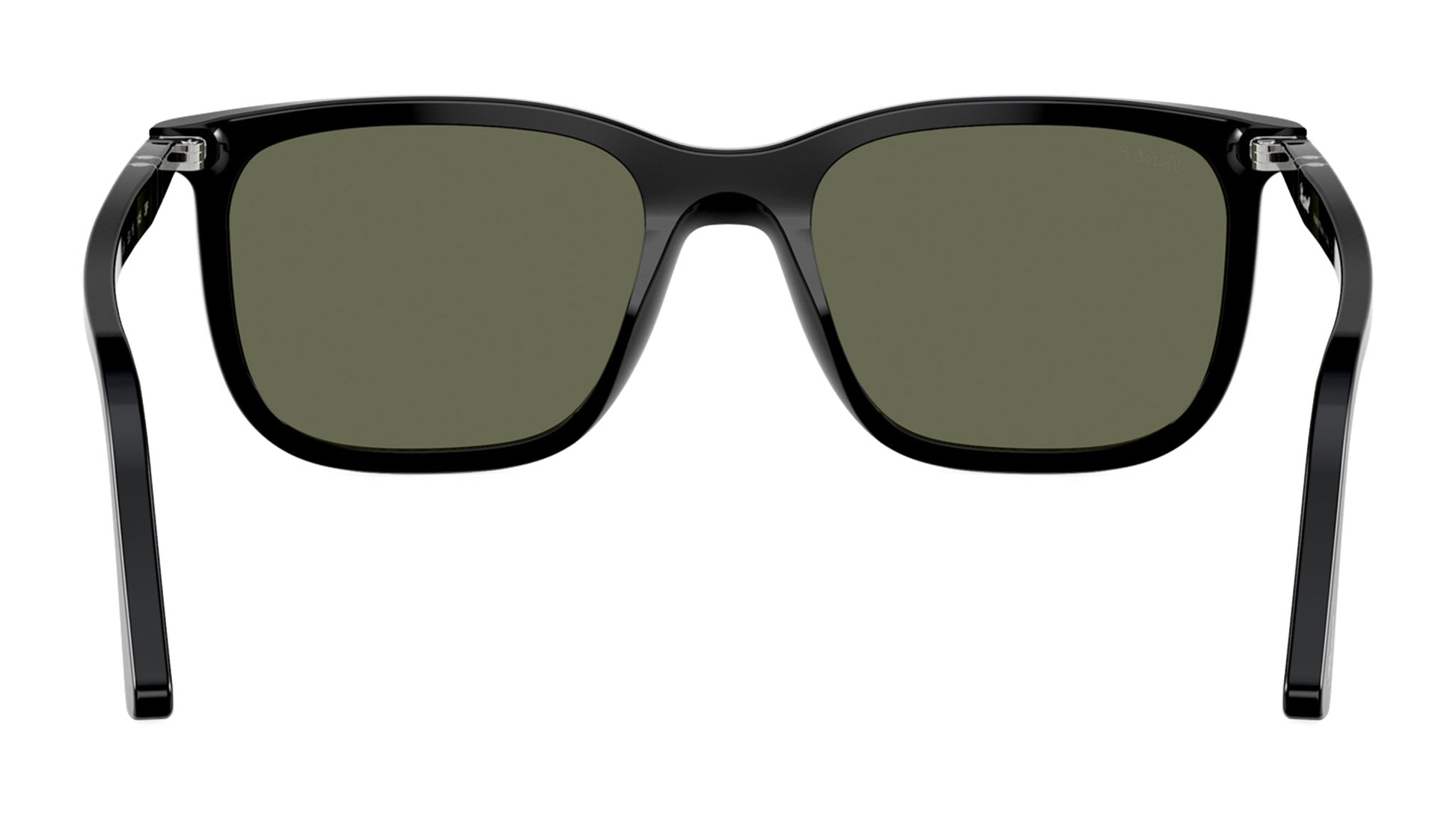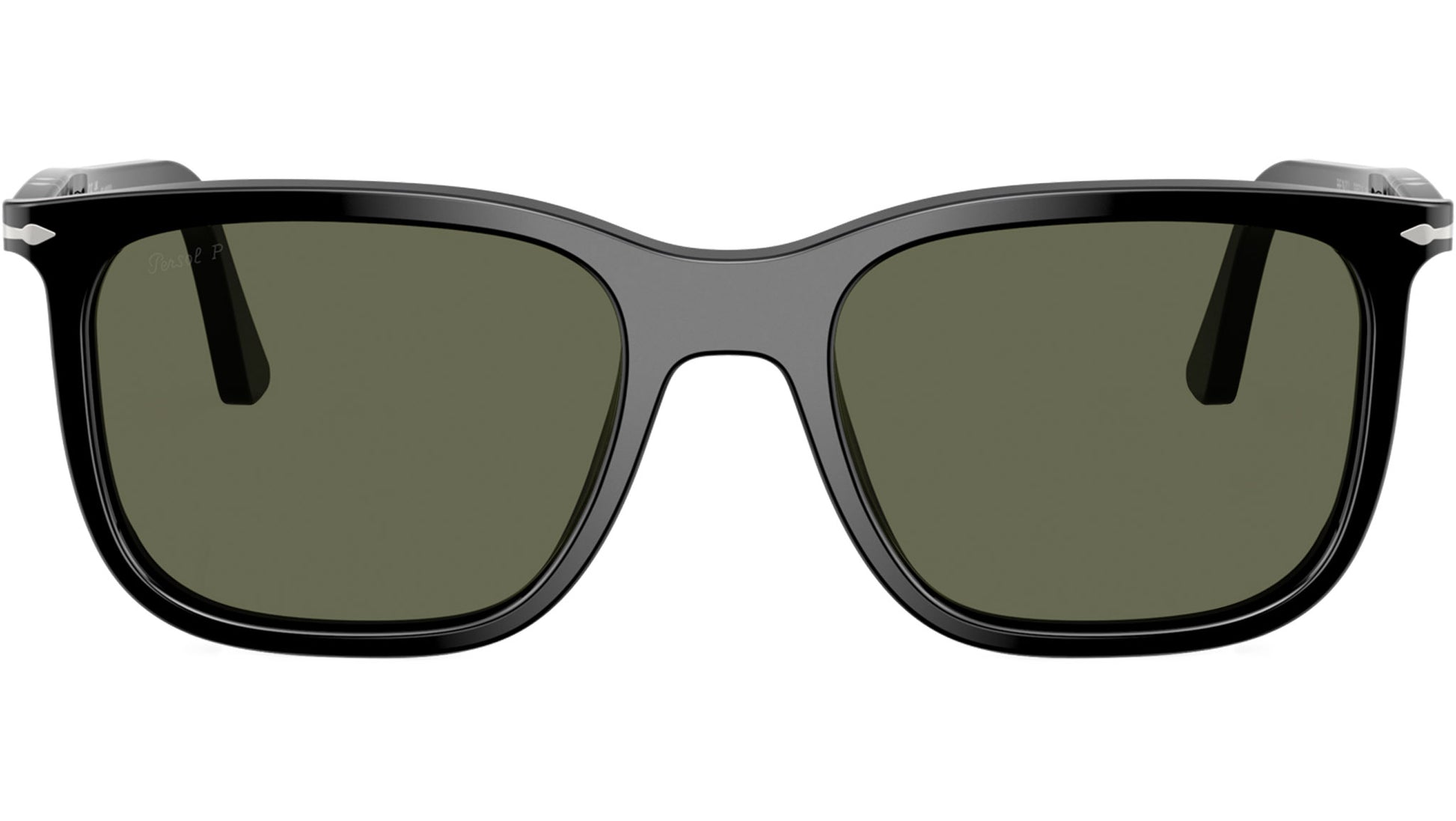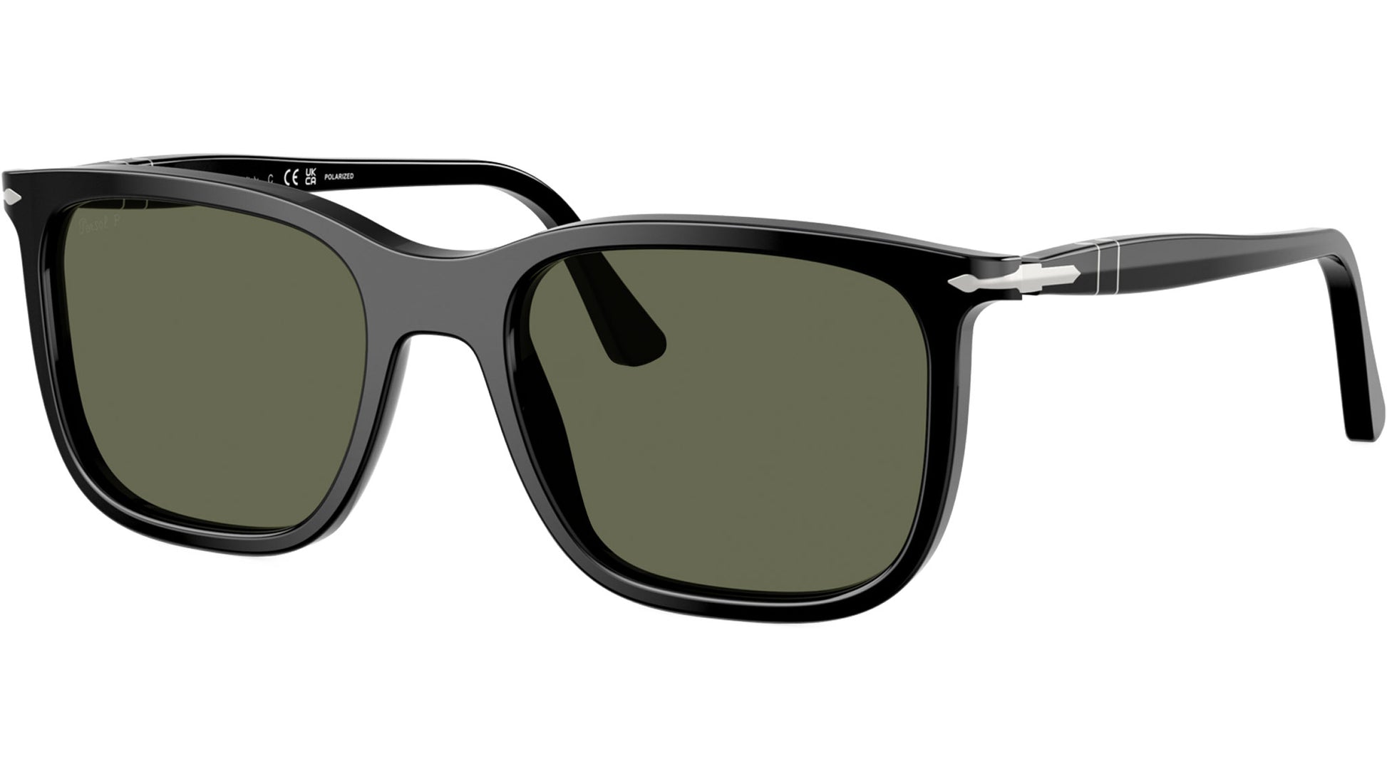 Persol unisex sunglasses model PO3357S featuring black full rim acetate frame and base 4.25 polar green lenses. High bridge fit. Frame line: Icona Galleria. Brand code: 0PO3357S. Color code: 95/58. Authorised Persol Eyewear Online Reseller. Your glasses will come including the original case and accessories and will be covered by 12 month global warranty.