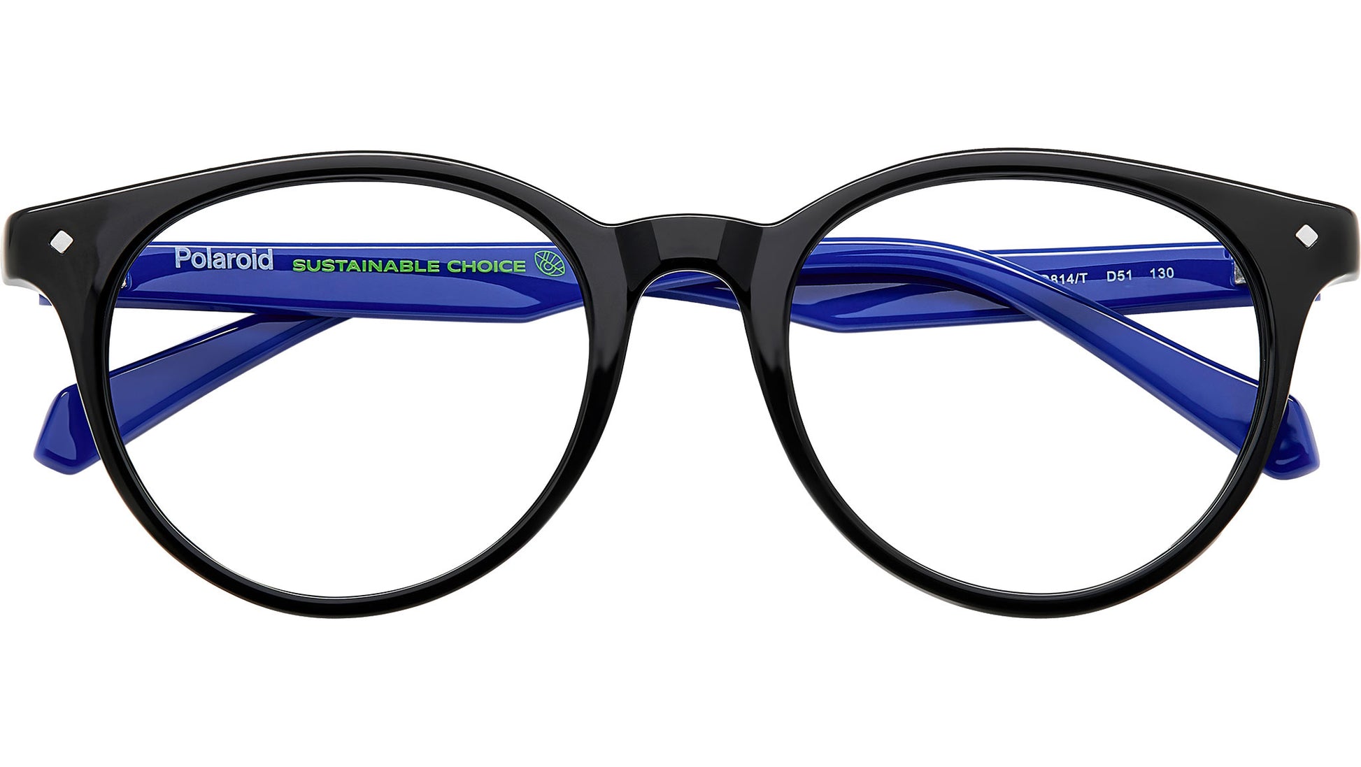 Polaroid Kids PLD D814/T D51 glasses for juniors, featuring black blue panthos eco polyamide frame and demo lens lenses. Brand line: Kids. Style code: 108572. Color code: D51. Authorized Polaroid Kids online reseller. Your glasses will include the original case and accessories and are covered by a 12-month global warranty.