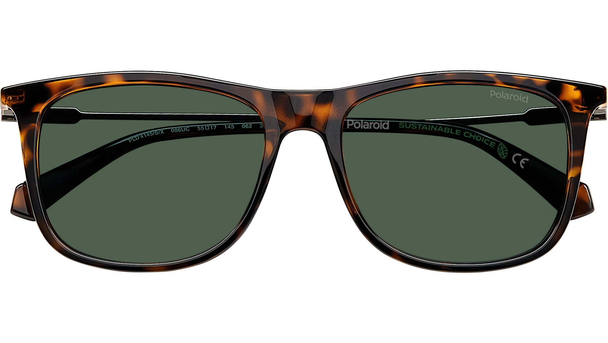 Polaroid PLD 4145/S/X 086 UC sunglasses for men, featuring havana rectangular eco co-polyester frame and green polarized lenses. The rectangular front of these Rx-able Polaroid sunglasses is made of Tritan renew, a sustainable material that the brand chose to protect the environment. These men's glasses, featuring slim metal temples with the brand's iconic contrast-coloured tips, are designed for any occasion. Brand line: Essential. Style code: 205730. Color code: 086 UC. Authorized Polaroid online reseller. Your glasses will include the original case and accessories and are covered by a 12-month global warranty.