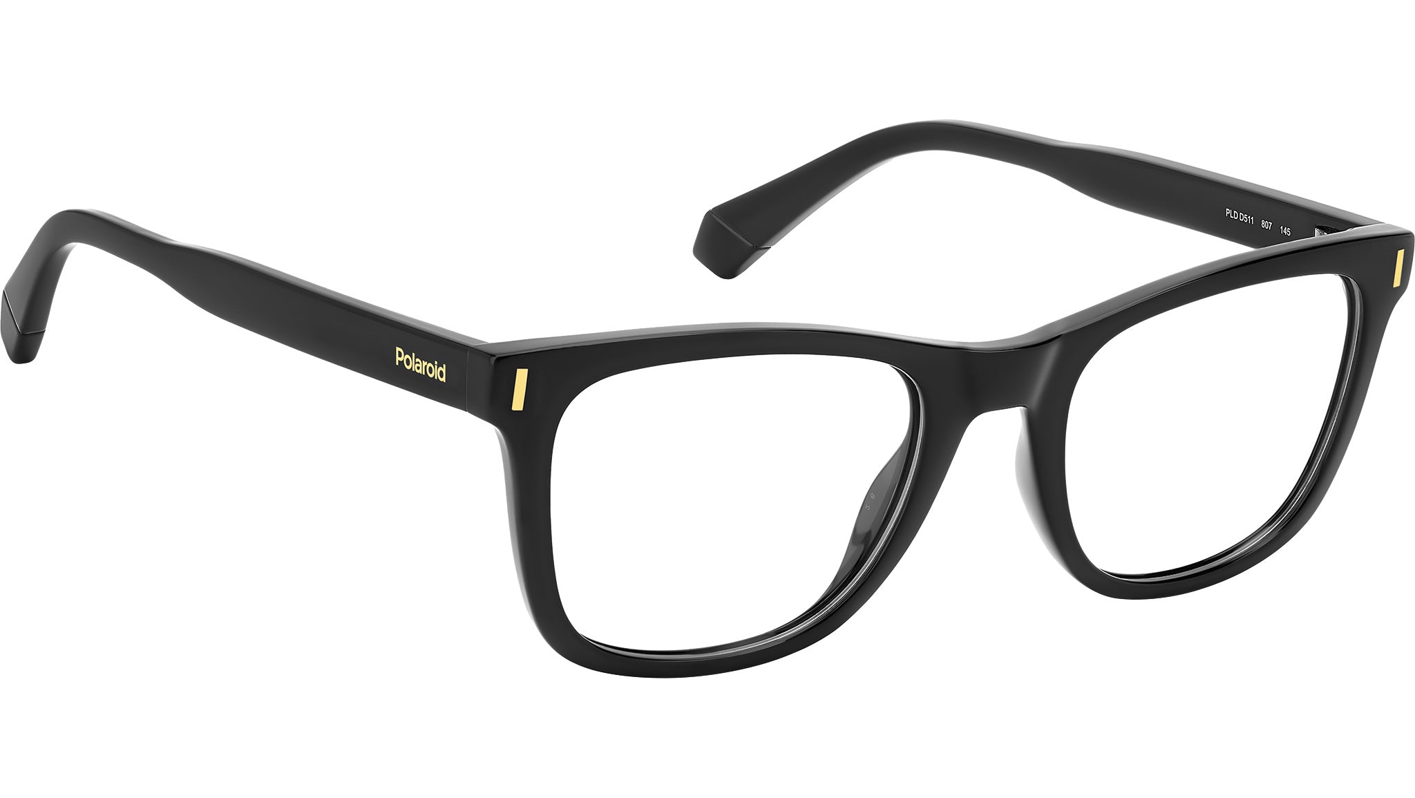 Polaroid PLD D511 807 glasses for women, featuring black rectangular eco co-polyester frame and demo lens lenses. Polaroid brings joy to everyday wardrobes thanks to these eyeglasses with a sustainable soul. The structure is made of eco-polyester - a material chosen by the brand to protect the environment - and comes in two frame sizes for a perfect fit. The square shape with soft edges, the rivets on the front and the contrast accent on the end tips complete this bubbly, feminine accessory. Brand line: Cool. Style code: 107639. Color code: 807. Authorized Polaroid online reseller. Your glasses will include the original case and accessories and are covered by a 12-month global warranty.