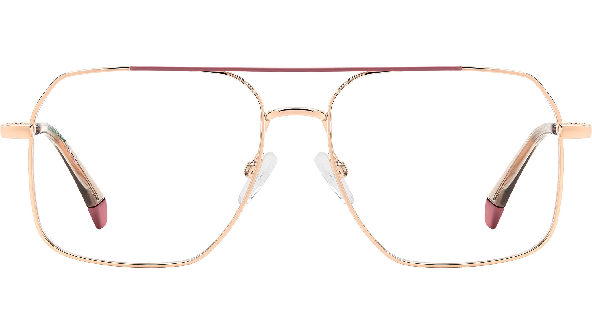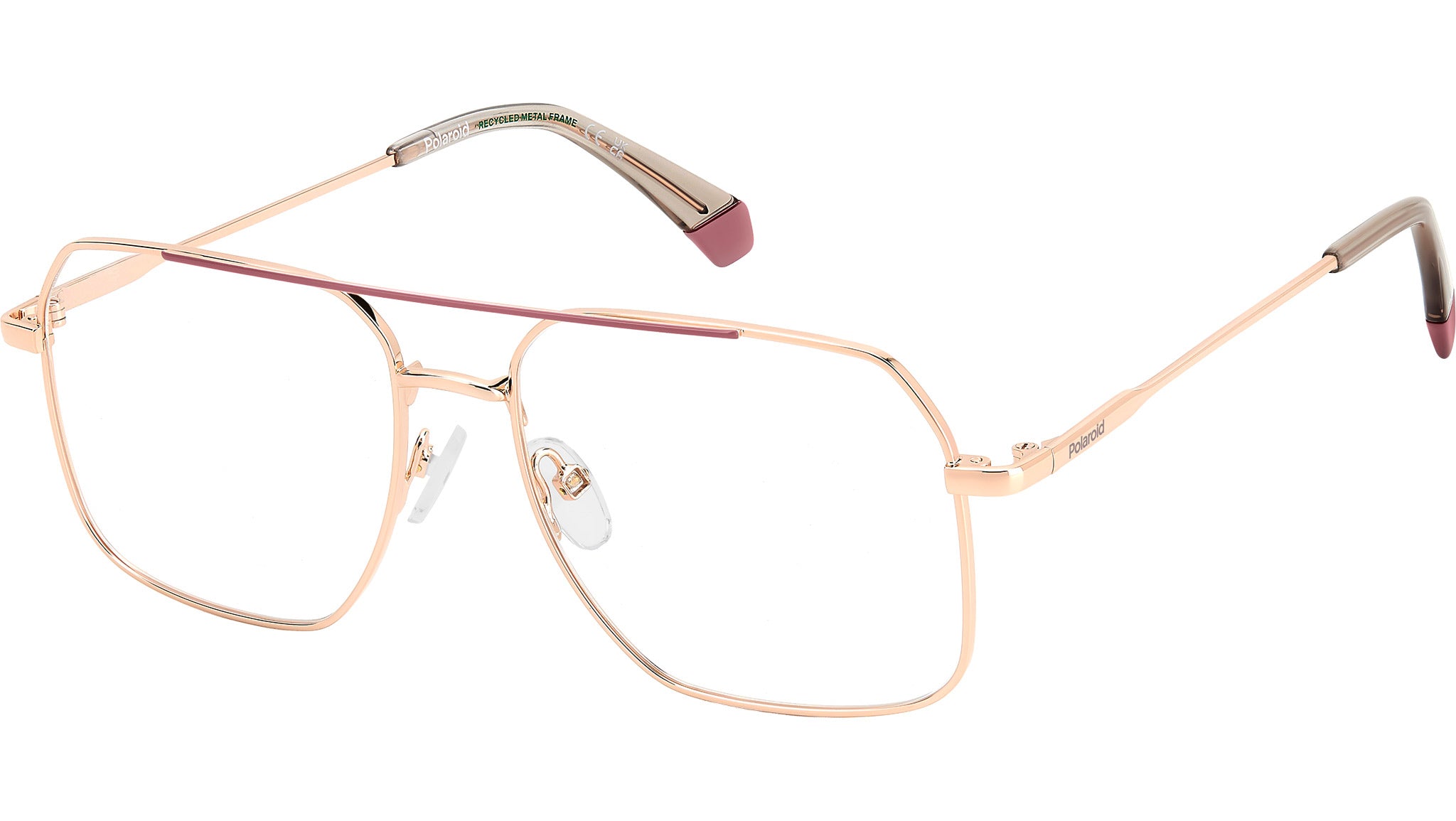 Polaroid PLD D554 EYR glasses for men and women, featuring gold pink rectangular metal frame and demo lens lenses. On-trend style is easy with these unisex glasses by Polaroid. They frame the eyes with a geometric front, perfect for men and women, as the genderless trend dictates. There are even versions with an enamel-coated top bar on the double bridge, coordinated with the end tips for a fun dash of colour. Polaroid has crafted their impeccable shapes from recycled materials, giving rise to glasses which are light on the face – and on the environment. Adjusting the nose pads ensures an even more comfortable fit. Brand line: Cool. Style code: 109340. Color code: EYR. Authorized Polaroid online reseller. Your glasses will include the original case and accessories and are covered by a 12-month global warranty.