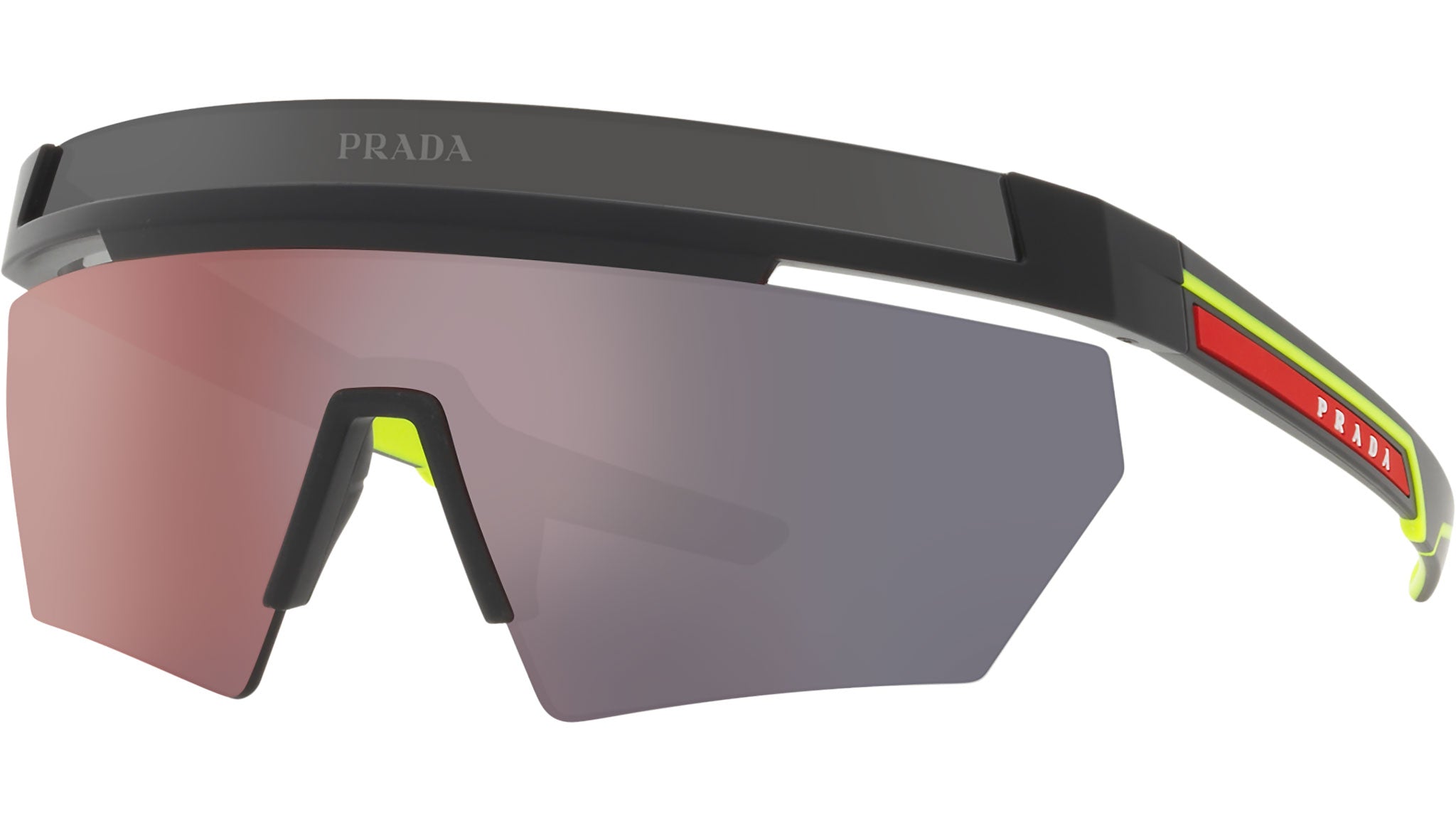 Prada Linea Rossa sunglasses model PS01YS matte black frame variant, color code 17G08F with dark grey mirror blue / red lens. Prada Linea Rossa Sun Collection conveys an everyday casual style with all the quality and craftsmanship of the Prada brand.