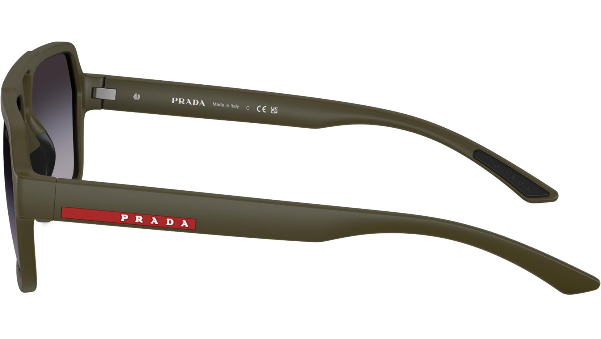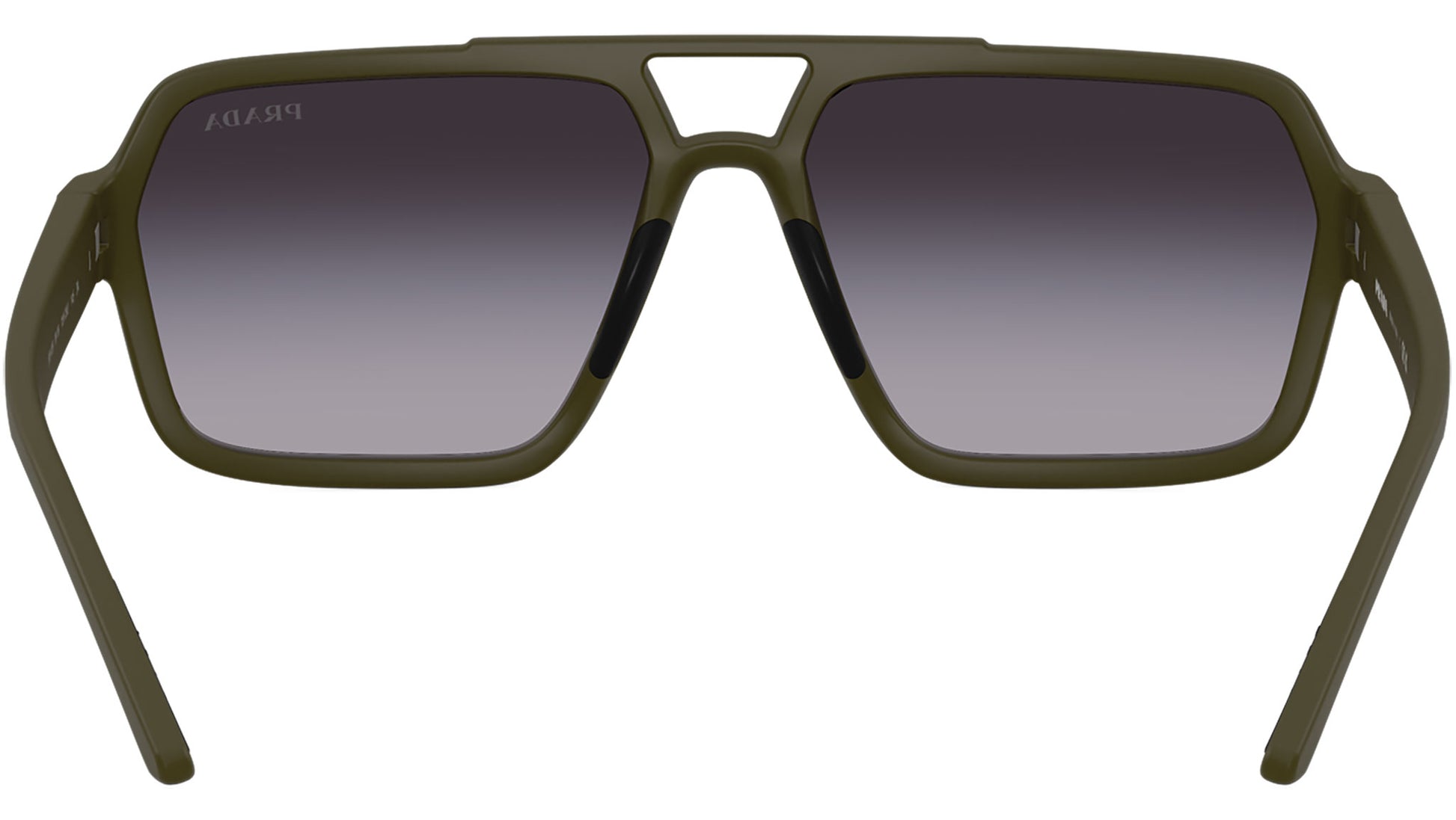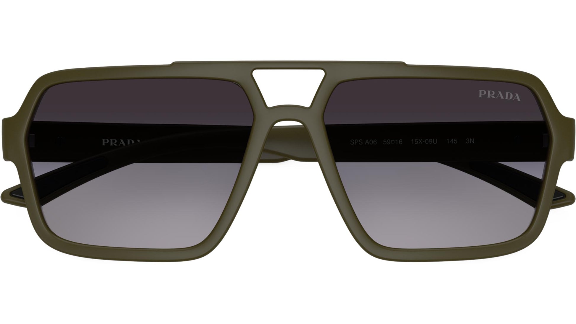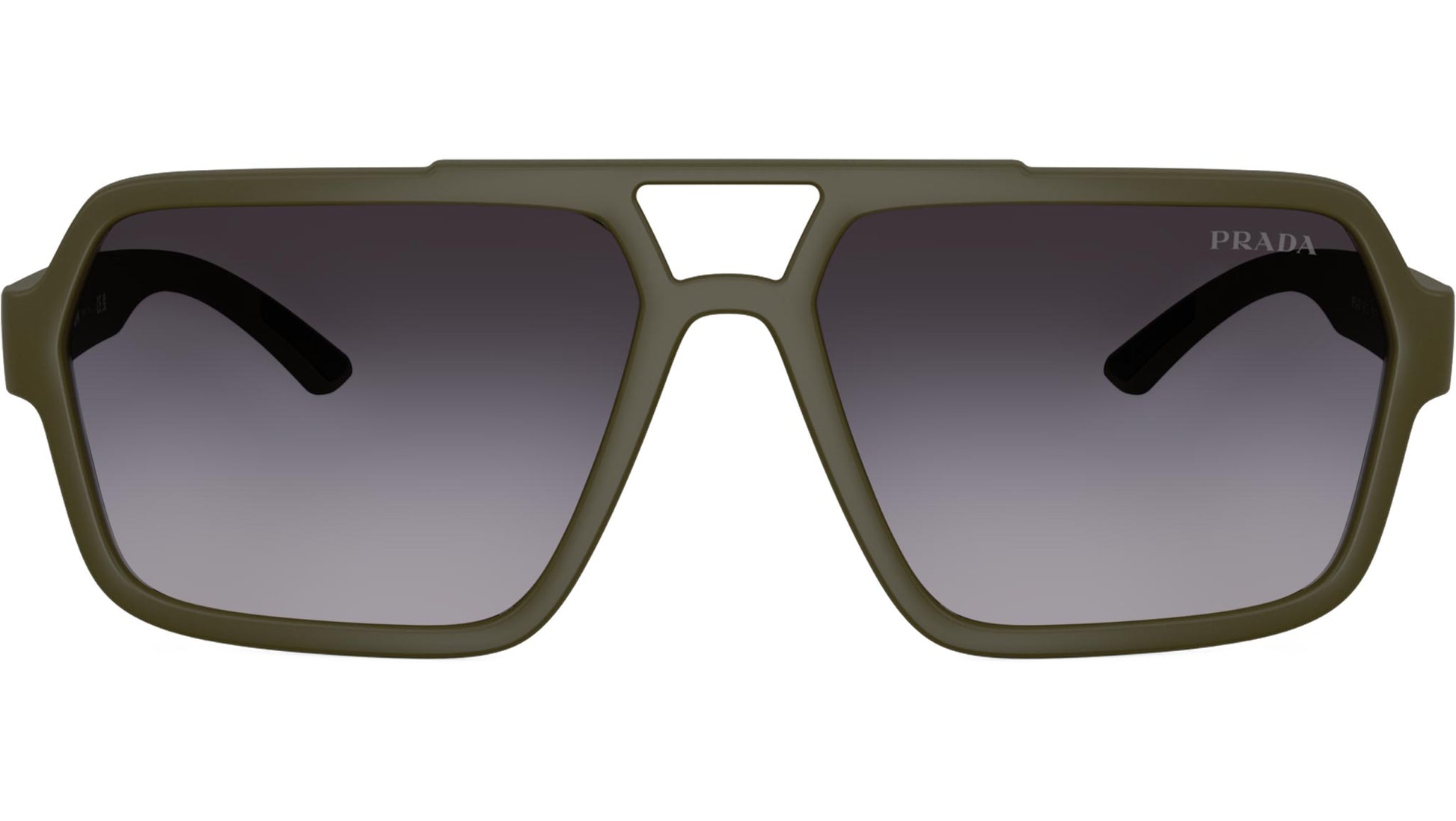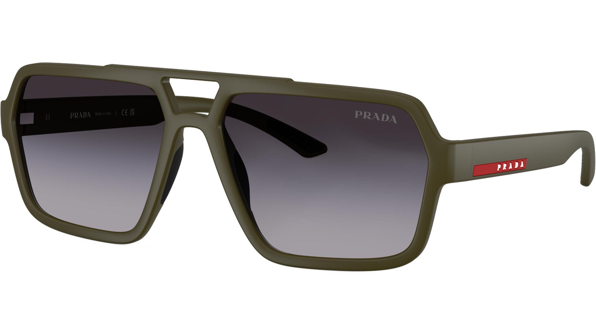 Prada Linea Rossa PS A06S 15X09U sunglasses for men, featuring matte green pilot injection frame and gradient grey polyamide lenses. Universal fit. Brand line: Lifestyle. Style code: PSA06S. Color code: 15X09U. Made in Italy. Authorized Prada Sport online reseller. Your glasses will include the original case and accessories and are covered by a 12-month global warranty.