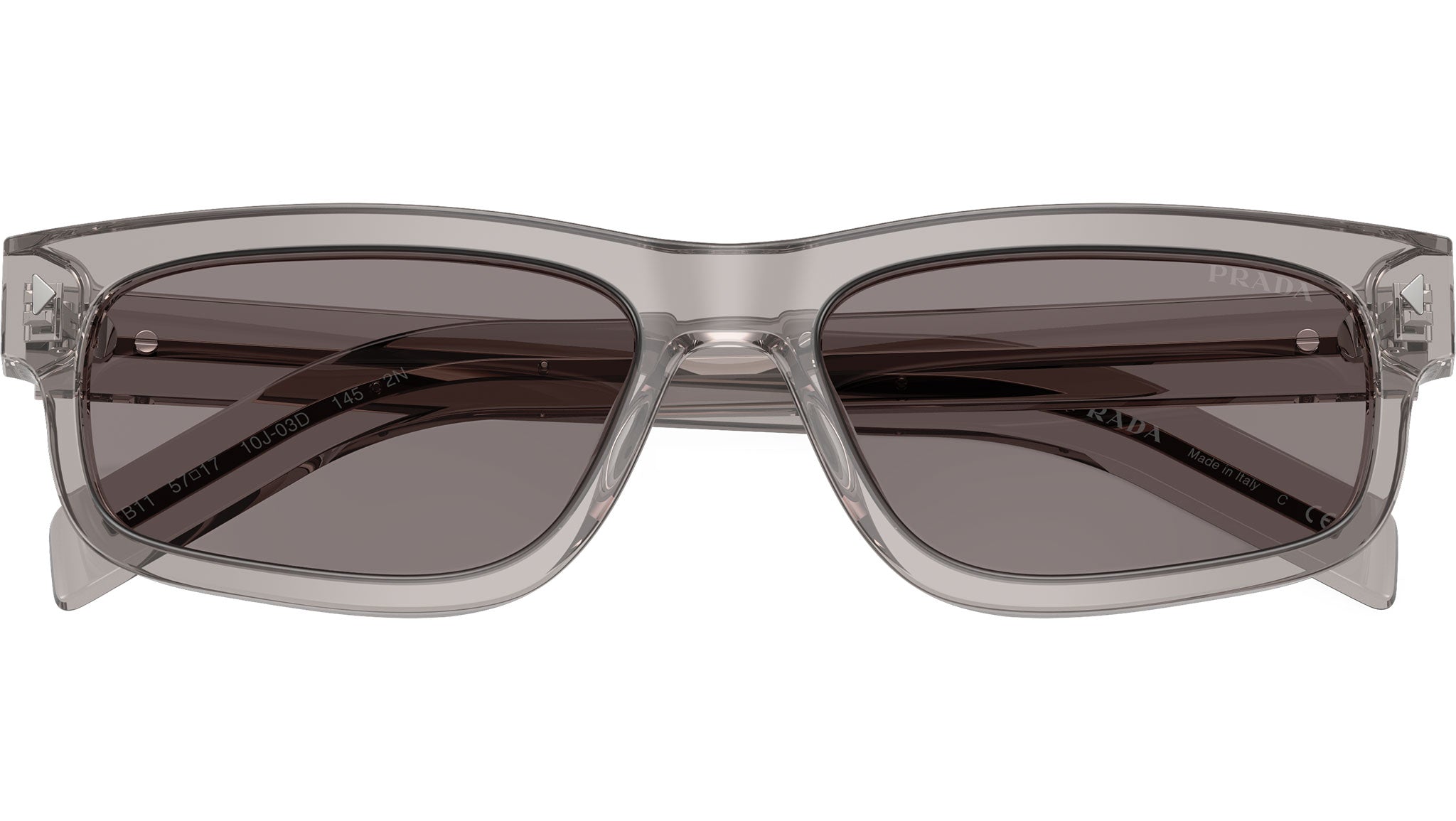 Prada PR B11S 10J03D sunglasses for men, featuring hematite rectangular acetate frame and grey glass lenses. High bridge fit. Brand line: Signature. Style code: PRB11S. Color code: 10J03D. Made in Italy. Authorized Prada online reseller. Your glasses will include the original case and accessories and are covered by a 12-month global warranty.