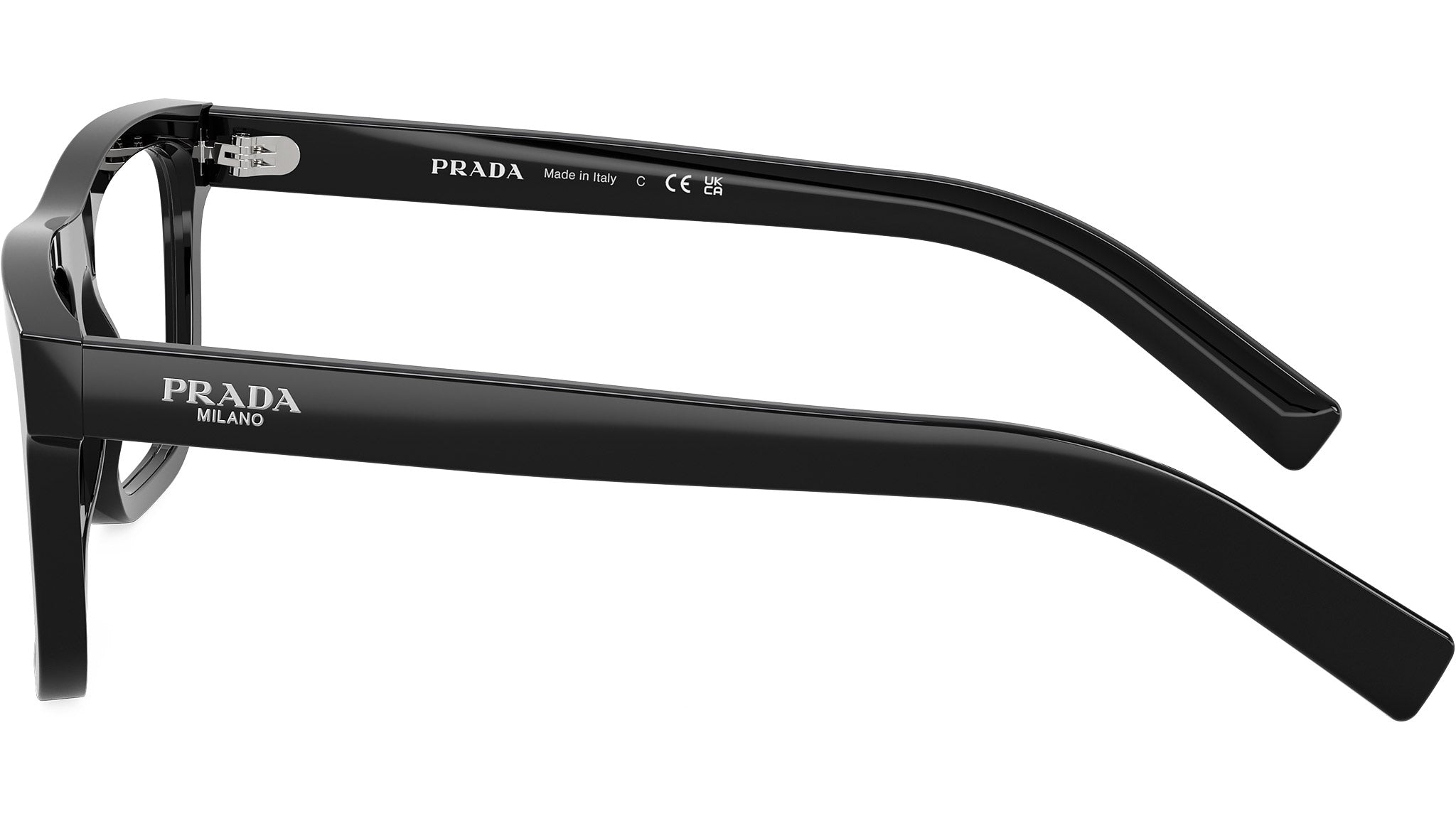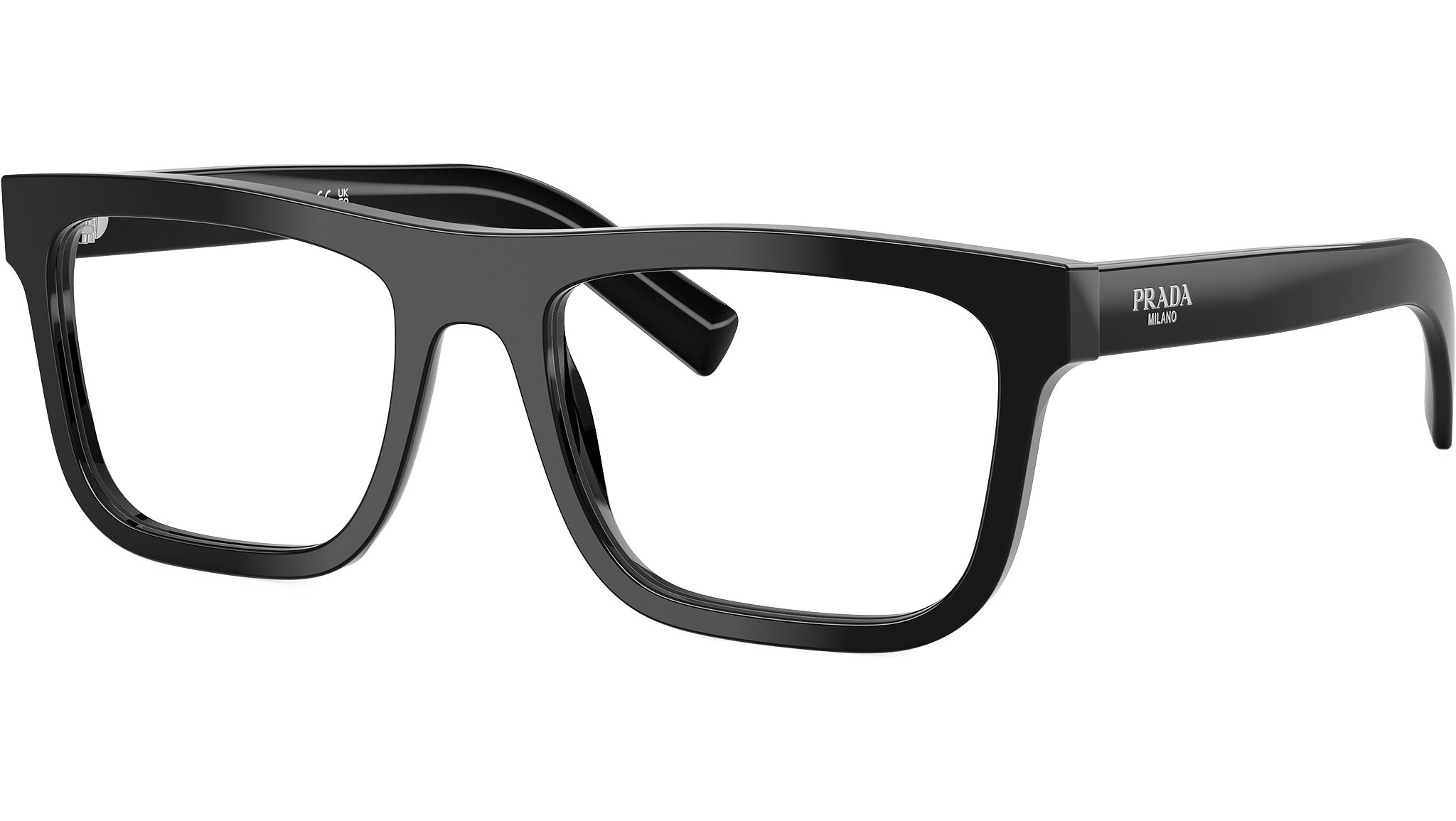 Prada PR C03V 16K1O1 glasses for men, featuring black d-frame acetate frame and demo lens. High bridge fit. Brand line: Essential. Style code: PRC03V. Color code: 16K1O1. Made in Italy. Authorized Prada online reseller. Your glasses will include the original case and accessories and are covered by a 12-month global warranty.