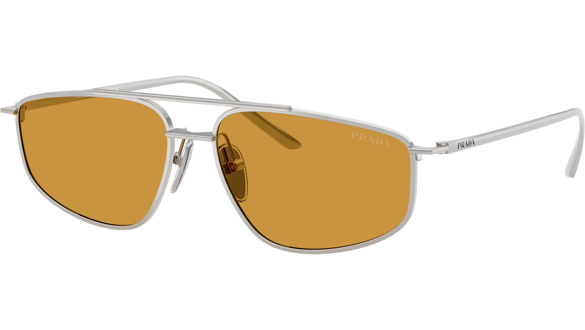 Prada PR C51S 1BC50P sunglasses for women, featuring silver d-frame metal frame and dark honey bio polyamide lenses. Adjustable nosepads. Brand line: Essential. Style code: PRC51S. Color code: 1BC50P. Made in Italy. Authorized Prada online reseller. Your glasses will include the original case and accessories and are covered by a 12-month global warranty.