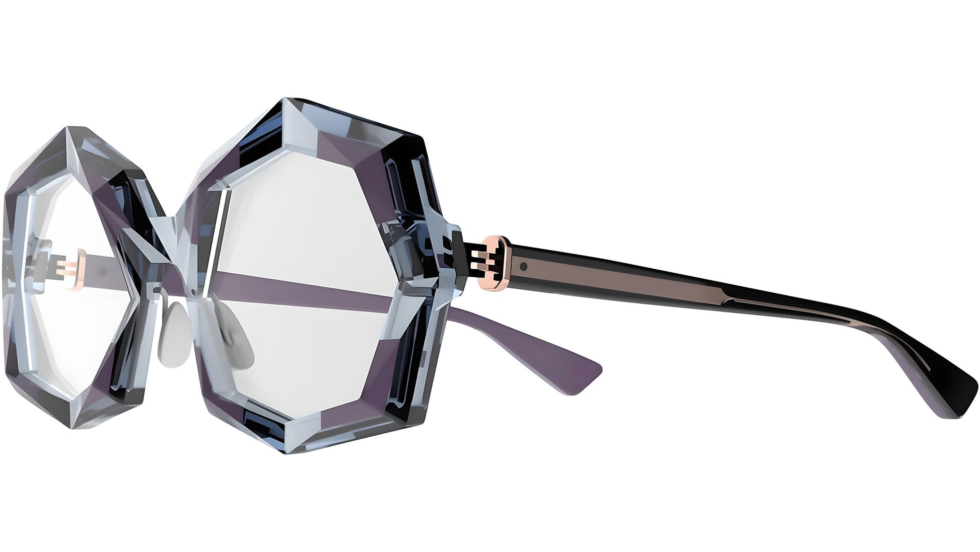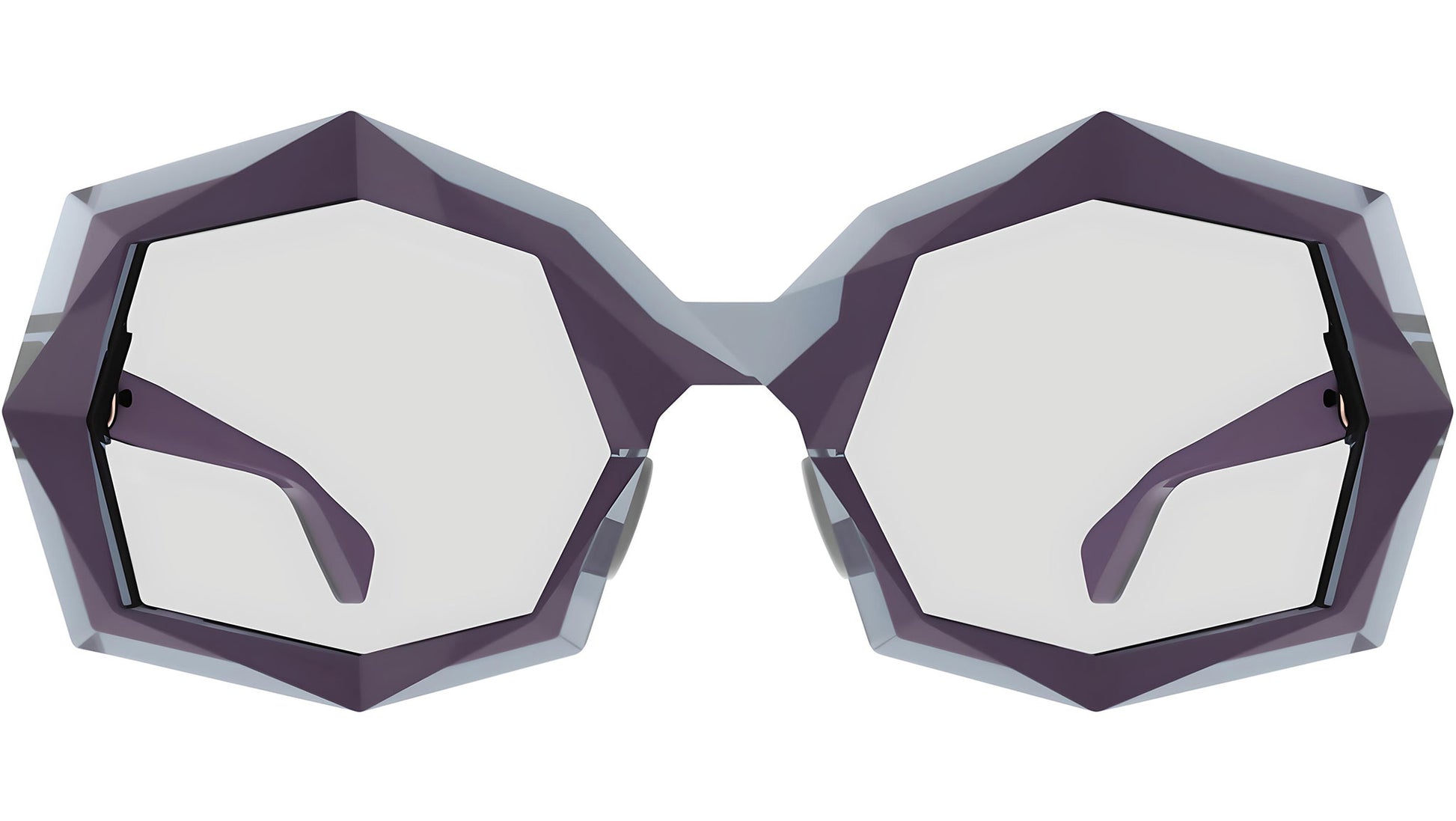Pugnale Eyewear sunglasses model P427V Journey color code 34 in purple blue. Full rim geometric acetate frame with demo lens. Fate Loves the Fearless. The brand's identifying logo proudly marks the Priscilla line of Pugnale Eyewear. The woman is a diamond, multifaceted in every aspect. She embodies strength and sweetness, tenacity and courage, perseverance and charisma - adjectives that converge to form a singular expression of beauty. Vivid and radiant colors blend with femininity in iconic shapes, reimagined in the way Pugnale Eyewear uniquely appreciates, characterized by boldness and high design content.