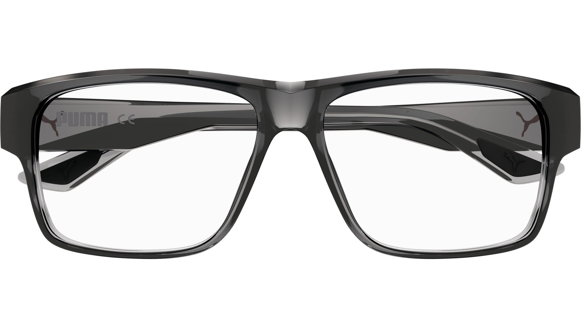 Puma Active optical collection model PU0408O color code 003 featuring shiny transparent dark grey frame and grey temple. Sports company Puma delivers a new eyewear collection, which is inspired by the athletic spirit and relentless energy at the core of its design vision. Puma optical frames merge heritage and innovation in a comprehensive offer of high-performance and lifestyle frames, for those who see beyond trends and challenge the norm to move things forward.