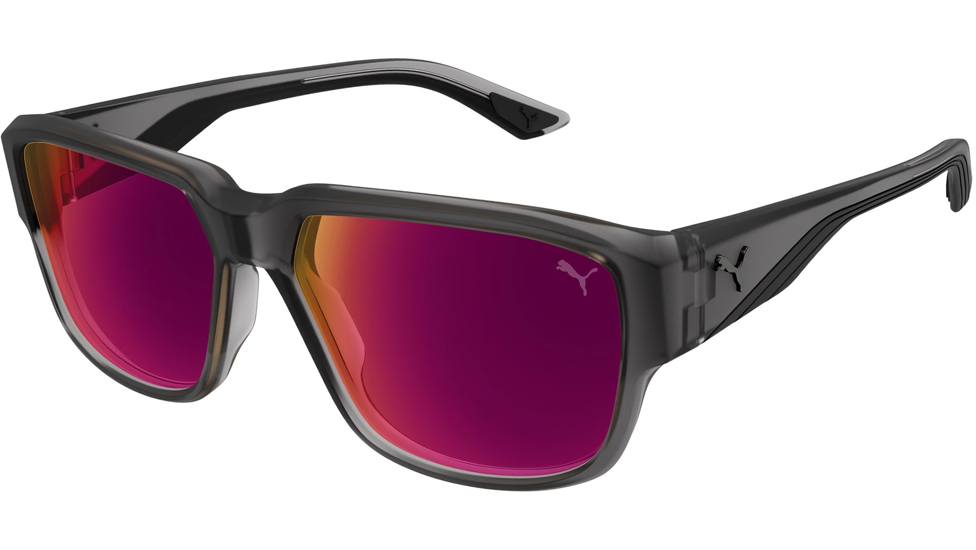 Puma Sport line sunglasses model PU0445S, rectangle injection frame, color code 003 featuring matte transparent dark grey front with grey temple and solid green base + ml infrared lenses. Authorized Puma online reseller. Your glasses will come with the original case and accessories and will be covered by a 12-month global warranty.