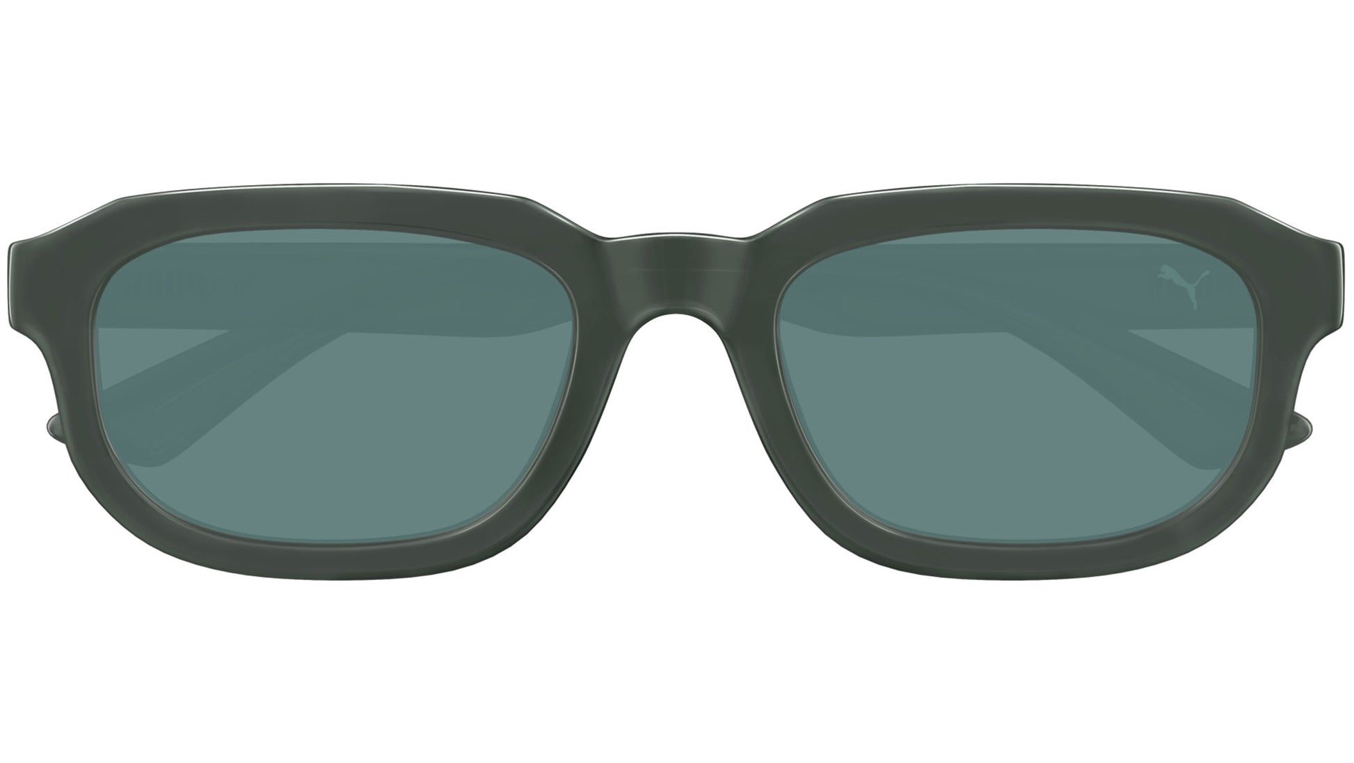 Puma Essential line sunglasses model PU0463S, rectangle injection frame, color code 004 featuring shiny transparent dark grey front with grey temple and solid teal lenses. Authorized Puma online reseller. Your glasses will come with the original case and accessories and will be covered by a 12-month global warranty.