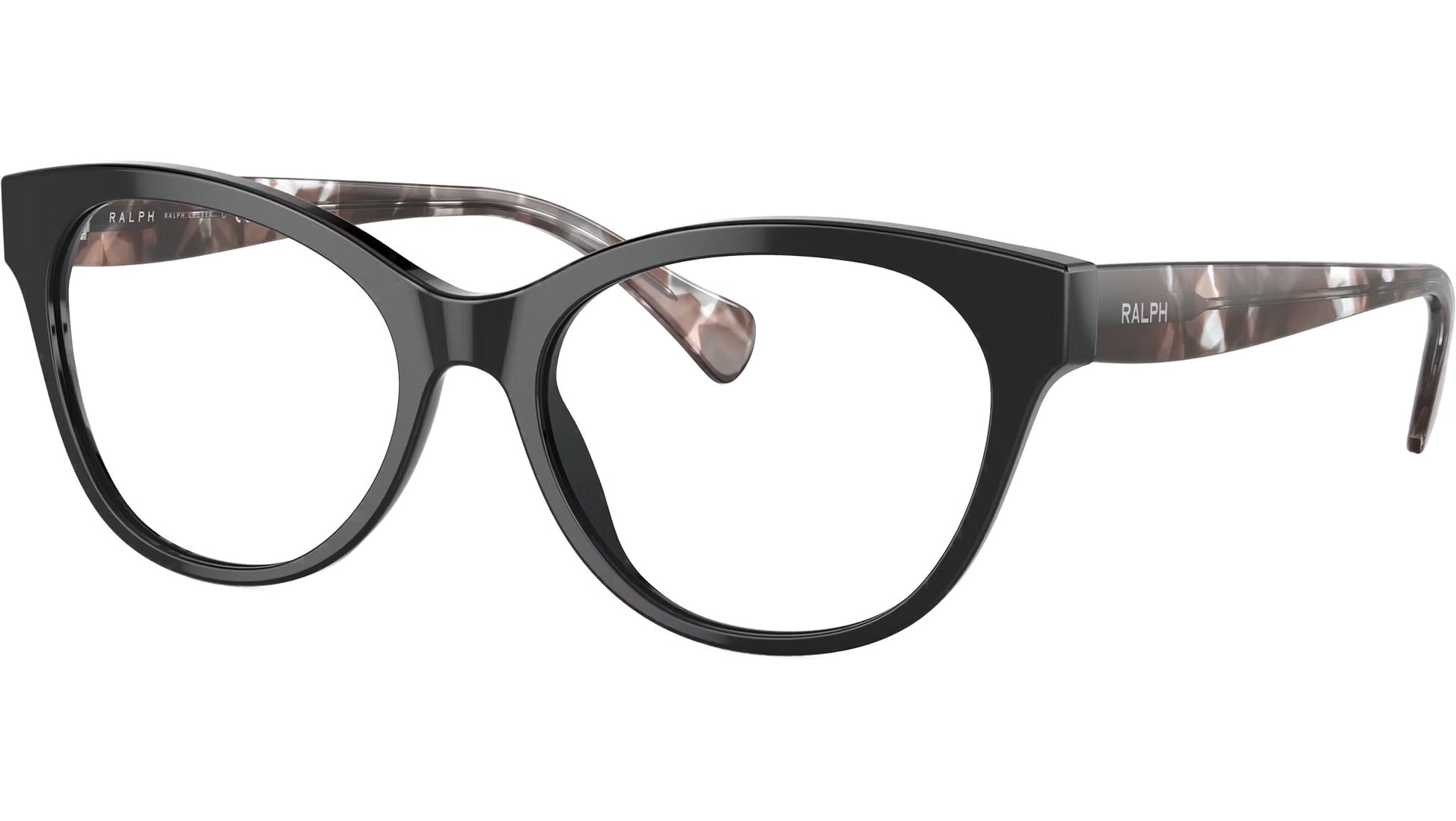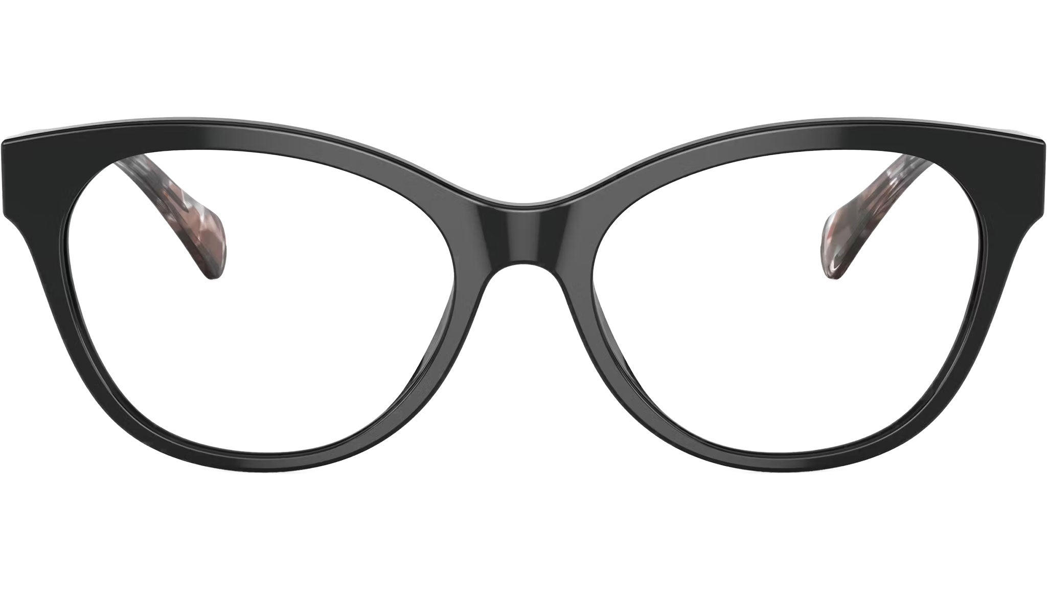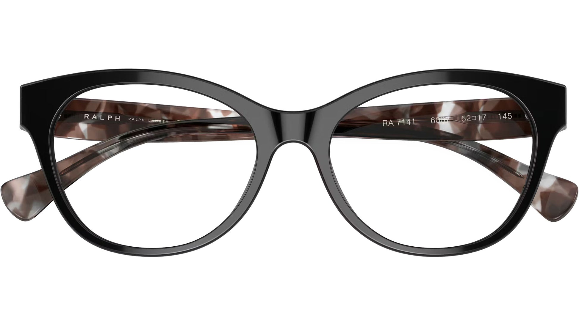 Ralph RA7141 6007 glasses, featuring shiny black cat eye acetate frame and demo lenses. High bridge fit. Brand line: Modern. Style code: 0RA7141. Color code: 6007. Authorized Ralph online reseller. Your glasses will include the original case and accessories and are covered by a 12-month global warranty.